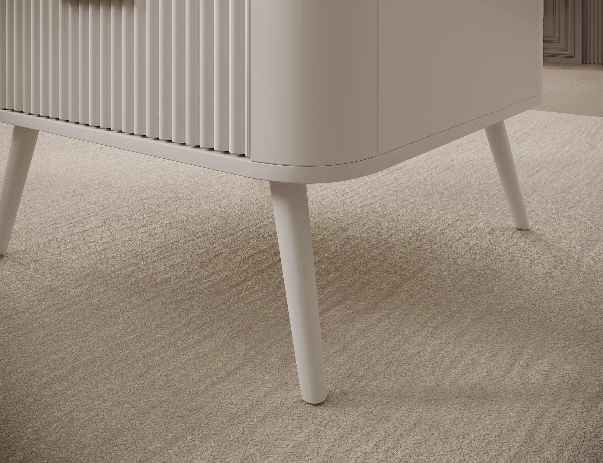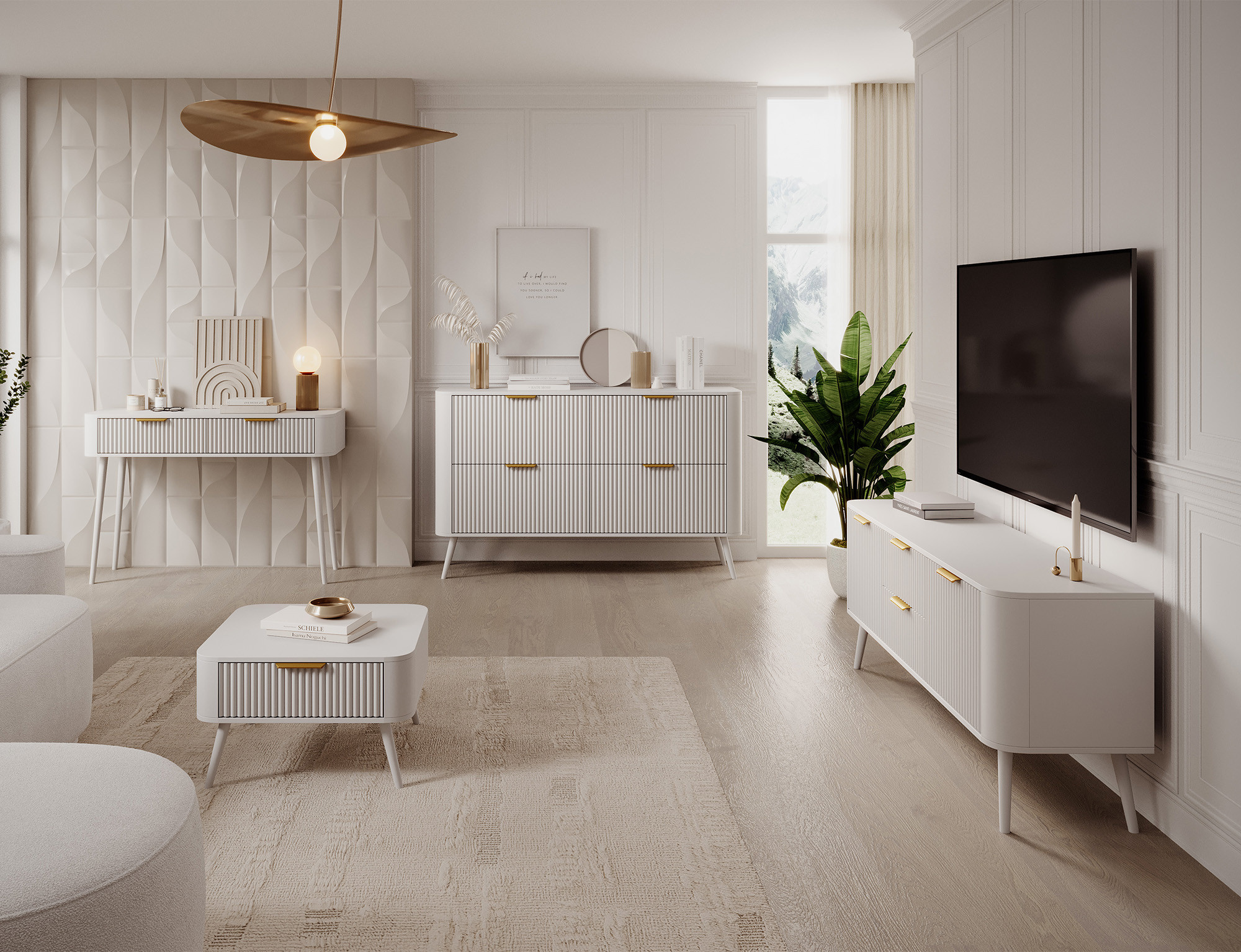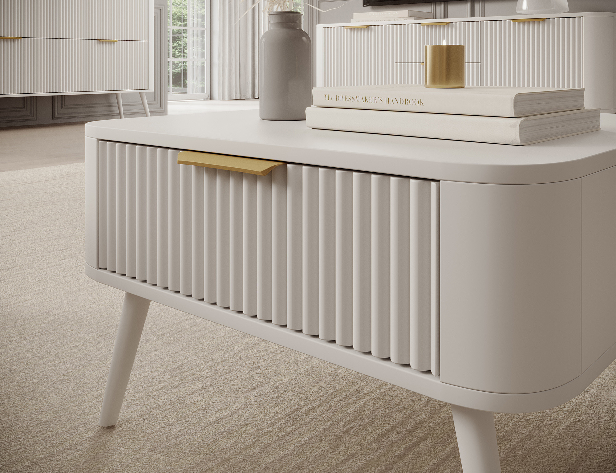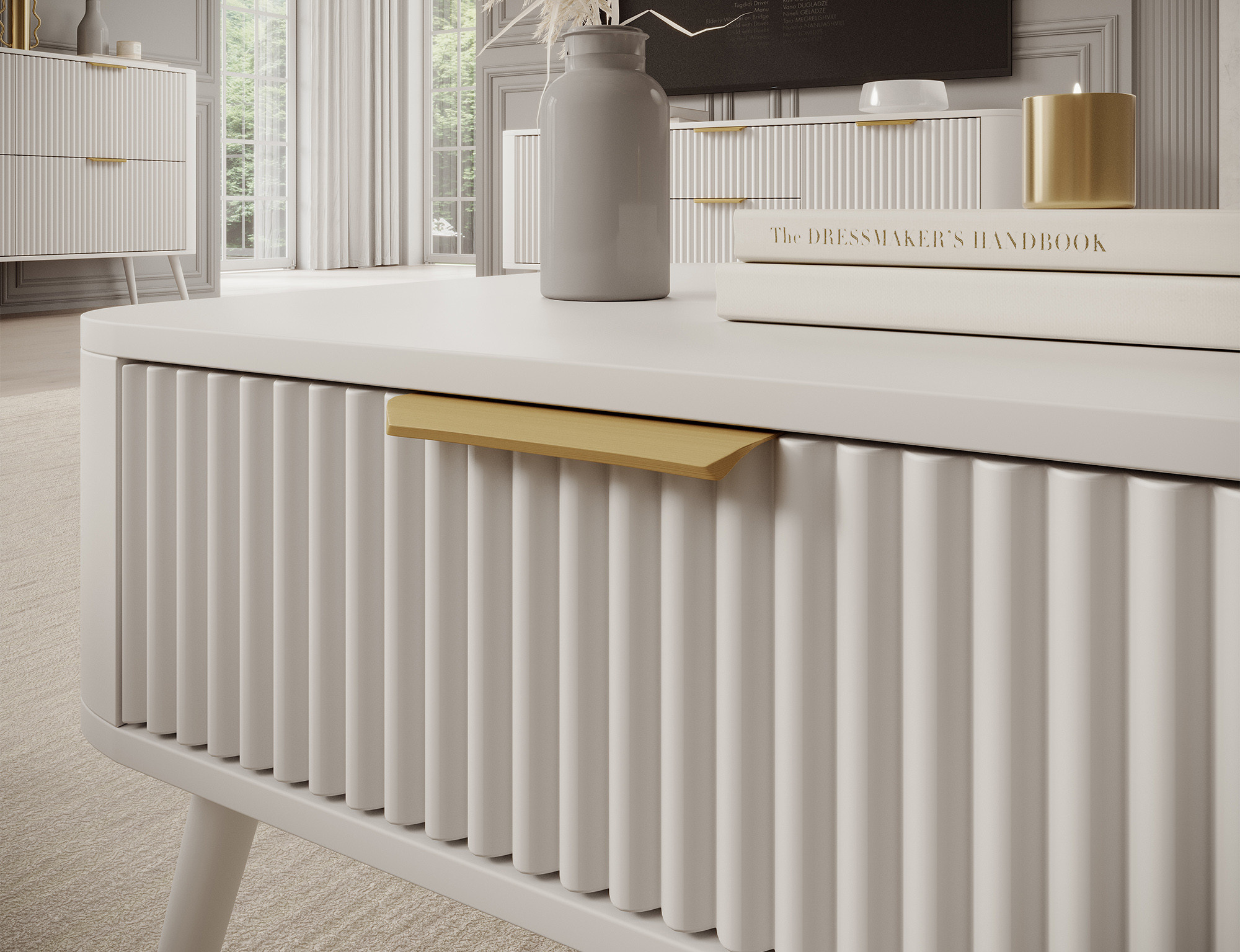 Konferenční stolek Chavelle (67x40x67 cm) je moderní kus, který kombinuje eleganci s funkčností a dokonale doplňuje moderní uspořádání obývacího pokoje. Přední část stolu je vyrobena z odolného MDF s esteticky příjemným ABS okrajem a žebrovaným povrchem, který dodává kusu jedinečný charakter. Laminované dřevotřískové tělo zajišťuje odolnost a rezistenci vůči každodennímu používání. Stůl obsahuje jednu praktickou zásuvku na kolejnici, která umožňuje plynulé a tiché otevírání. 20 cm vysoké bílé dřevěné nohy dodávají pocit lehkosti a moderní vzhled, zatímco zlatá kovová rukojeť přidává rafinovaný stylistický akcent. Konferenční stolek Chavelle je vynikající volbou pro ty, kteří ocení sofistikovaný design a uživatelský komfort ve stylových interiérech.