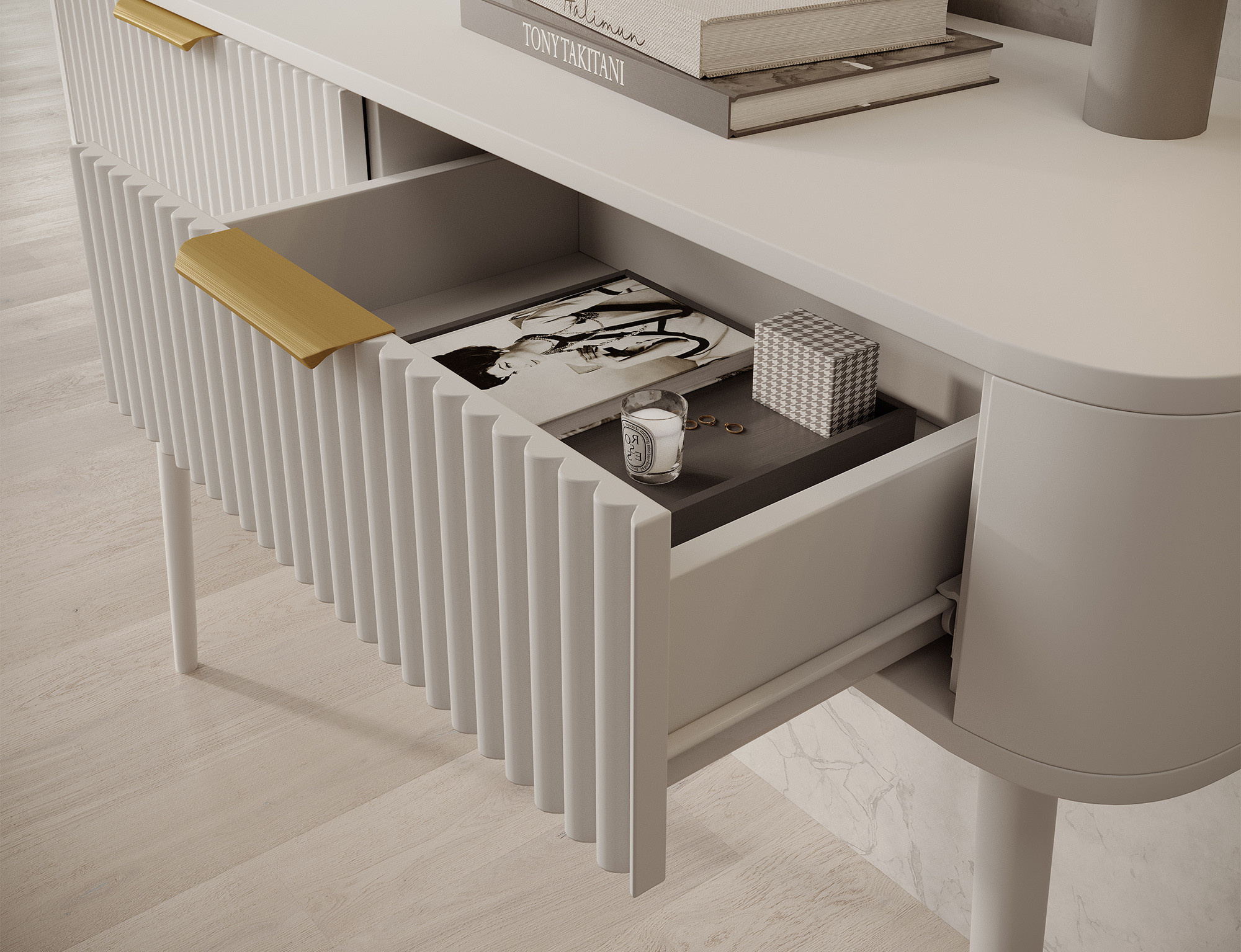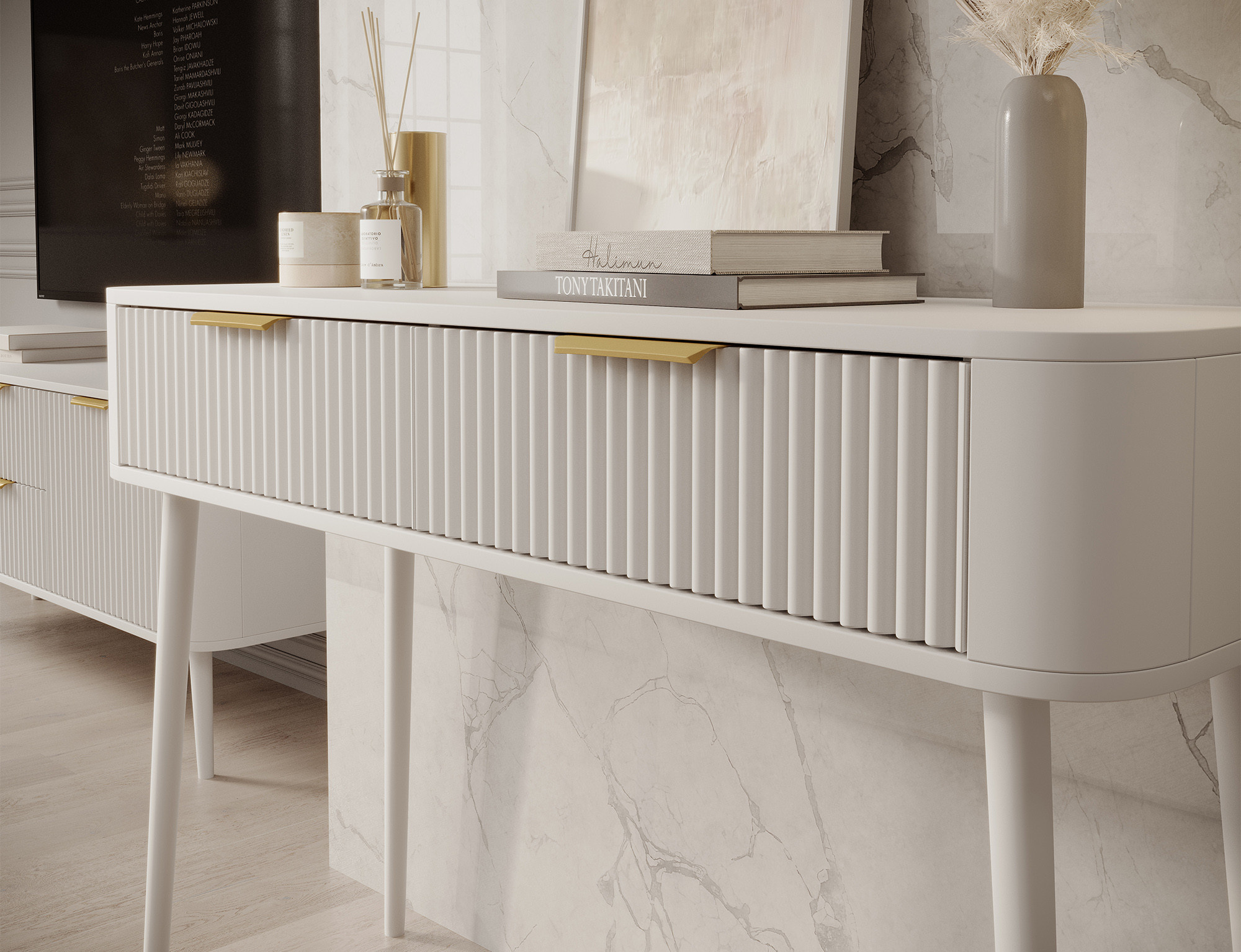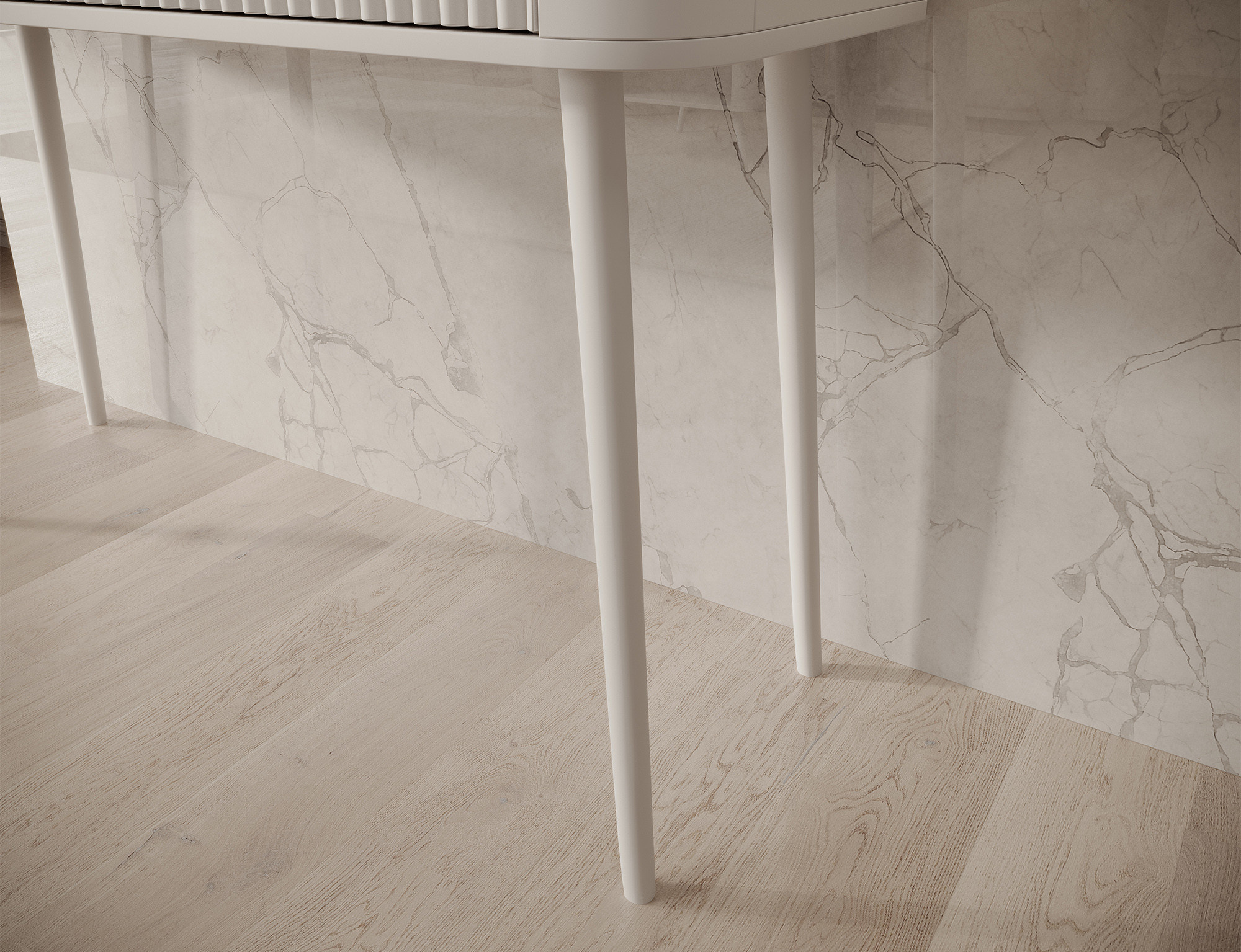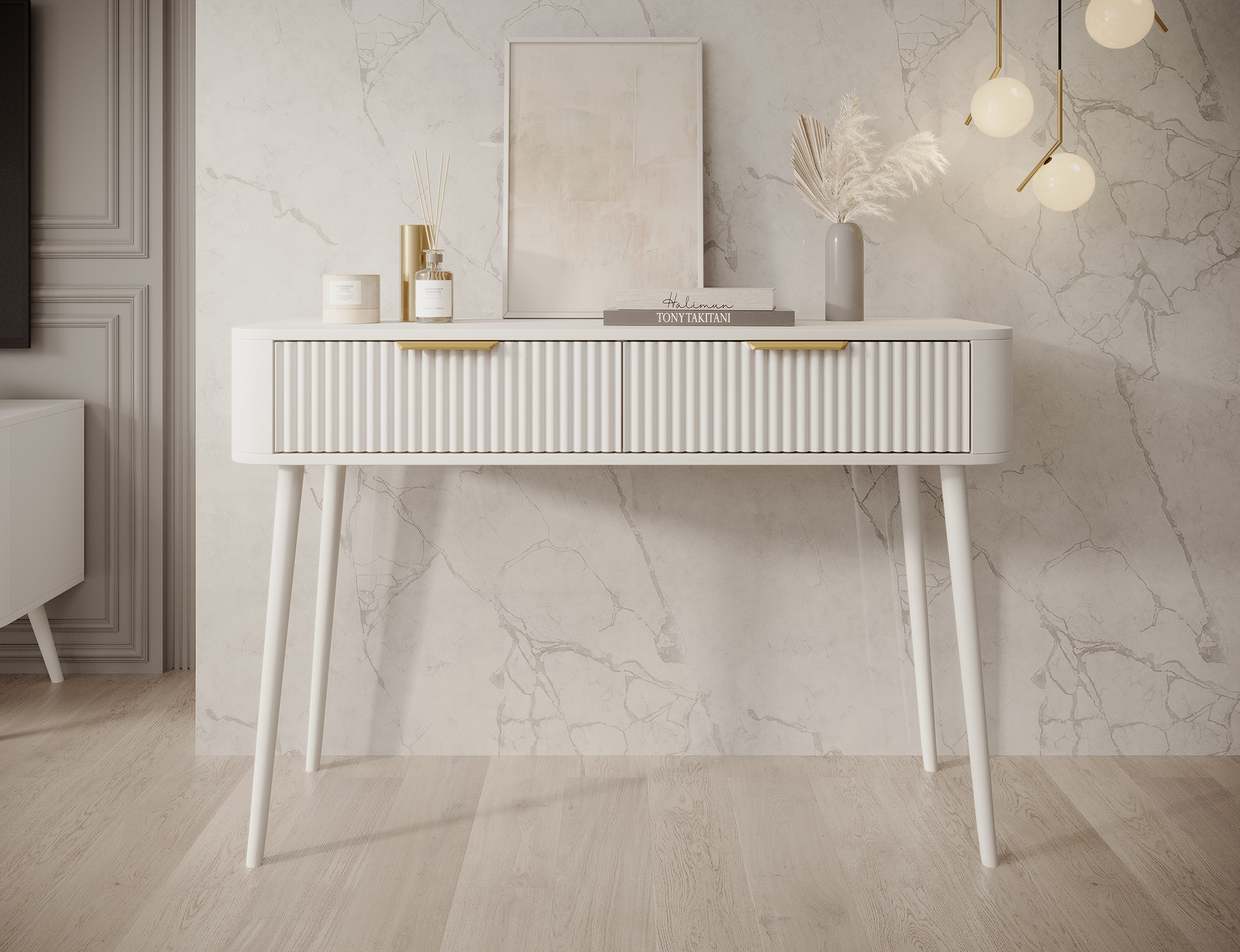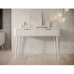 Toaletní stolek Chavelle (120x80x40 cm) je stylový a funkční kus nábytku v moderním designu, ideální do ložnice nebo šatny. Přední část je vyrobena z odolného MDF s ABS hranami a drážkovaným vzorem, což stolu dodává vytříbený charakter a stylový vzhled. Tělo, vyrobené z laminované dřevotřísky, zajišťuje pevnost a odolnost vůči každodennímu opotřebení. Jednotka je vybavena dvěma praktickými zásuvkami na válečkových pojezdech pro hladký a tichý provoz. Vysoké bílé dřevěné nohy (60 cm) dodávají eleganci a usnadňují používání, zatímco zlaté kovové úchyty zdůrazňují moderní styl stolu. Toaletní stolek Chavelle kombinuje nadčasový design, funkčnost a vysoce kvalitní provedení, což z něj činí ideální doplněk pro moderní interiéry.