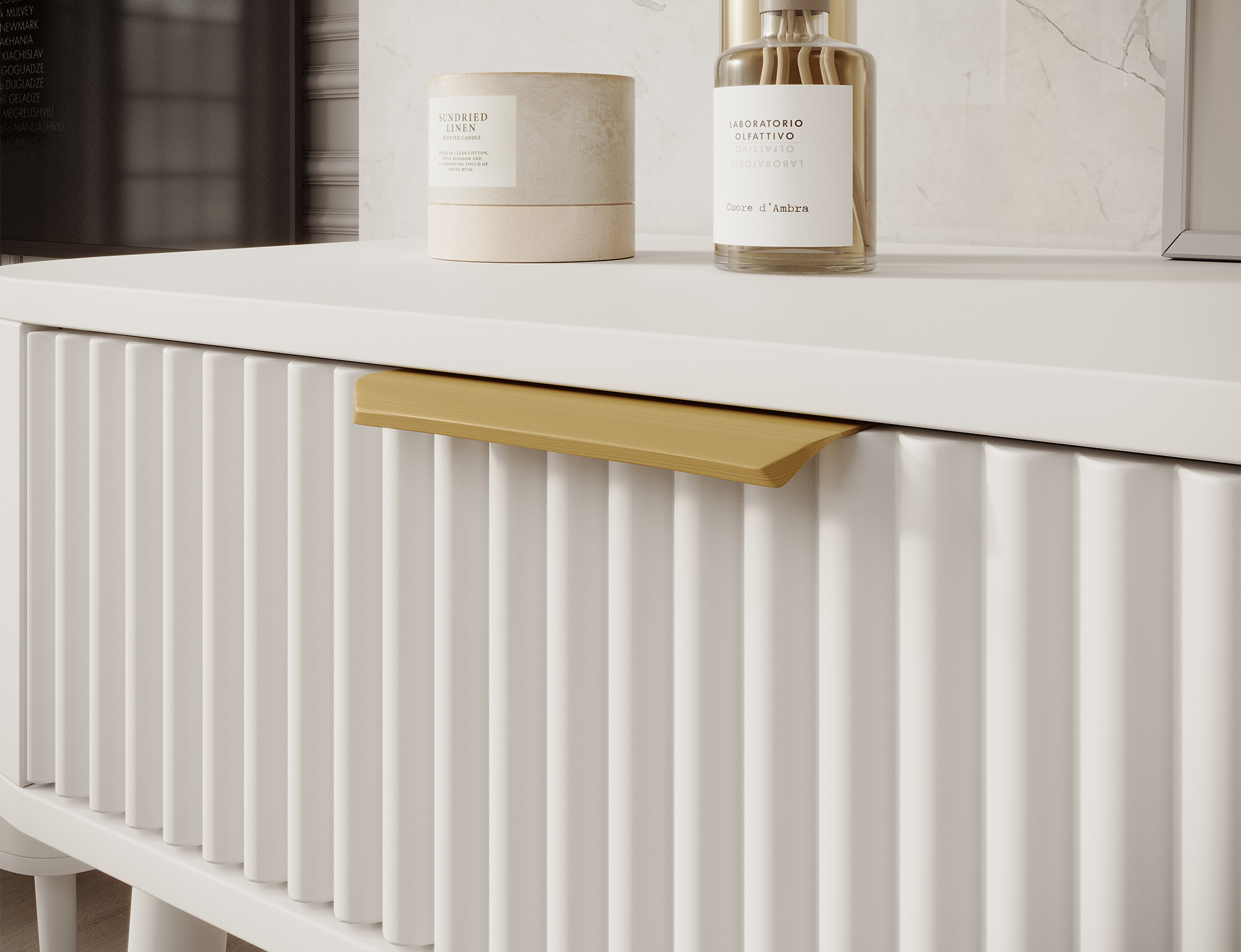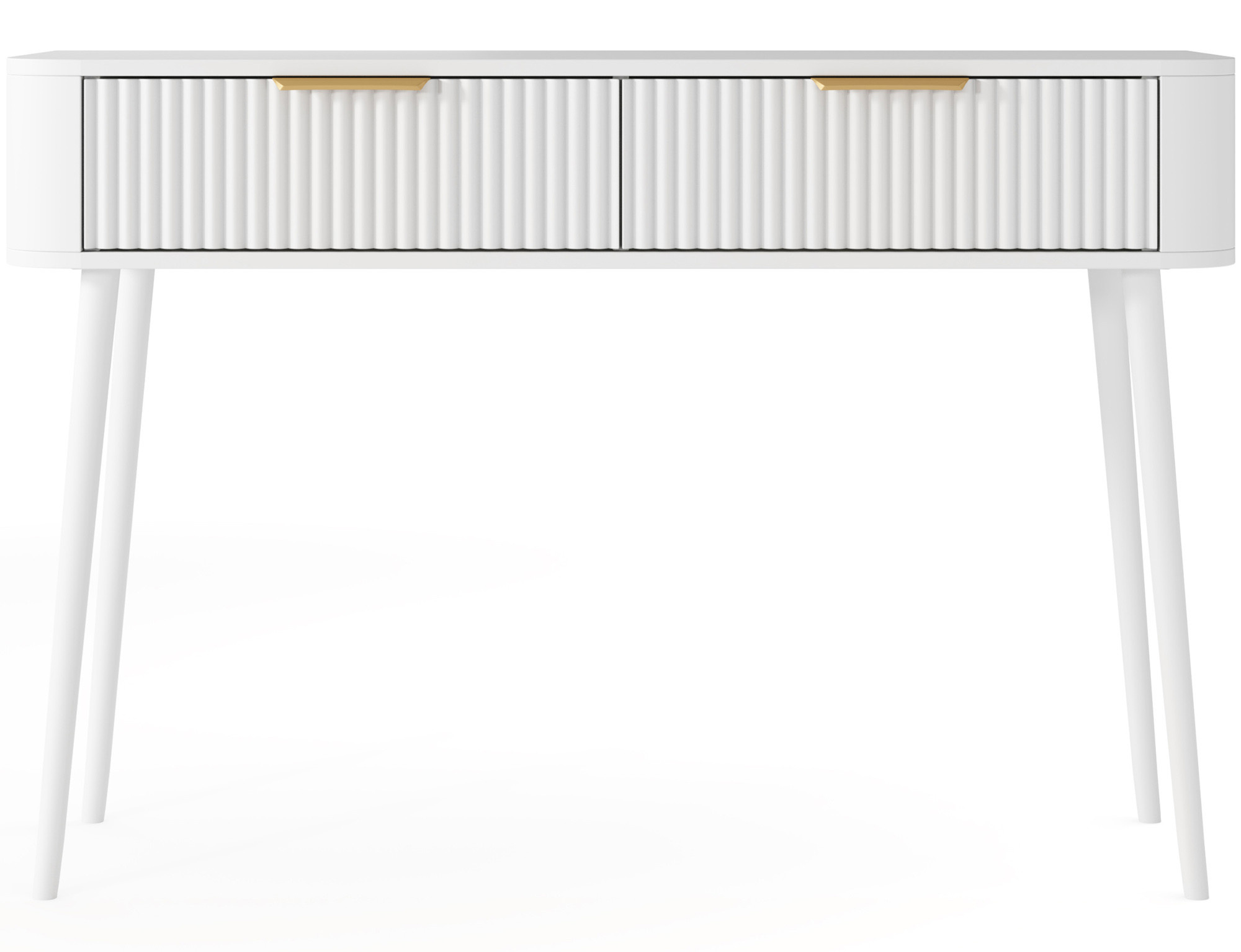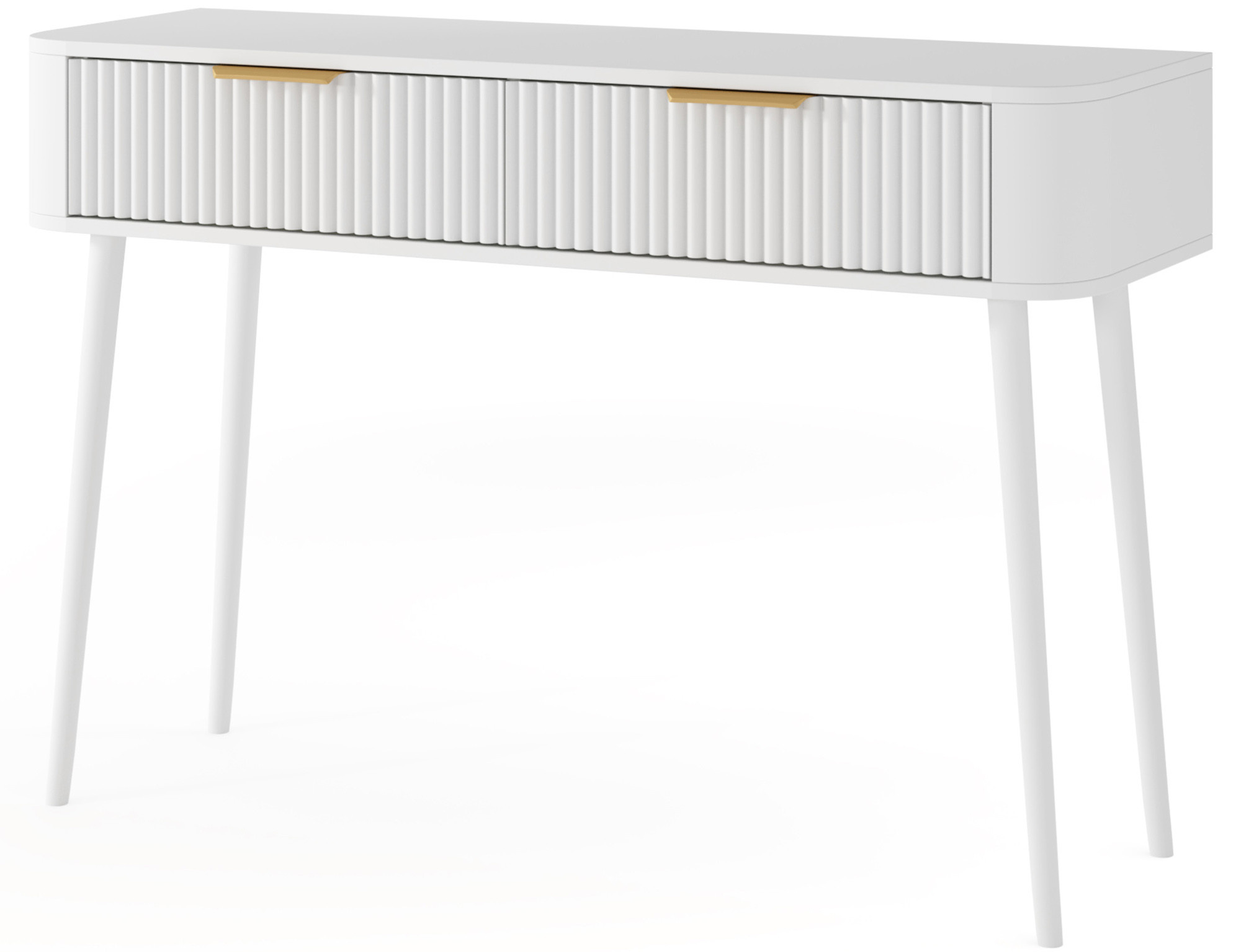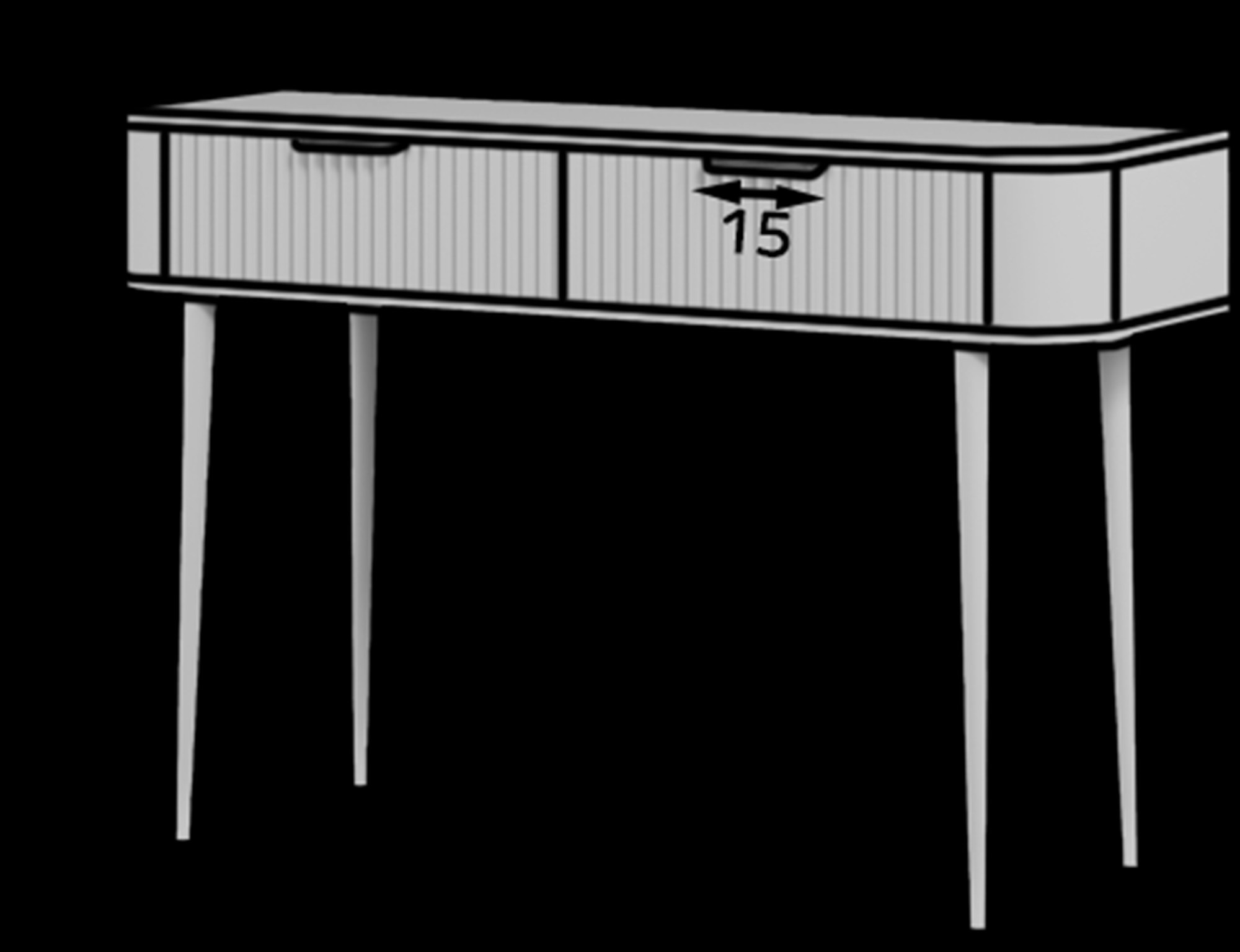 Toaletní stolek Chavelle (120x80x40 cm) je stylový a funkční kus nábytku v moderním designu, ideální do ložnice nebo šatny. Přední část je vyrobena z odolného MDF s ABS hranami a drážkovaným vzorem, což stolu dodává vytříbený charakter a stylový vzhled. Tělo, vyrobené z laminované dřevotřísky, zajišťuje pevnost a odolnost vůči každodennímu opotřebení. Jednotka je vybavena dvěma praktickými zásuvkami na válečkových pojezdech pro hladký a tichý provoz. Vysoké bílé dřevěné nohy (60 cm) dodávají eleganci a usnadňují používání, zatímco zlaté kovové úchyty zdůrazňují moderní styl stolu. Toaletní stolek Chavelle kombinuje nadčasový design, funkčnost a vysoce kvalitní provedení, což z něj činí ideální doplněk pro moderní interiéry.