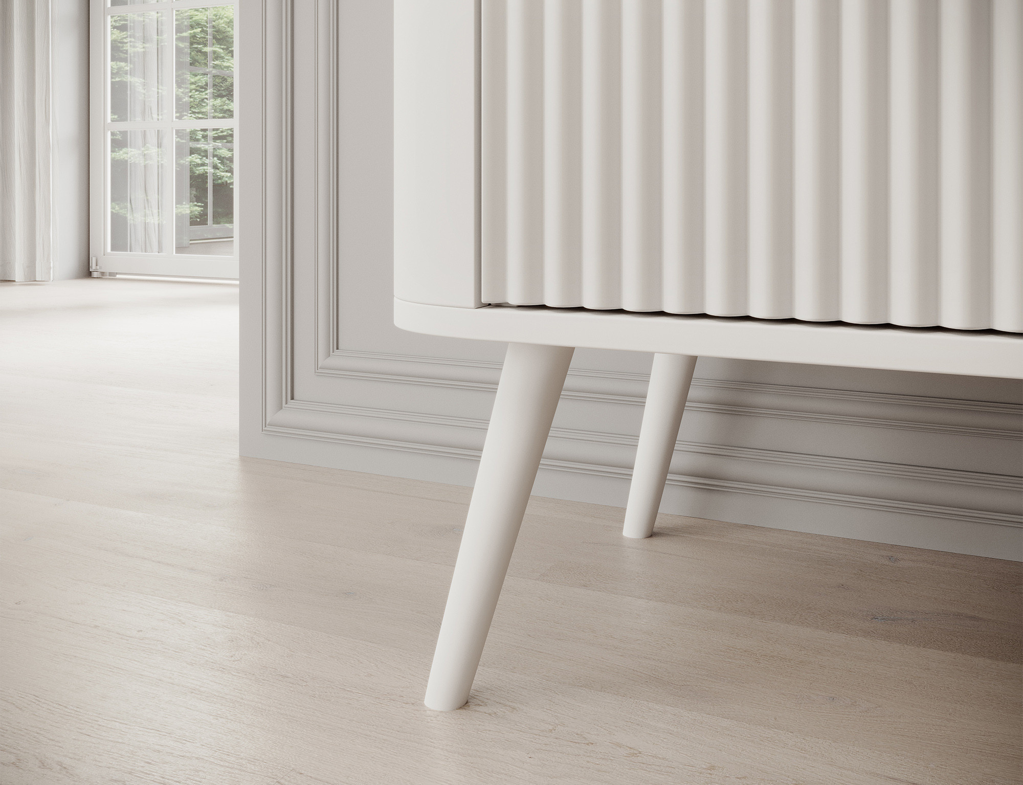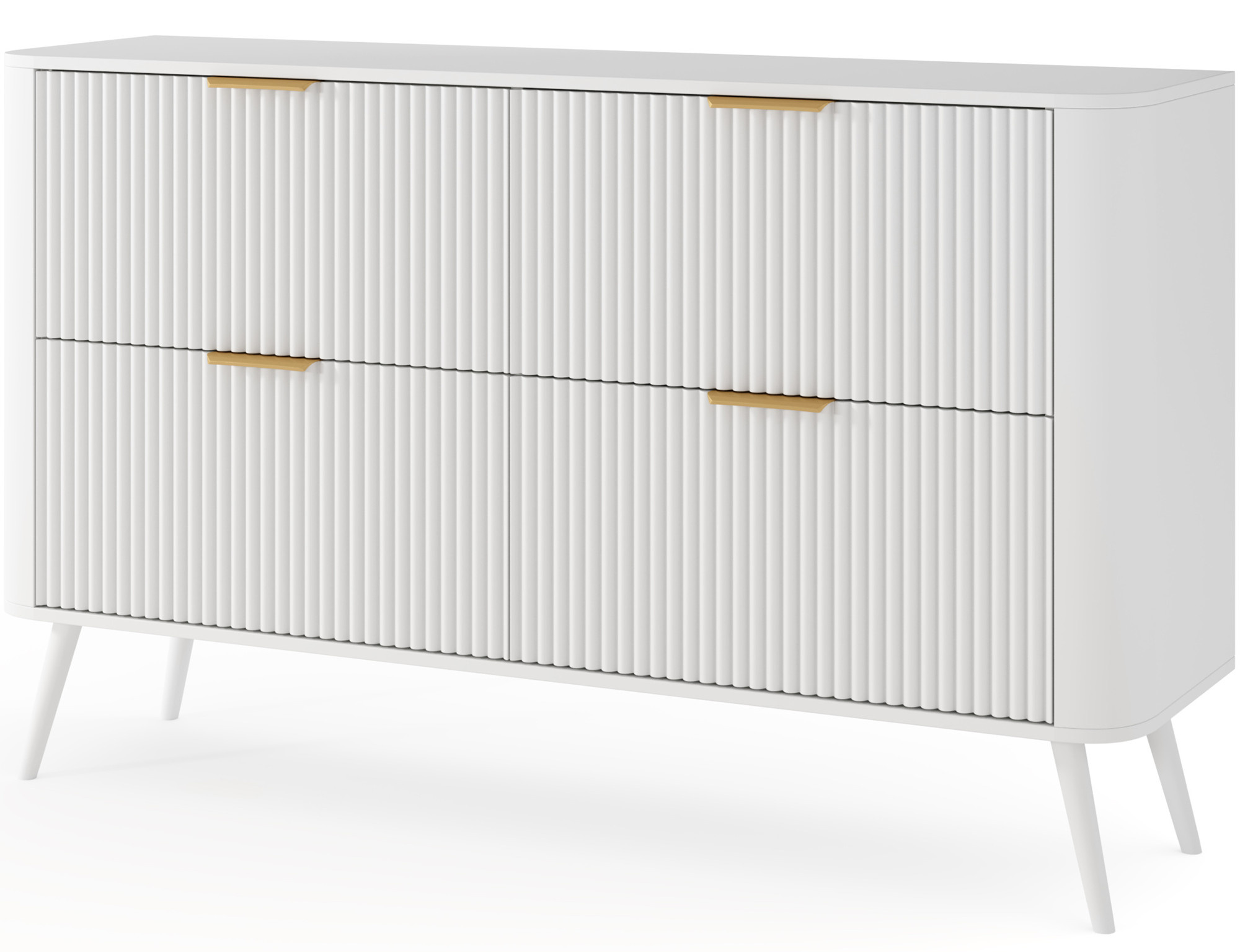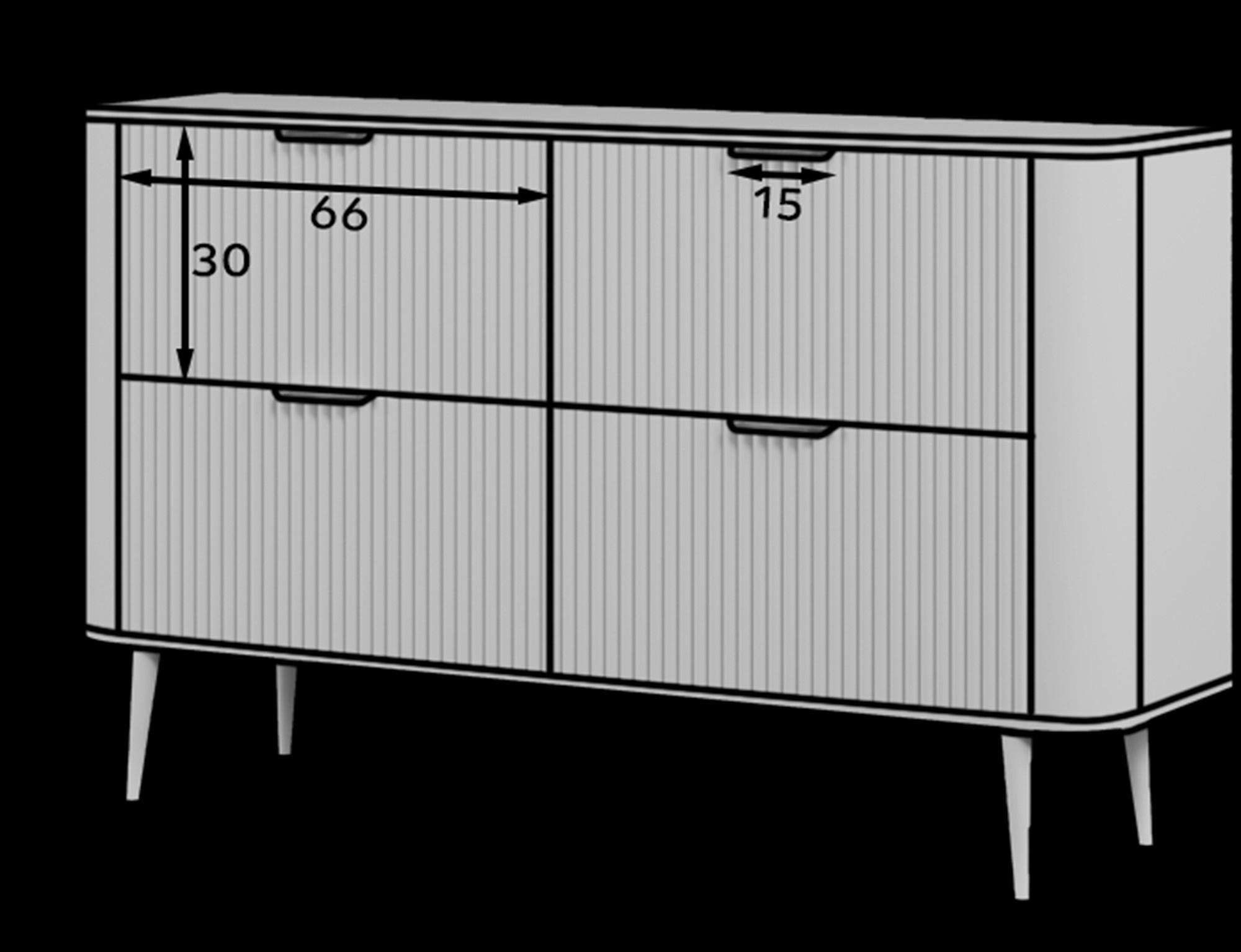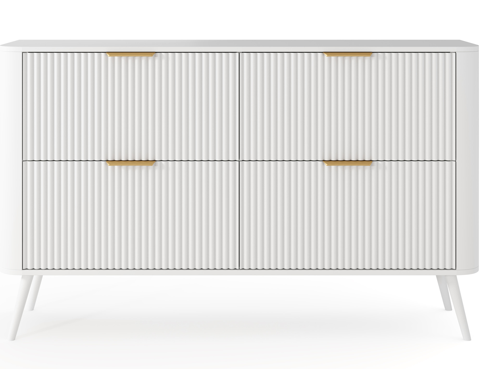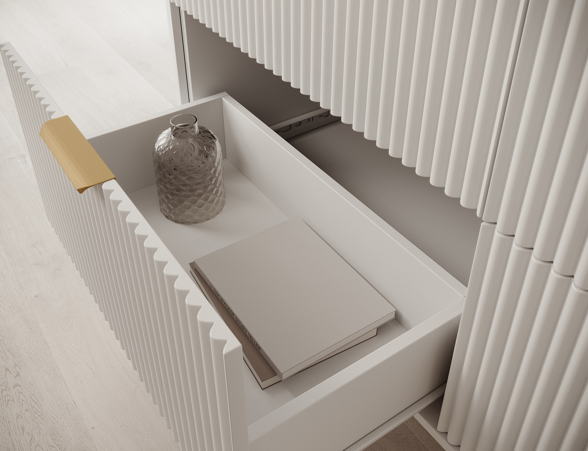 Chavelle Sideboard (150x90x40 cm) je elegantní kus nábytku v moderním stylu, ideální pro obývací pokoj, ložnici nebo chodbu. Přední část je vyrobena z odolné MDF desky zakončené ABS hranou, s výrazným žebrovaným vzorem, který zdůrazňuje jedinečný charakter tohoto kusu. Tělo, vyrobené z laminované dřevotřísky, zajišťuje jak stabilitu, tak lehkou konstrukci. Příborník obsahuje čtyři prostorné zásuvky na kolečkových pojezdech pro plynulý a tichý provoz. 20 cm vysoké bílé dřevěné nohy dodávají jednotce pocit lehkosti a usnadňují úklid pod ní, zatímco zlaté kovové úchyty přidávají nádech elegance. Pro větší bezpečnost lze příborník připevnit ke zdi. Chavelle příborník je kombinací funkčnosti a estetiky, což z něj činí skvělou volbu pro moderní interiéry.
