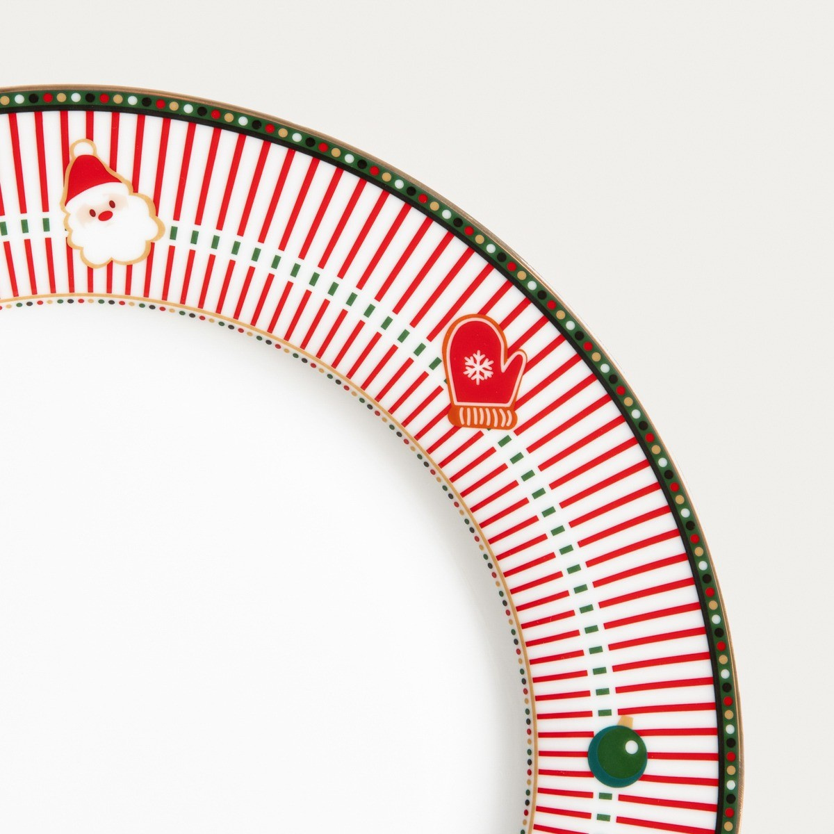 Porcelánový talíř má půvabný design s pruhy a oblíbenými vánočními motivy - najdete na něm vánoční stromeček, Santa Clause, cukrovou hůlku nebo baňky. Není to jen praktická nádoba na servírování jídla, ale také krásná dekorace na vašem stolním nádobí.