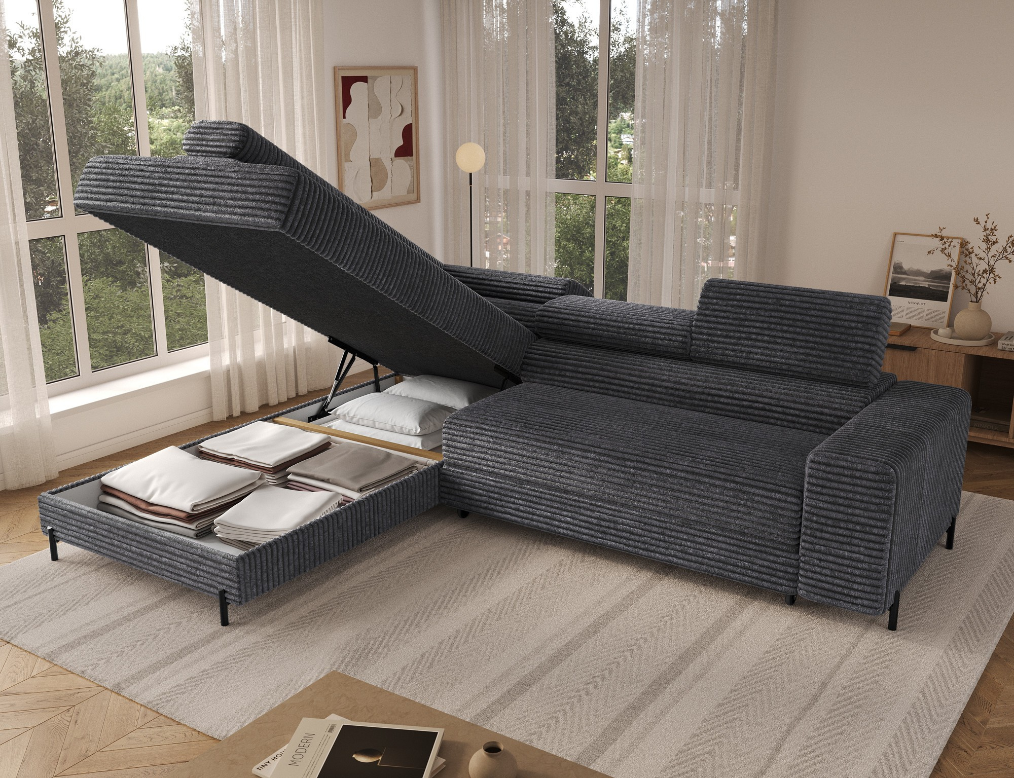 Tato sedací souprava je nejen krásná, ale také velmi praktická. Disponuje úložným prostorem, který vám umožní snadno uschovat deky, polštáře nebo jiné drobnosti, které chcete mít po ruce, ale zároveň je mít úhledně uklizené. Díky tomu bude váš obývací pokoj vždy vypadat upraveně a organizovaně.