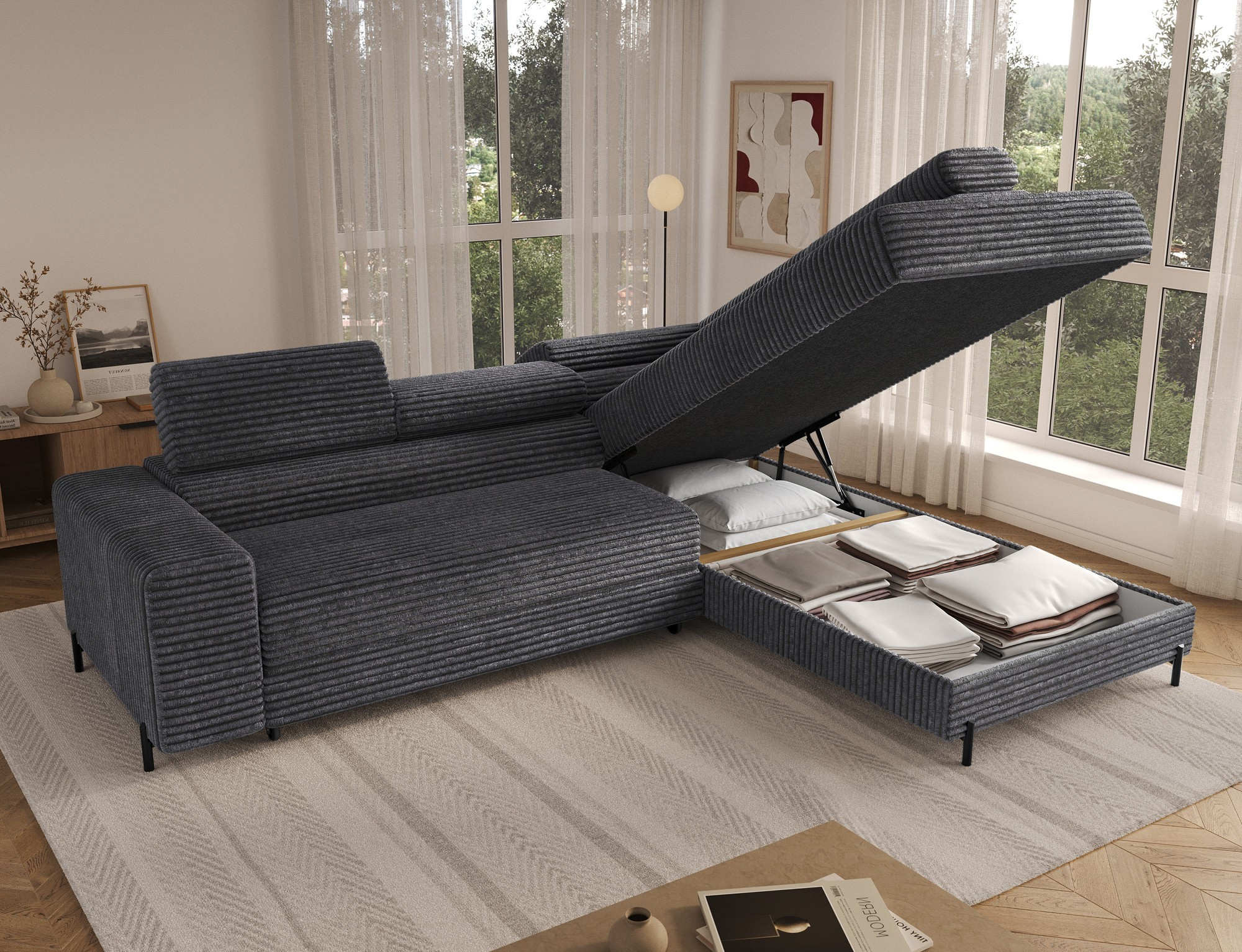 Tato sedací souprava je nejen krásná, ale také velmi praktická. Disponuje úložným prostorem, který vám umožní snadno uschovat deky, polštáře nebo jiné drobnosti, které chcete mít po ruce, ale zároveň je mít úhledně uklizené. Díky tomu bude váš obývací pokoj vždy vypadat upraveně a organizovaně.