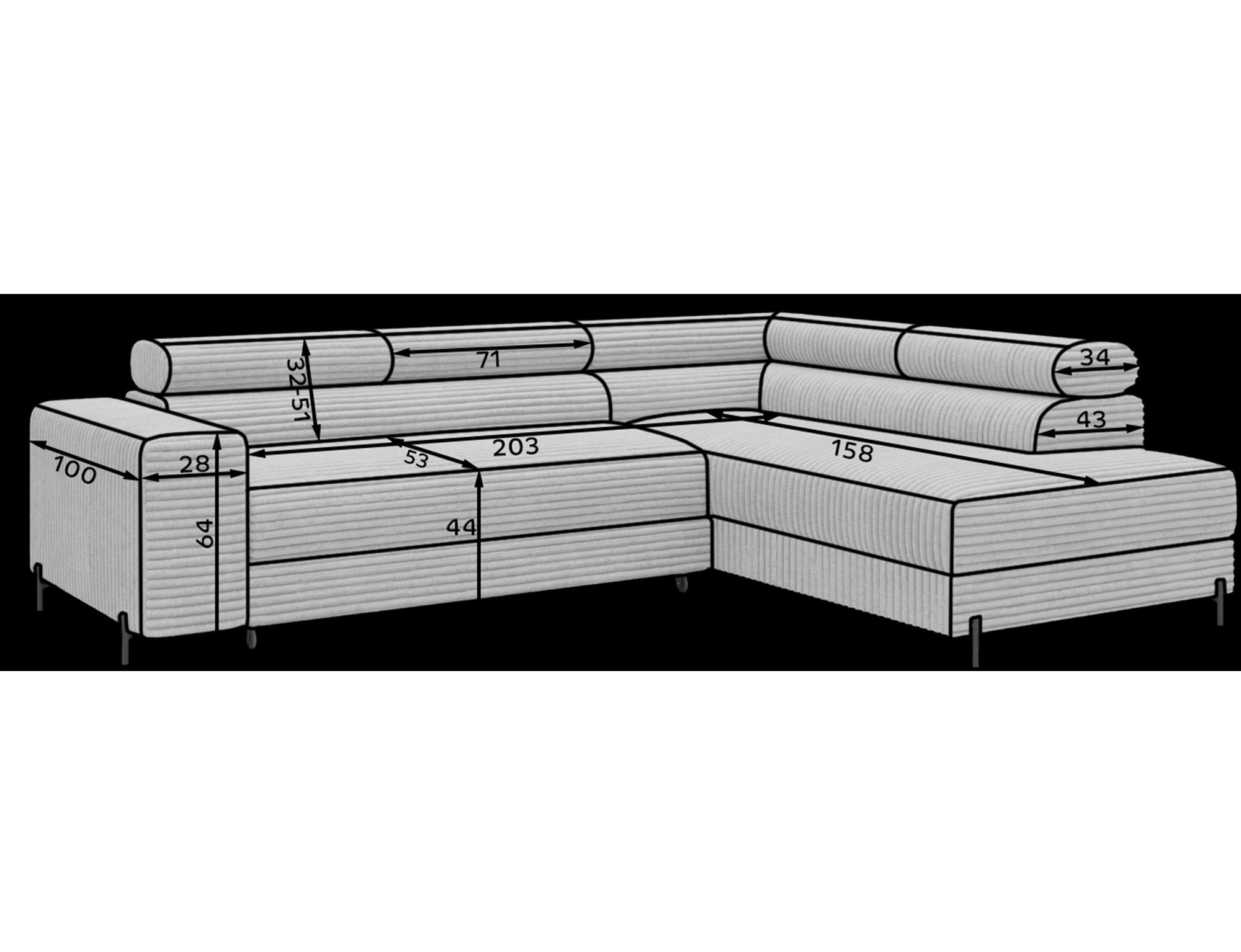 Další výhodou je možnost rozkládání, která promění sedací soupravu v pohodlné lůžko o rozměrech 124 x 203 cm. Tato funkce je ideální pro hosty, kteří u vás zůstanou přes noc, nebo pro chvíle, kdy si chcete dopřát extra pohodlí při sledování oblíbeného filmu.