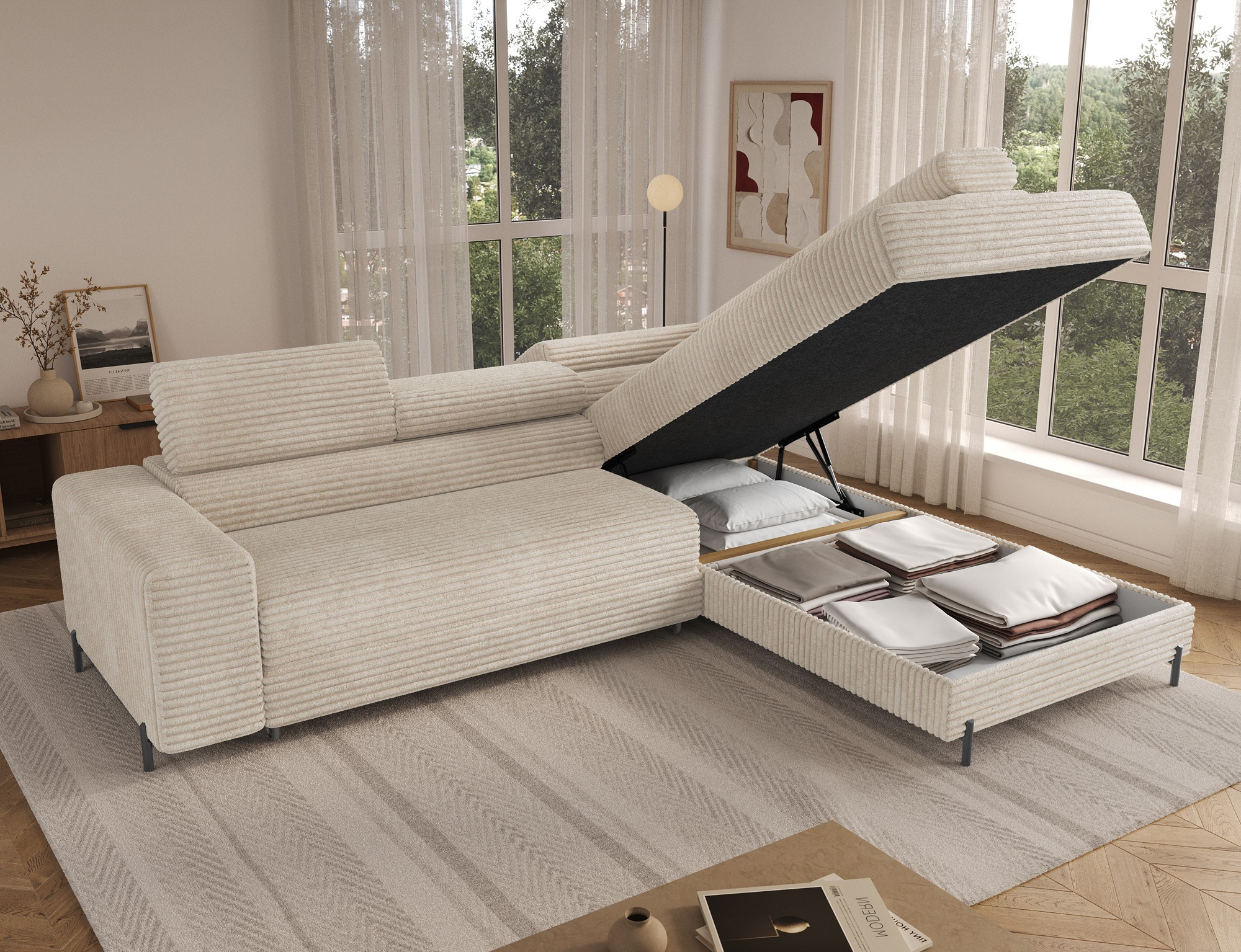 Tato sedací souprava je nejen krásná, ale také velmi praktická. Disponuje úložným prostorem, který vám umožní snadno uschovat deky, polštáře nebo jiné drobnosti, které chcete mít po ruce, ale zároveň je mít úhledně uklizené. Díky tomu bude váš obývací pokoj vždy vypadat upraveně a organizovaně.