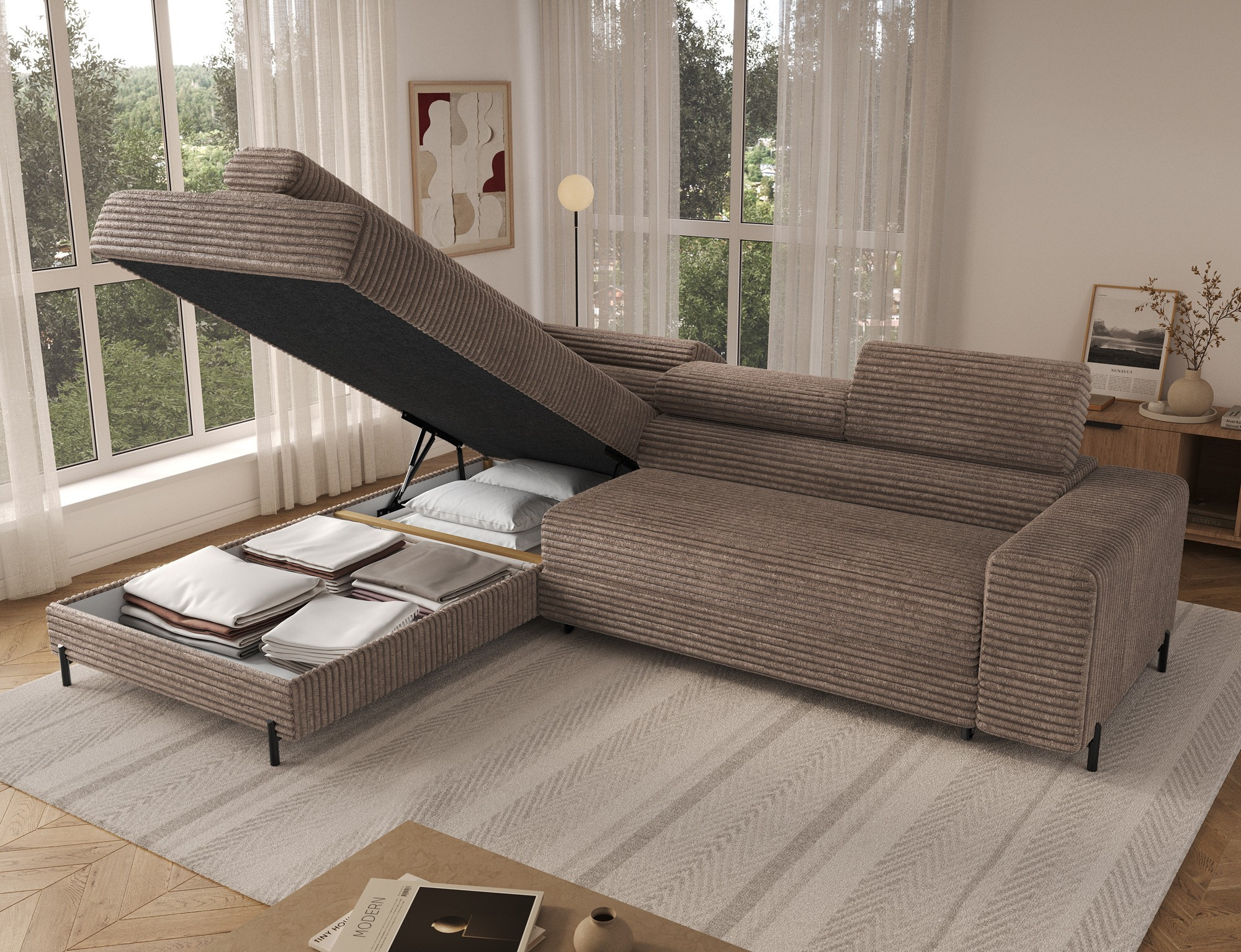 Tato sedací souprava je nejen krásná, ale také velmi praktická. Disponuje úložným prostorem, který vám umožní snadno uschovat deky, polštáře nebo jiné drobnosti, které chcete mít po ruce, ale zároveň je mít úhledně uklizené. Díky tomu bude váš obývací pokoj vždy vypadat upraveně a organizovaně.