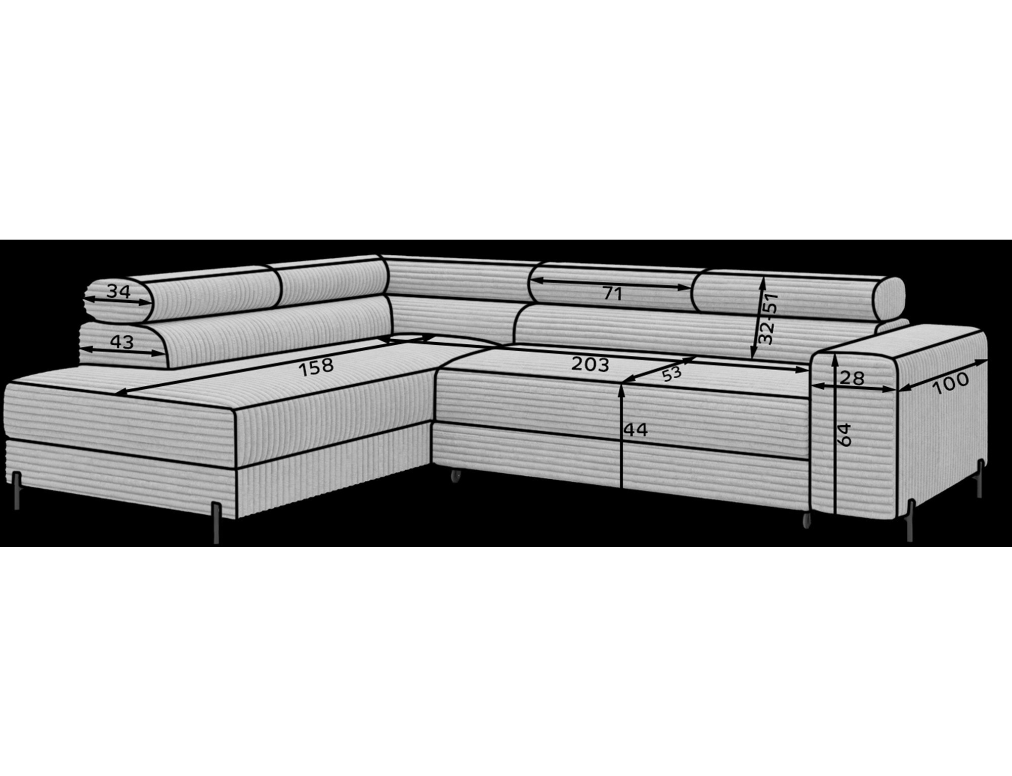 Další výhodou je možnost rozkládání, která promění sedací soupravu v pohodlné lůžko o rozměrech 124 x 203 cm. Tato funkce je ideální pro hosty, kteří u vás zůstanou přes noc, nebo pro chvíle, kdy si chcete dopřát extra pohodlí při sledování oblíbeného filmu.