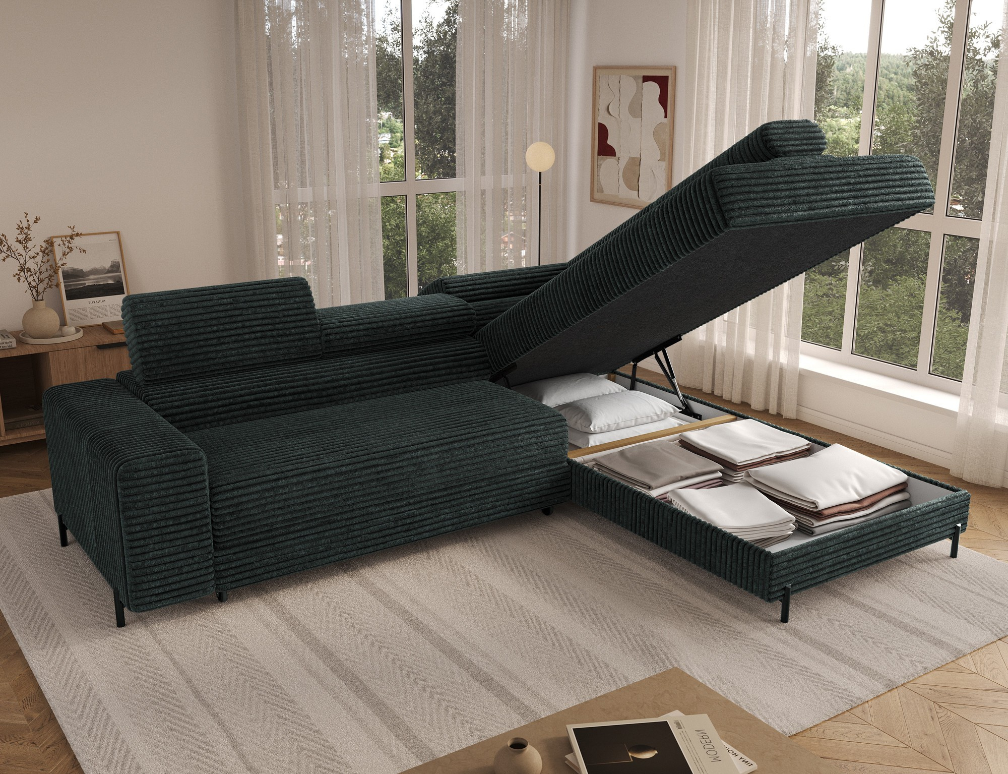 Tato sedací souprava je nejen krásná, ale také velmi praktická. Disponuje úložným prostorem, který vám umožní snadno uschovat deky, polštáře nebo jiné drobnosti, které chcete mít po ruce, ale zároveň je mít úhledně uklizené. Díky tomu bude váš obývací pokoj vždy vypadat upraveně a organizovaně.