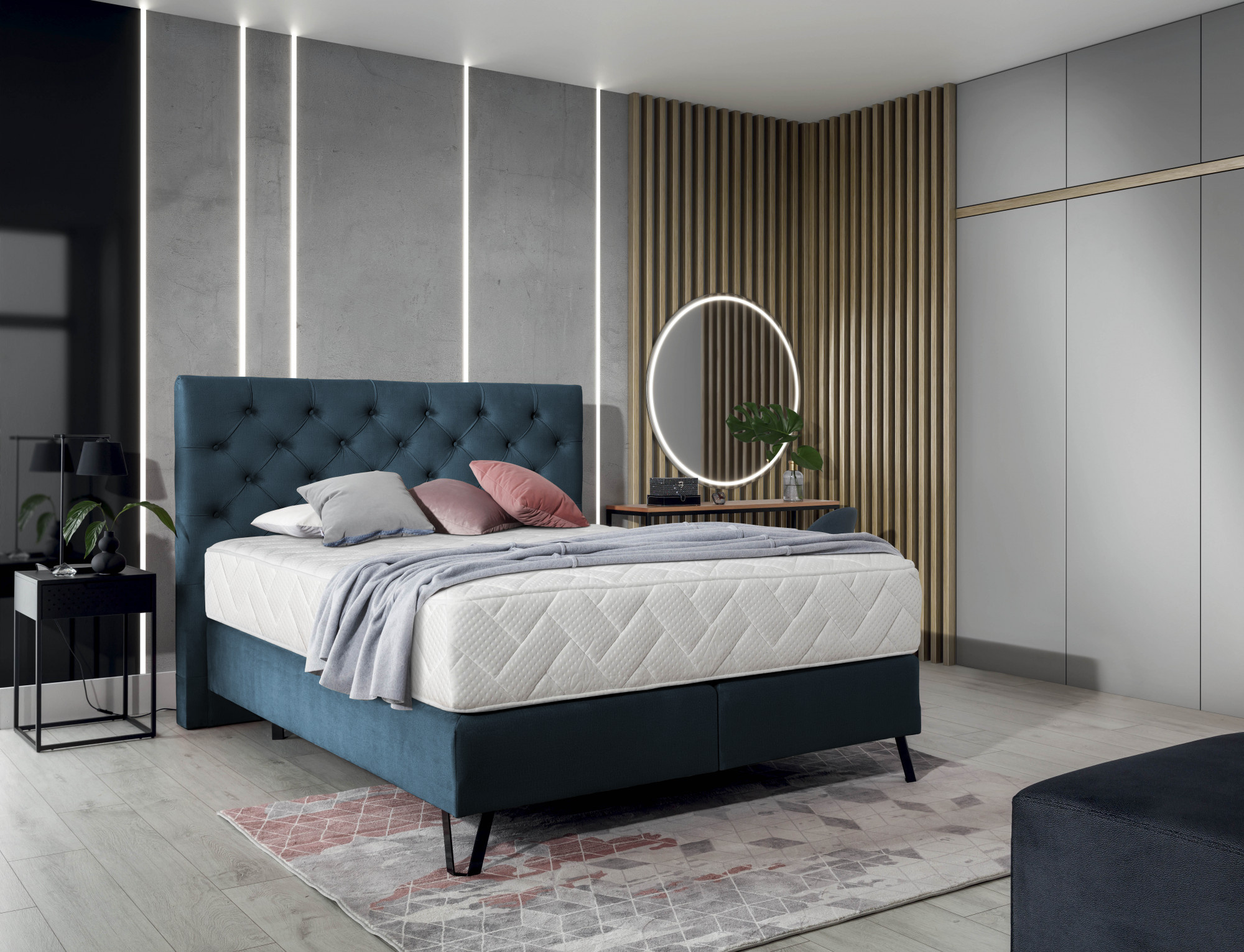 Kontinentální postel Cortina doplní dekor ložnice v nenápadném, minimalistickém stylu. Jedná se o kus nábytku postavený s pevným boxspringem, černými kovovými nohami a ozdobným čelem. Boxspring Cortina je k dispozici ve 3 variantách spací plochy na výběr: 140x200 cm, 160x200 cm, 180x200 cm. Vyplnění opěrky hlavy pěnou poskytuje dodatečnou měkkou oporu pro hlavu. Kromě toho je opěrka hlavy zdobena prošíváním a šitím - dohromady tvoří desítky kosočtverců, což přidává na kouzlu nábytku. Důležitou součástí každé postele je také matrace, a v tomto případě zahrnujeme super pohodlnou matraci. Boxspring Cortina je dodáván s kapsovou matrací, což je produkt s kapsovými pružinami, které zvyšují úroveň pohodlí při odpočinku. Kromě výhod spojených s pohodlnou matrací nezapomeňte, že si můžete také vybrat barvu a texturu čalounické látky z naší rozsáhlé kolekce ELTAP.