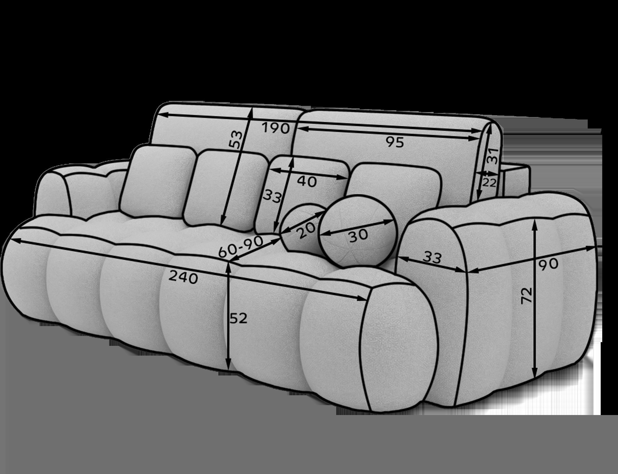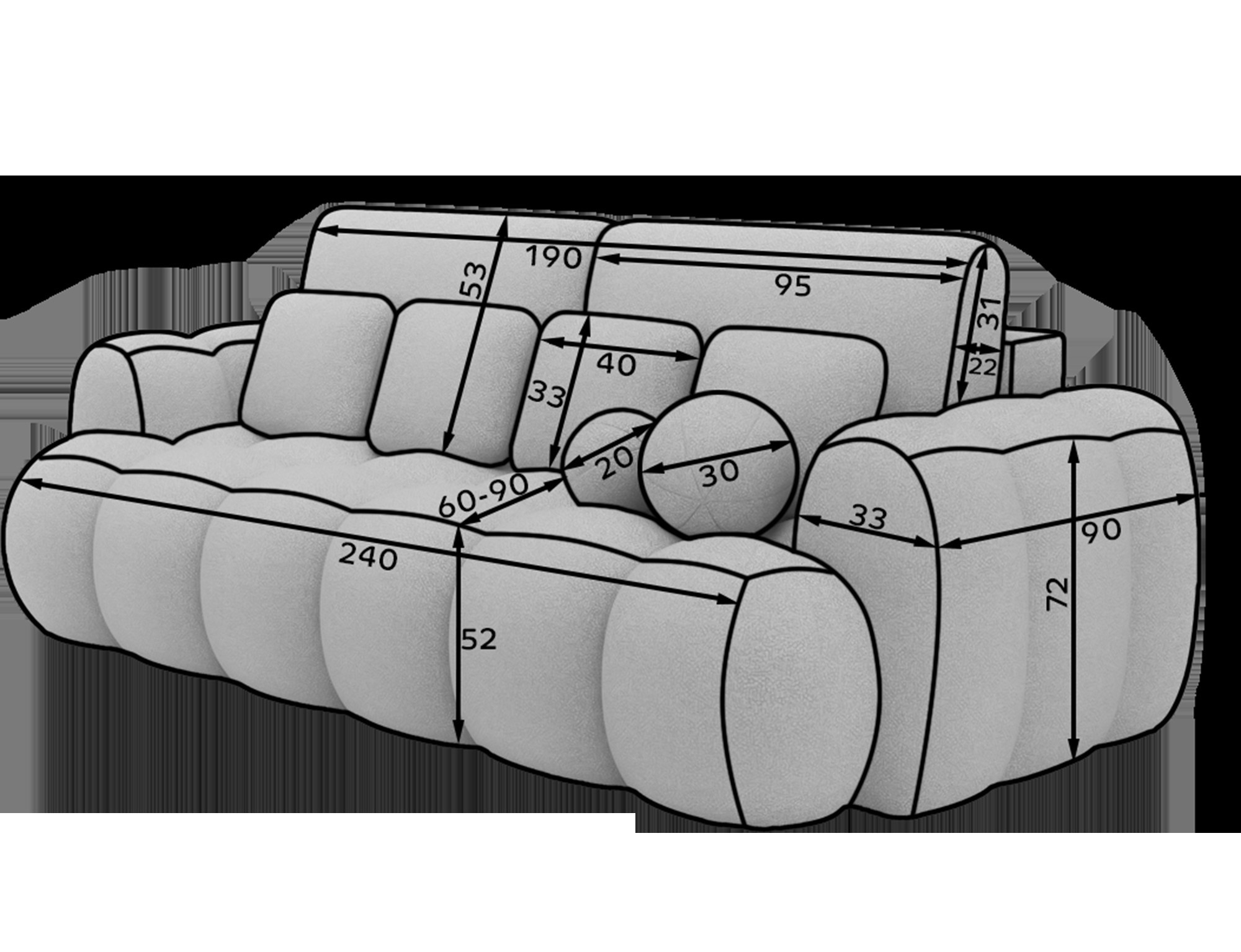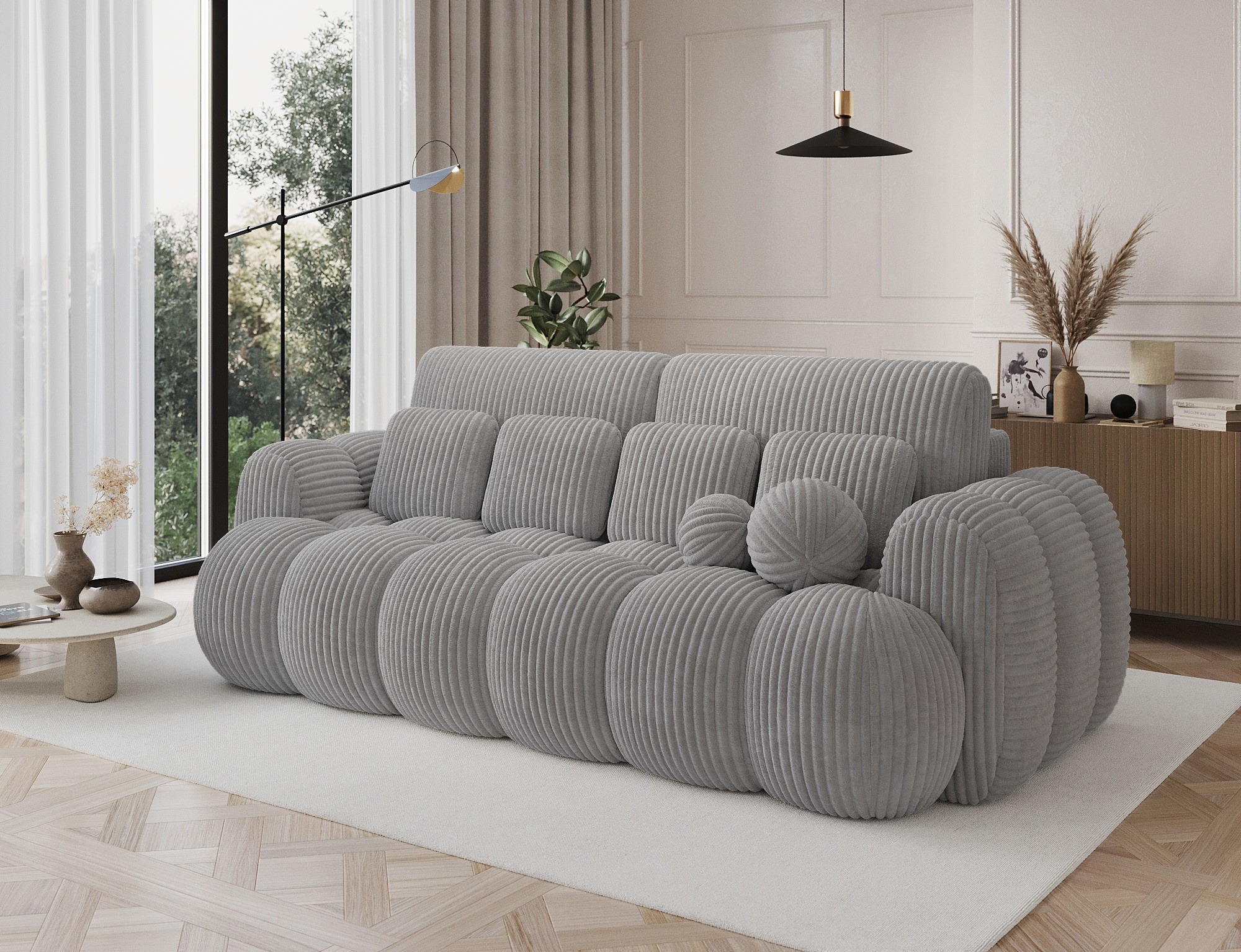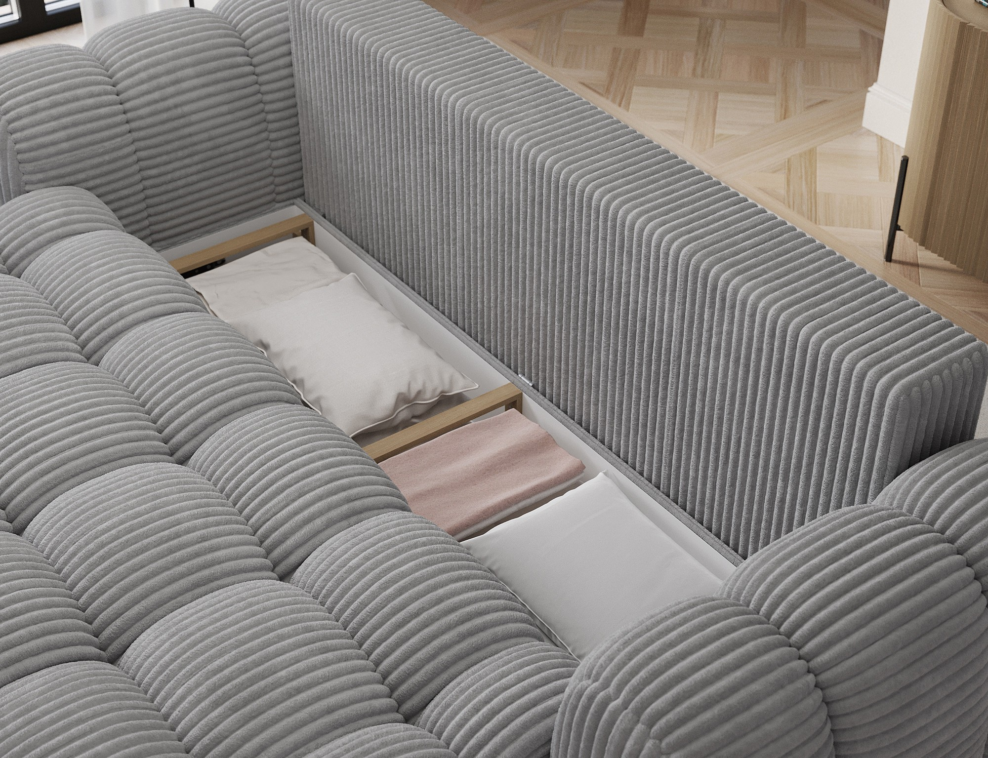 Pohovka Cotonn o rozměrech 256 x 105 x 119 cm je moderní pohovka s funkcí spaní a úložným prostorem na lůžkoviny, která kombinuje elegantní design s výjimečným pohodlím. Sedák je vyplněn vlnovými pružinami typu B, vysoce pružnou pěnou HR3030 a pěnou T2315, což zajišťuje vynikající oporu a pohodlí jak při sezení, tak při každodenním spaní. Díky intuitivnímu mechanismu Dolphin je přeměna pohovky na postel rychlá a snadná, zatímco prostorný úložný prostor na lůžkoviny nabízí praktické úložné místo. Pohovka je vybavena černými nohami z odolného plastu a její čalouněné opěradlo jí umožňuje vypadat skvěle i tehdy, když je umístěna uprostřed místnosti. Dekorativní polštáře jsou součástí, přidávají útulnost a zdůrazňují moderní charakter kusu. Cotonn je ideální volbou pro každého, kdo hledá stylovou a funkční pohovku do obývacího pokoje, která nabízí estetiku, praktičnost a maximální pohodlí.