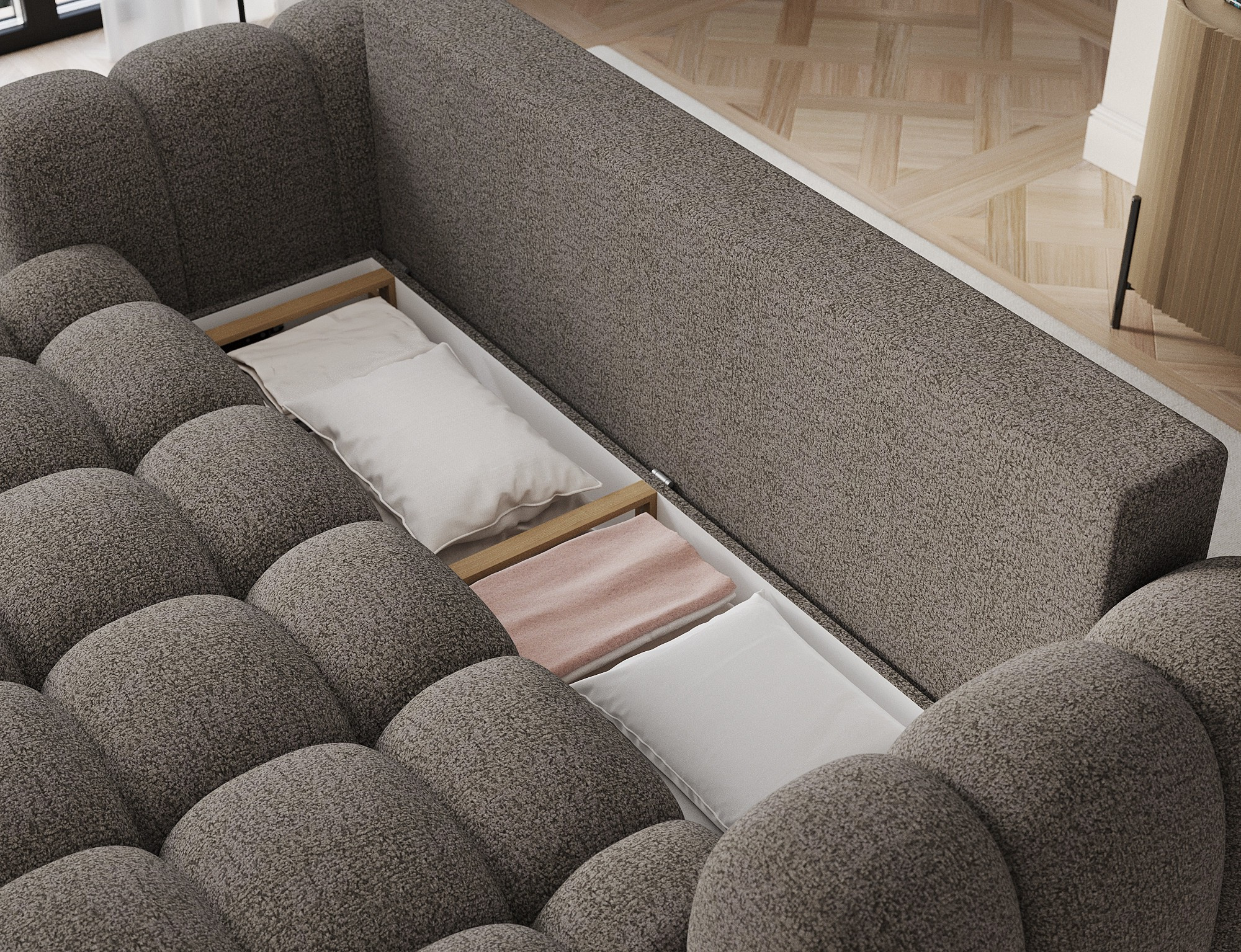Pohovka Cotonn je vybavena funkcí spaní Dolphin, která umožňuje jediným pohybem proměnit pohovku v pohodlnou postel. To je ideální řešení pro hosty nebo když potřebujete více místa na spaní. Praktický úložný prostor na ložní prádlo, diskrétně skrytý v konstrukci nábytku, umožňuje snadné uložení dek, polštářů a dětských spacích souprav.