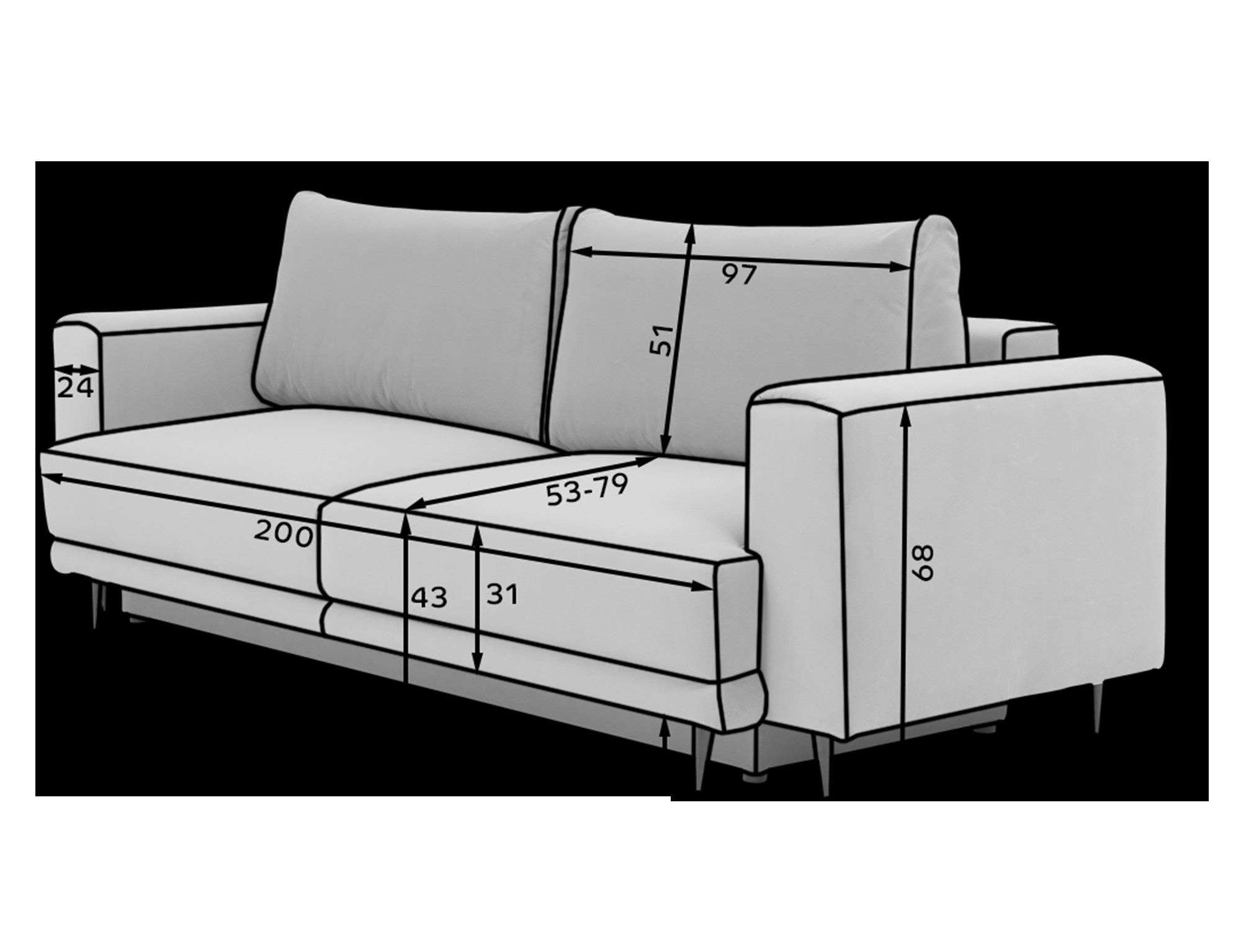 - Prostorné rozměry: S šířkou 248 cm, maximální výškou 95 cm a hloubkou 84 cm poskytuje dostatek prostoru pro pohodlné sezení i ležení. Výška sedu 43 cm zajišťuje komfortní posezení pro každého člena rodiny.