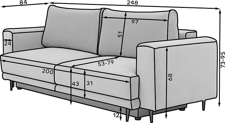 • Prostorné rozměry: S šířkou 248 cm, maximální výškou 95 cm a hloubkou 84 cm poskytuje dostatek prostoru pro pohodlné sezení i ležení. Výška sedu 43 cm zajišťuje komfortní posezení pro každého člena rodiny.