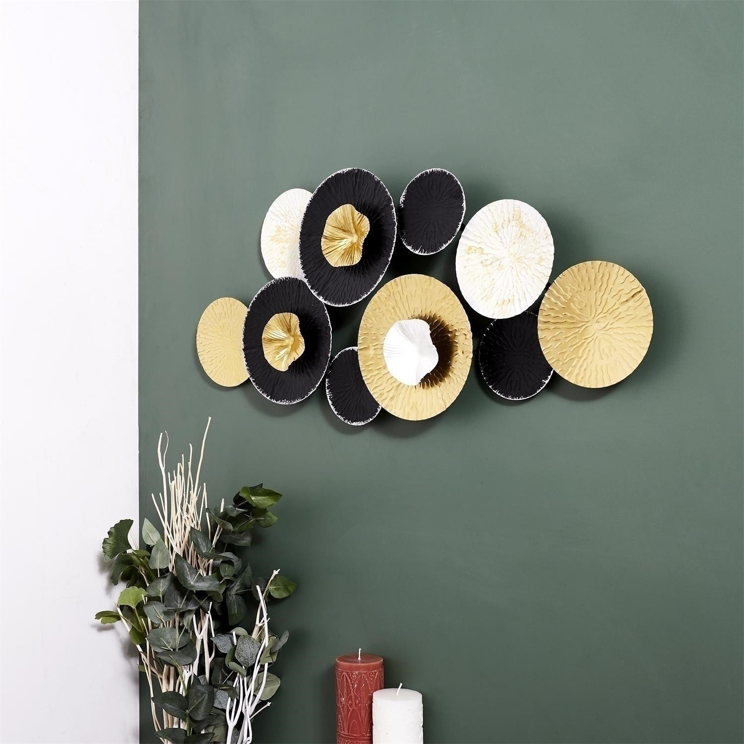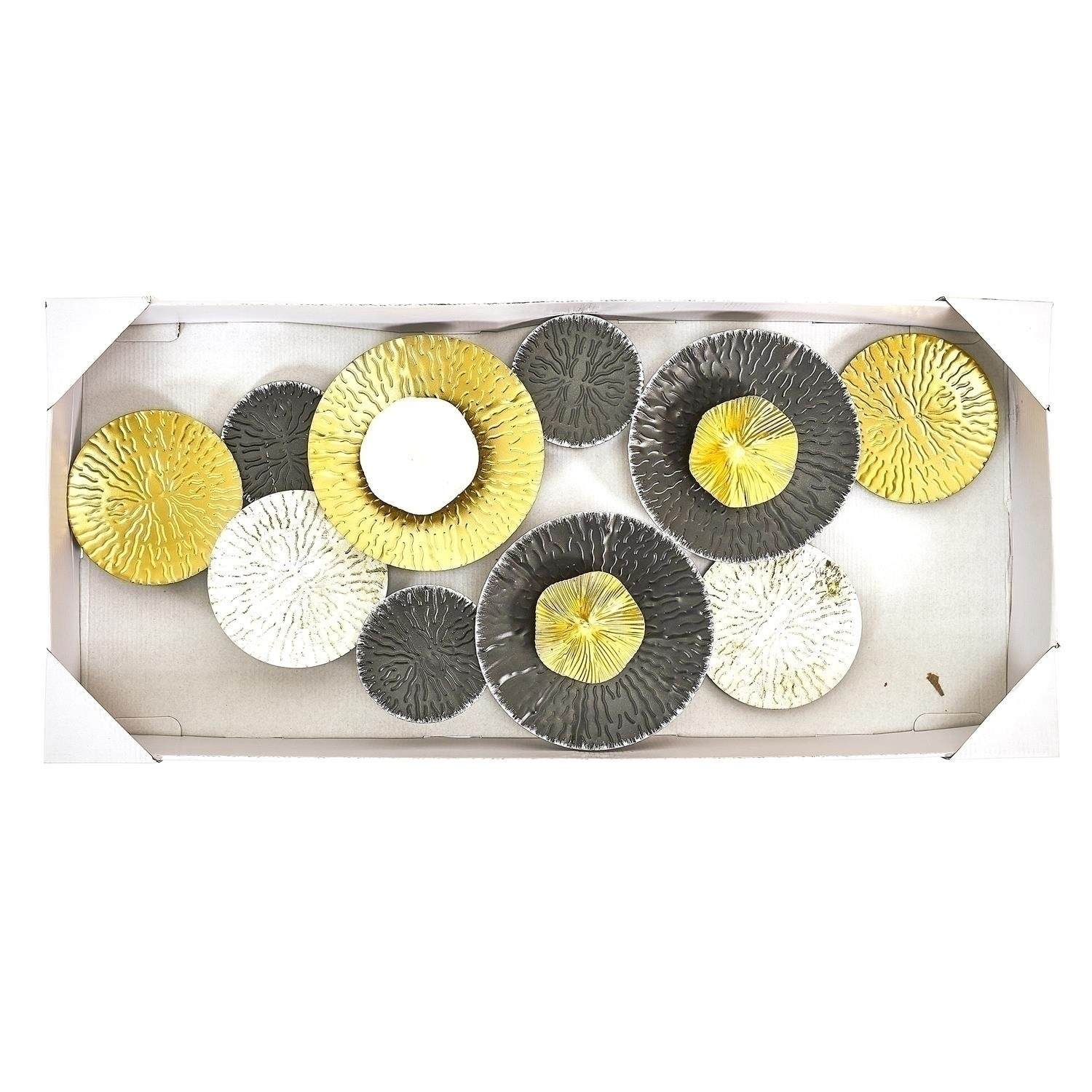 Kovová dekorace složená z deseti různobarevných rozet způsobí, že dosud prázdná stěna se stane ozdobou celé místnosti. Dekorace na stěnu umožní ozdobit stěnu nad psacím stolem nebo komodou. Dekorace v černo-bílé barvě se hodí nejen do moderních interiérů. Může být také ozdobou v interiéru ve stylu glamour nebo boho. Materiál: Kov, Rozměry balení: 31,5x83,5x6cm. Max. 4 ks v kartonu.