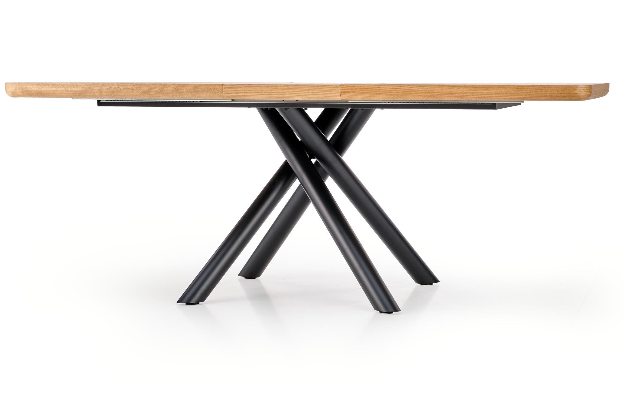 rozměry: 160-200/90/75 cm, skládací stůl, materiál: MDF + přírodní dýha / práškově lakovaná ocel, barva: deska stolu - přírodní dub, nohy - černé