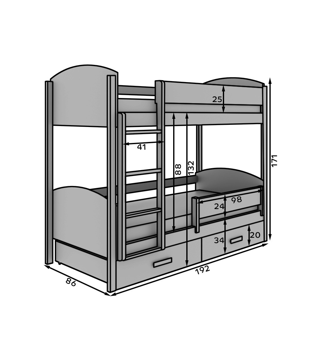 Patrová postel Jori je skvělou volbou pro rodiče, kteří hledají funkční a stylové řešení do dětského pokoje. Díky své promyšlené konstrukci poskytuje nejen pohodlná místa na spaní pro dvě osoby, ale také dodatečný úložný prostor. Dvě prostorné zásuvky umístěné pod spodní postelí jsou ideálním místem na ložní prádlo, hračky, oblečení nebo jiné dětské doplňky, což pomáhá udržovat pořádek v pokoji. Postel Jori spojuje moderní design s vysokou kvalitou zpracování, což zajišťuje, že bude sloužit po mnoho let. Pevná konstrukce a bezpečné, zaoblené hrany zajišťují pohodlí a bezpečnost pro malé děti. Díky tomu se postel hodí jak do pokoje chlapce, tak i dívky, vnášejíc do interiéru útulnou a funkční atmosféru.