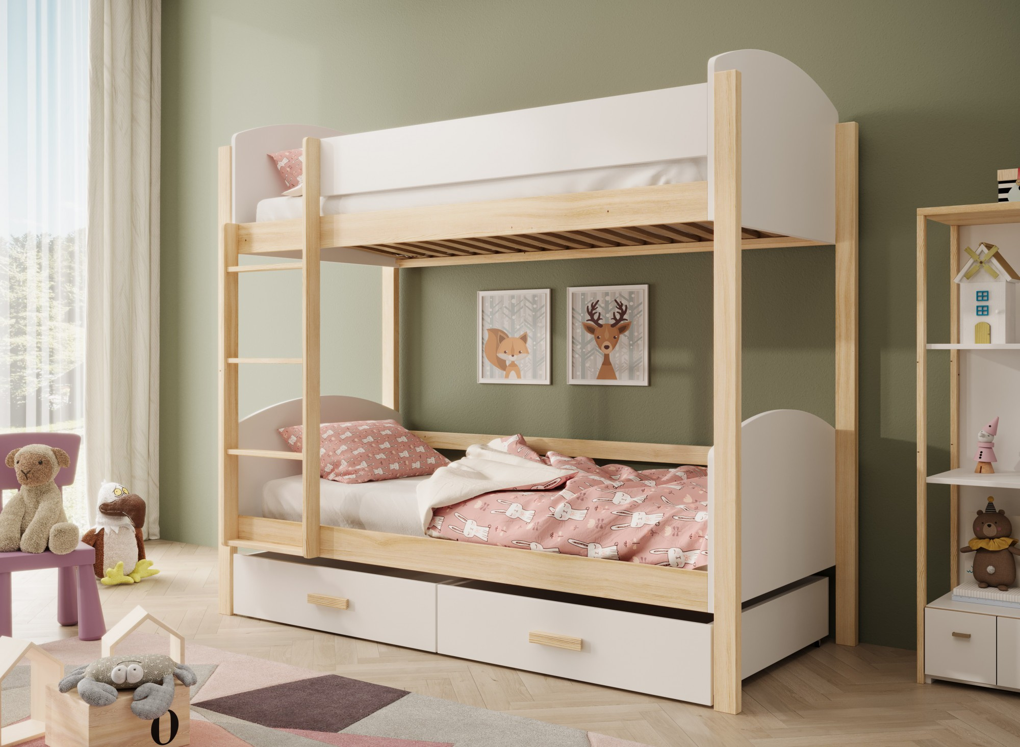 Patrová postel Jori je skvělou volbou pro rodiče, kteří hledají funkční a stylové řešení do dětského pokoje. Díky své promyšlené konstrukci poskytuje nejen pohodlná místa na spaní pro dvě osoby, ale také dodatečný úložný prostor. Dvě prostorné zásuvky umístěné pod spodní postelí jsou ideálním místem na ložní prádlo, hračky, oblečení nebo jiné dětské doplňky, což pomáhá udržovat pořádek v pokoji. Postel Jori spojuje moderní design s vysokou kvalitou zpracování, což zajišťuje, že bude sloužit po mnoho let. Pevná konstrukce a bezpečné, zaoblené hrany zajišťují pohodlí a bezpečnost pro malé děti. Díky tomu se postel hodí jak do pokoje chlapce, tak i dívky, vnášejíc do interiéru útulnou a funkční atmosféru.