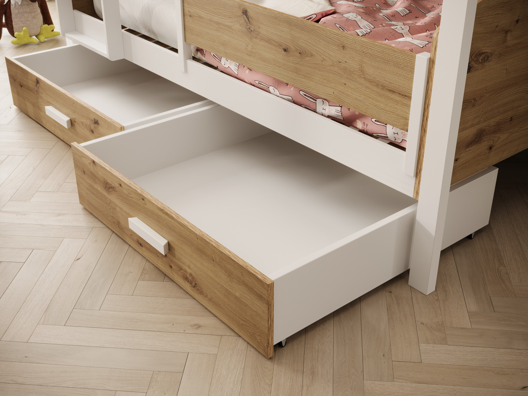 Patrová postel Jori se zábranou je vynikající volbou pro rodiče hledající funkční a stylové řešení do dětského pokoje. Díky své promyšlené konstrukci poskytuje nejen pohodlná místa na spaní pro dvě osoby, ale také dodatečný úložný prostor. Dvě prostorné zásuvky umístěné pod spodní postelí jsou ideálním místem na ložní prádlo, hračky, oblečení nebo jiné dětské doplňky, což pomáhá udržovat pořádek v pokoji. Postel Jori s bariérkou spojuje moderní design s vysokou kvalitou zpracování, což zajišťuje, že bude sloužit po mnoho let. Solidní konstrukce a bezpečné, zaoblené hrany zajišťují pohodlí a bezpečnost pro malé děti, zatímco dodatečná ochranná zábrana zaručuje klidný spánek bez rizika vypadnutí. Díky tomu se postel hodí jak do pokoje chlapce, tak i dívky, vnášejíc do interiéru útulnou a funkční atmosféru.