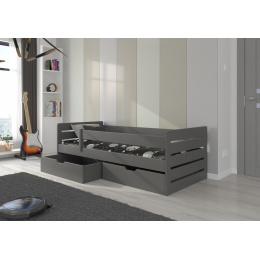 Jednolůžková postel BEMMA s jednoduchým tvarem se skvěle hodí do interiéru pokoje chlapce nebo dívky. Výhodou je ochranná zábrana zajišťující bezpečnost během spánku a prostorné a funkční zásuvky na ložní prádlo. Součástí sady je také odolný rám vyrobený z pevných lamel. Matrace není součástí postele.