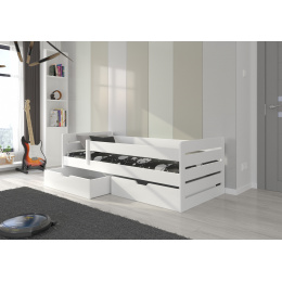 Jednolůžková postel BEMMA s jednoduchým tvarem se skvěle hodí do interiéru pokoje chlapce nebo dívky. Výhodou je ochranná zábrana zajišťující bezpečnost během spánku a prostorné a funkční zásuvky na ložní prádlo. Součástí sady je také odolný rám vyrobený z pevných lamel a pěnová matrace o tloušťce 8 cm.