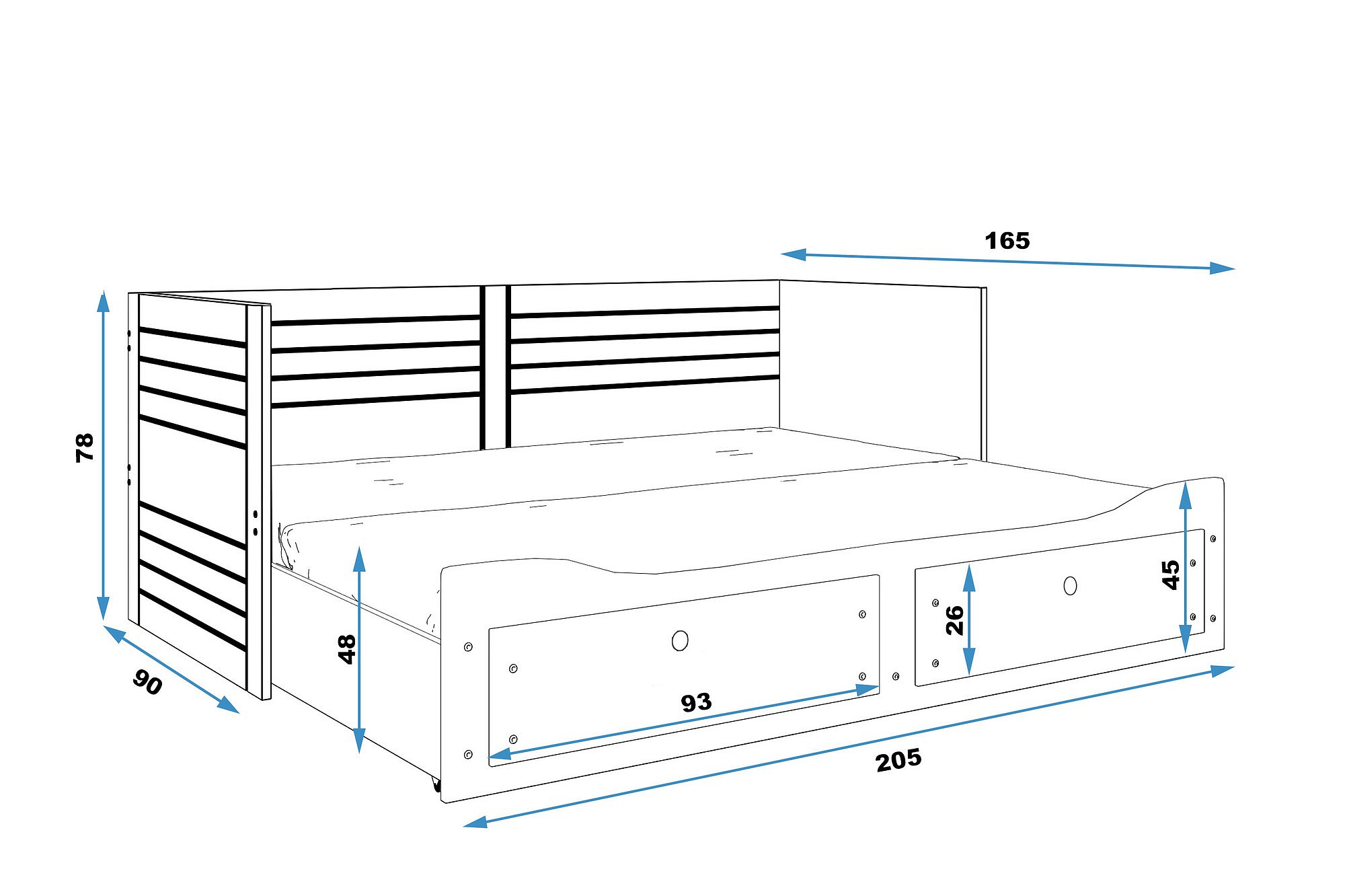 - Matrace - rozměr 200x80x9 (2 ks.)), se snímatelným potahem, klimatizačním vláknem a polyuretanovou pěnou. Povlak - prošívaná hypoalergenní tkanina, vyrobená z polyesteru, se zipem. Po rozložení je plocha na spaní 160x200.