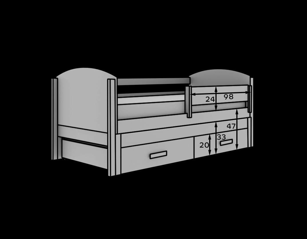 | Materiál | Postel vyrobená z borovicového dřeva, spojená s laminovanou deskou 18 mm, vložky z desky s ABS dýhou |