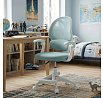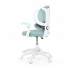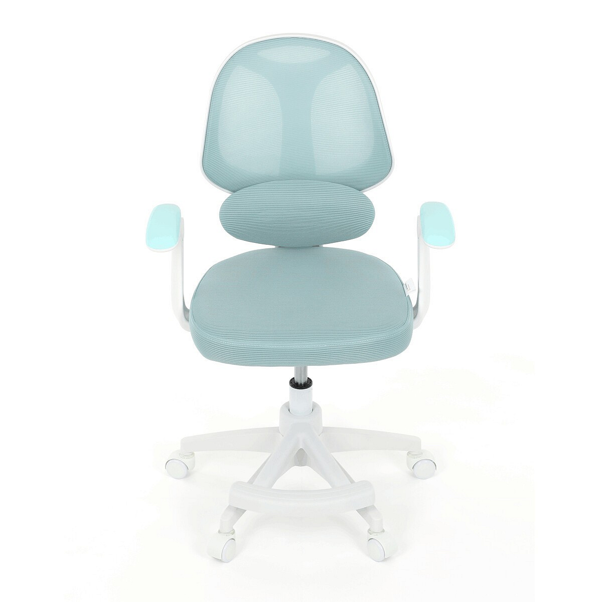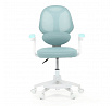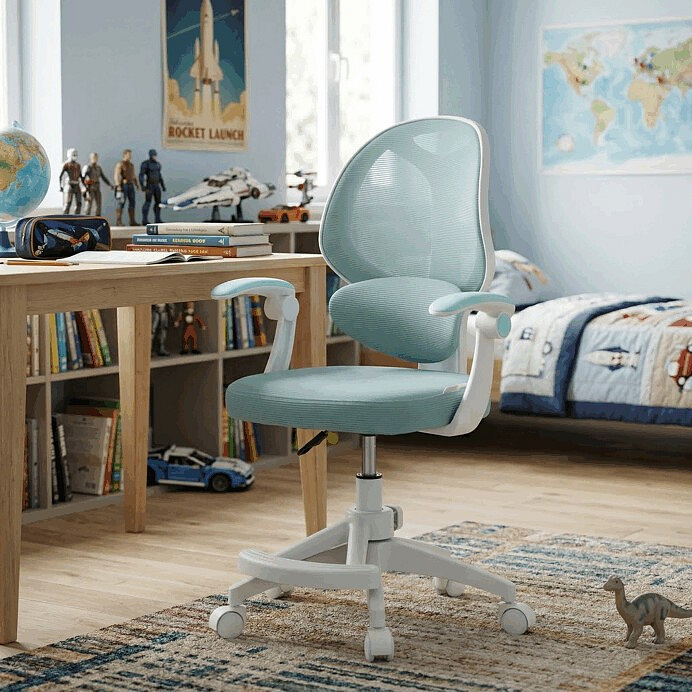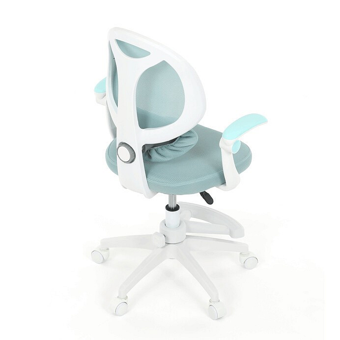 Dětská kancelářská židle s modrou síťovinou nabízí pohodlné a vzdušné sezení díky prodyšnému materiálu opěradla a sedáku. Bílé plastové nohy s pěti kolečky zajišťují stabilitu a snadnou mobilitu po různých typech podlah. Odklápěcí područky umožňují flexibilní využití prostoru, zatímco nastavitelná bederní opěrka podporuje správné držení zad během práce nebo studia. Výškově nastavitelný sedák umožňuje přizpůsobení židle aktuální výšce dítěte, což přispívá k ergonomii a komfortu. Součástí je také praktická opěrka nohou pro zvýšení pohodlí při delším sezení.