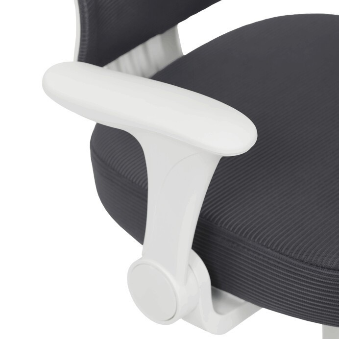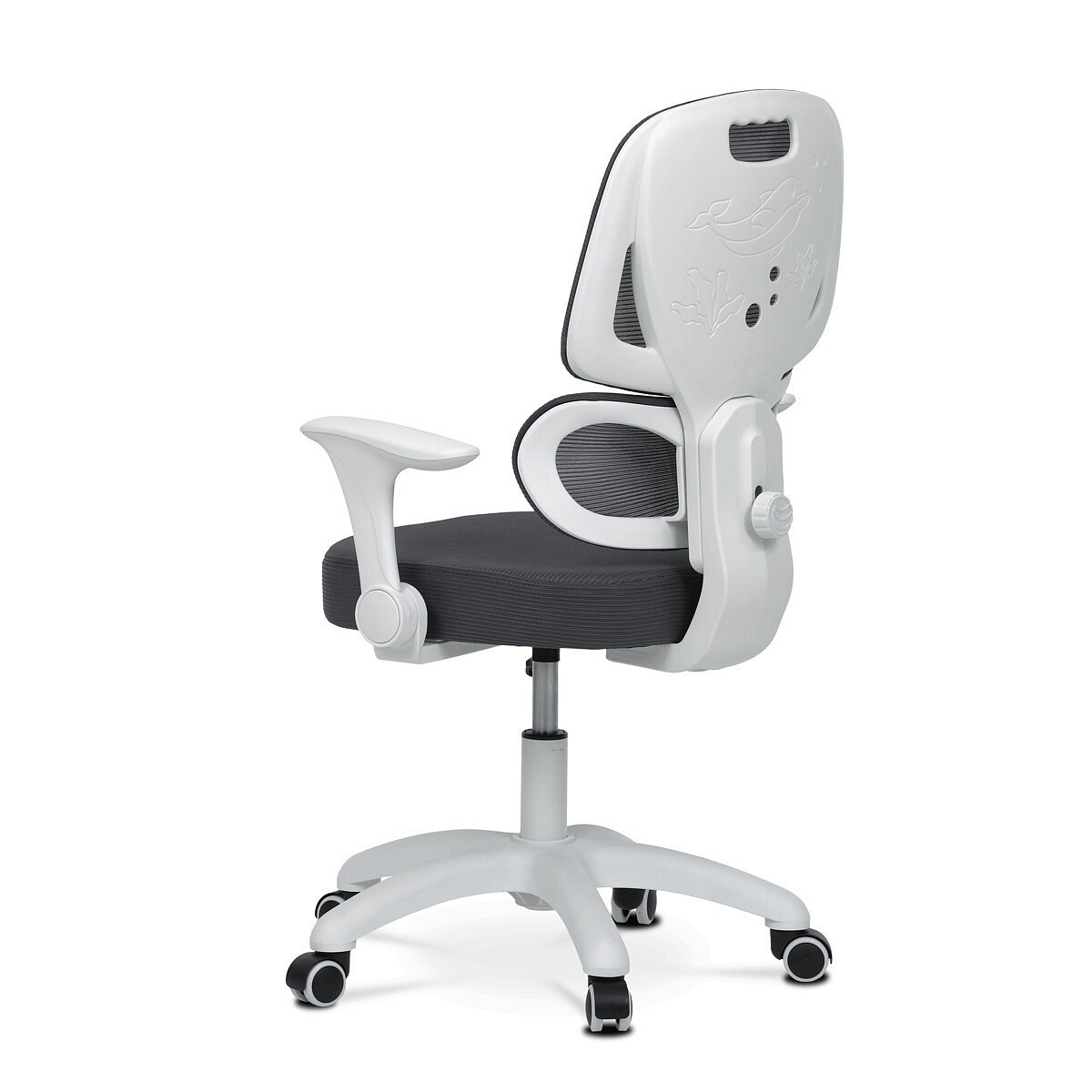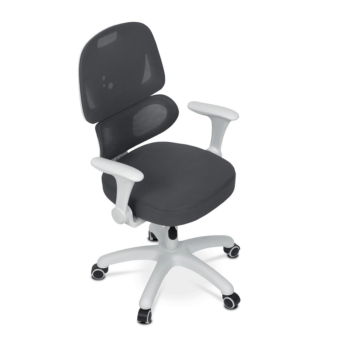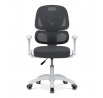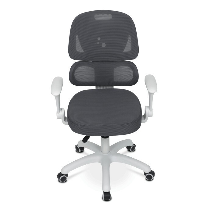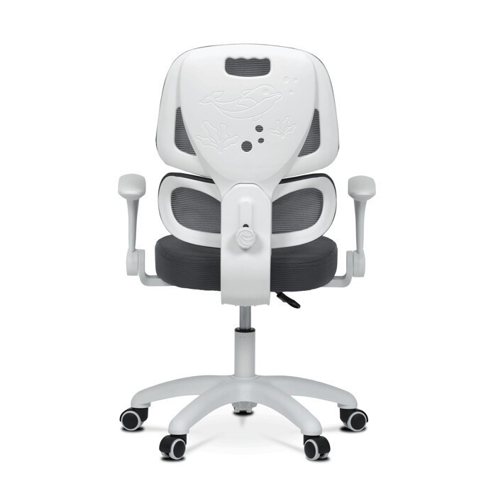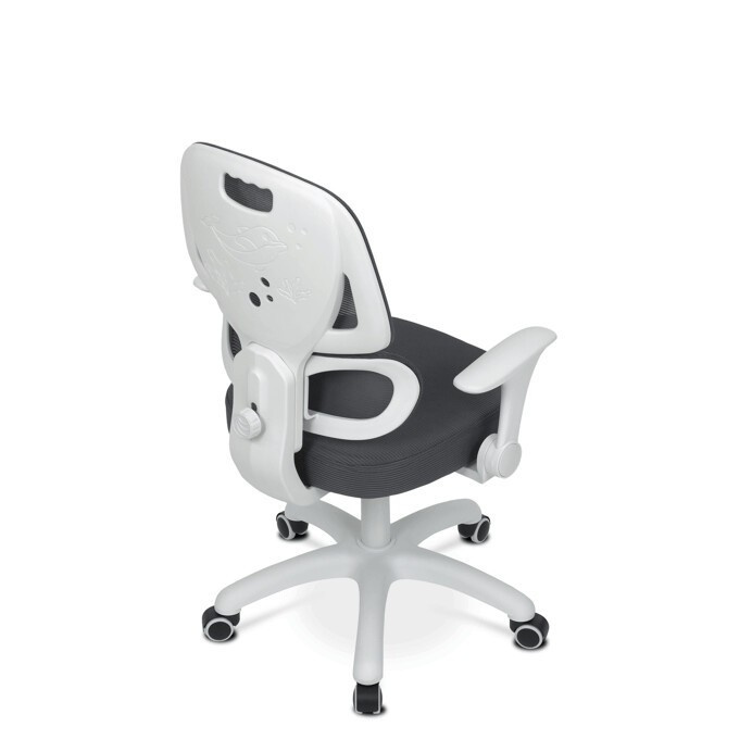 Dětská židle s šedou síťovinou nabízí pohodlné a zdravé sezení díky ergonomicky tvarované bederní opěrce a výškově nastavitelnému opěráku. Sedák je potažený prodyšným materiálem, který zajišťuje optimální cirkulaci vzduchu během dlouhého sezení. Odklápěcí područky umožňují snadné přizpůsobení prostoru a bílý plastový kříž s kolečky je určený pro tvrdé podlahy, což zajišťuje stabilitu a snadnou mobilitu. Mechanika umožňuje plynulé nastavení výšky sedáku podle potřeby dítěte. Celková konstrukce je navržena tak, aby podporovala správné držení těla a komfort při práci nebo hraní.