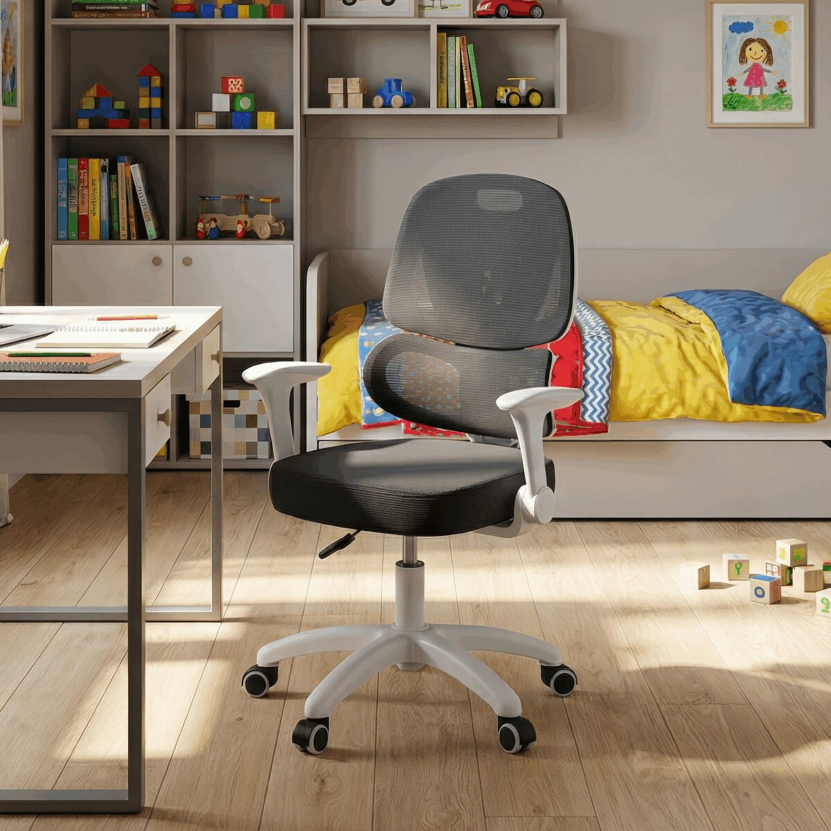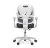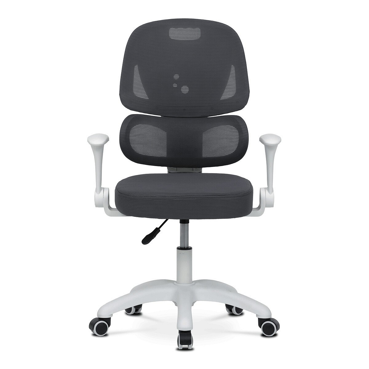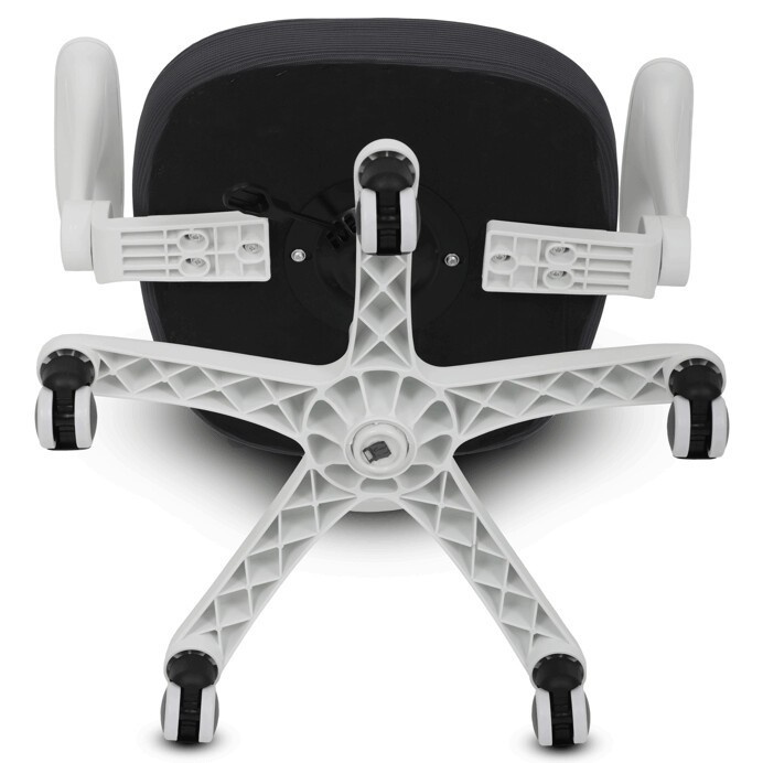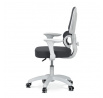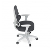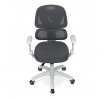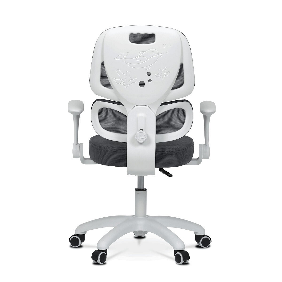 Dětská židle s šedou síťovinou nabízí pohodlné a zdravé sezení díky ergonomicky tvarované bederní opěrce a výškově nastavitelnému opěráku. Sedák je potažený prodyšným materiálem, který zajišťuje optimální cirkulaci vzduchu během dlouhého sezení. Odklápěcí područky umožňují snadné přizpůsobení prostoru a bílý plastový kříž s kolečky je určený pro tvrdé podlahy, což zajišťuje stabilitu a snadnou mobilitu. Mechanika umožňuje plynulé nastavení výšky sedáku podle potřeby dítěte. Celková konstrukce je navržena tak, aby podporovala správné držení těla a komfort při práci nebo hraní.