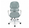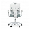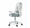 Dětská židle s konstrukcí z bíle plastového kříže a kolečky určenými pro tvrdé podlahy nabízí stabilní a bezpečné sezení. Opěradlo i sedák jsou potaženy zelenou prodyšnou síťovinou, která zajišťuje komfortní cirkulaci vzduchu během používání. Výškově nastavitelný opěrák a sedák umožňují přizpůsobení židle aktuálním potřebám dítěte, zatímco odklápěcí područky přispívají k větší flexibilitě a snadnému přístupu ke stolu. Integrovaná bederní opěrka podporuje správné držení těla a přispívá k ergonomii sezení. Díky těmto vlastnostem je židle vhodná pro dlouhodobé používání v dětském pokoji nebo pracovně.