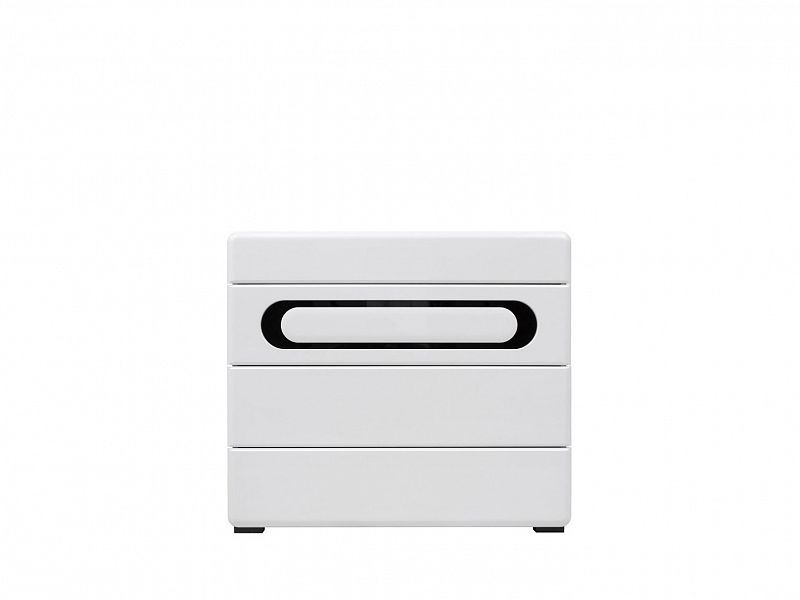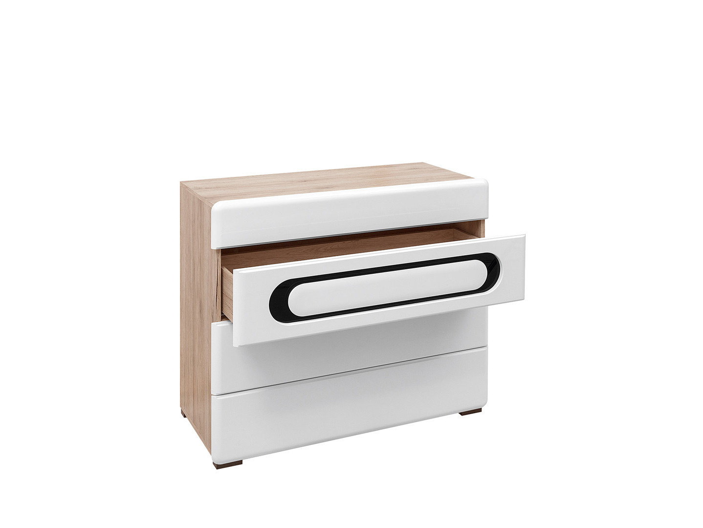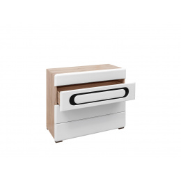 Komoda Byron KOM4S/9/10 v barevné kombinaci Dub san remo světlý a Bílý lesk. Komoda obsahuje 4 zásuvky na pojezdech s pomalým a tichým dovíráním. Horní zásuvka je vysoká 8 cm, ostatní jsou vysoké 14 cm. Hloubka zásuvek je 35 cm. Horní deska je ideálním místem pro vystavení fotografií, nebo různých dekorací.