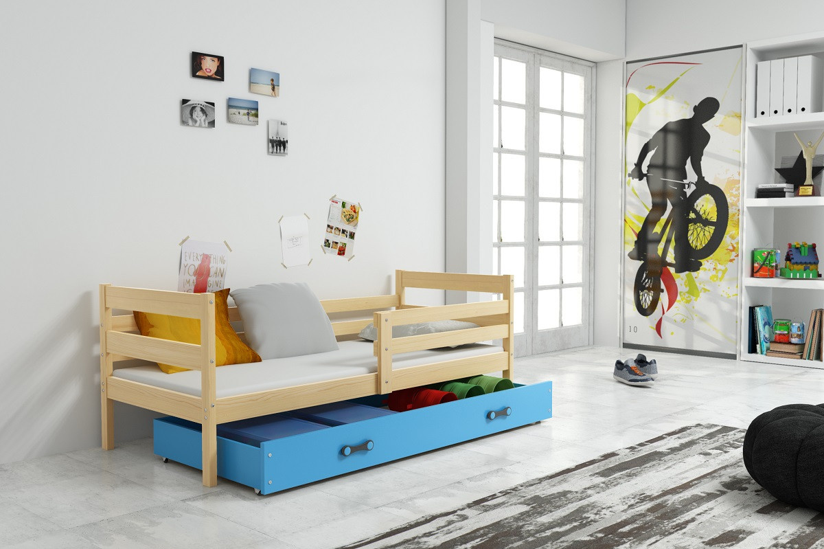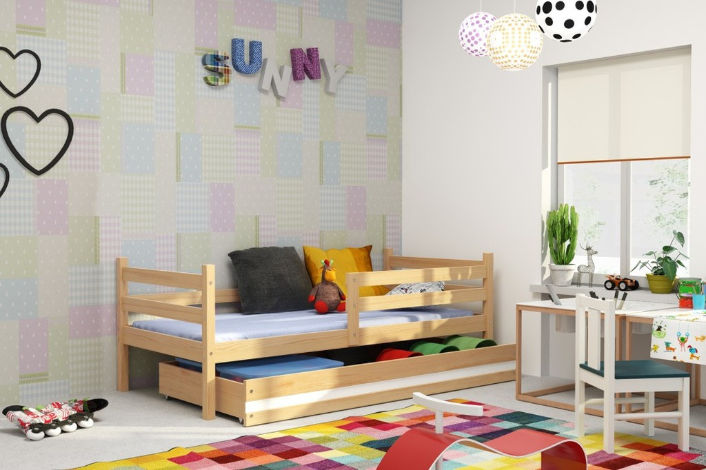Dětská postel Norbert je určena pro ty, kteří pro své dítě hledají funkčnost a kvalitu. Postel je vyrobena z borovicového dřeva, které je lakováno 3x a tím je zajištěna jasnost a barevná stálost. Na lakování je použitý bezpečný, vodou ředitelný lak vyhovující normám. Její stabilní konstrukce, zaoblené hrany a zábrana, která je v ceně postele, zajišťují bezpečnost a pohodlí dítěte. Zábranu si můžete podle potřeby umístit na pravou, nebo levou stranu postele. Součástí postele je také praktický úložný prostor na kolečkách, rošt a pěnová matrace se snímatelným potahem. Plocha pro spaní je 90x200 cm. Postel je dodávána v demontu a součástí je montážní plánek včetně všech potřebných spojovacích materiálů. Vyobrazené dekorace nejsou v ceně.
