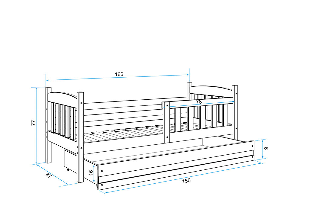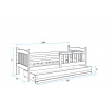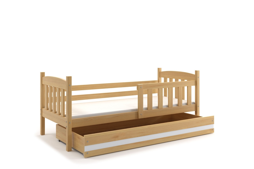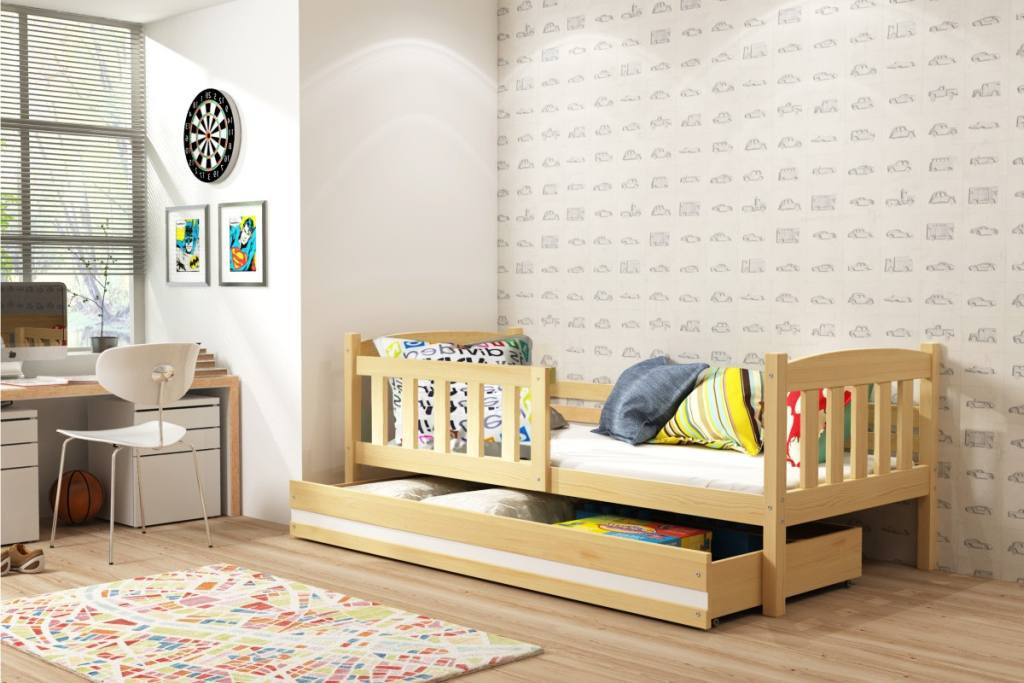 Dětská postel Kuba je určena pro ty, kteří pro své dítě hledají funkčnost, pohodlí a kvalitu. Postel je vyrobena z borovicového dřeva. Na lakování je použitý bezpečný, vodou ředitelný lak vyhovující normám. Její stabilní konstrukce, zaoblené hrany a zábrana, která je v ceně postele, zajišťují bezpečnost dítěte. Zábranu si můžete podle potřeby umístit na pravou, nebo levou stranu postele. Součástí postele je také praktický úložný prostor na kolečkách, rošt a pěnová matrace se snímatelným potahem. Plocha pro spaní je 80x160 cm. Postel je dodávána v demontu a součástí je montážní plánek včetně všech potřebných spojovacích materiálů. Vyobrazené dekorace nejsou v ceně.