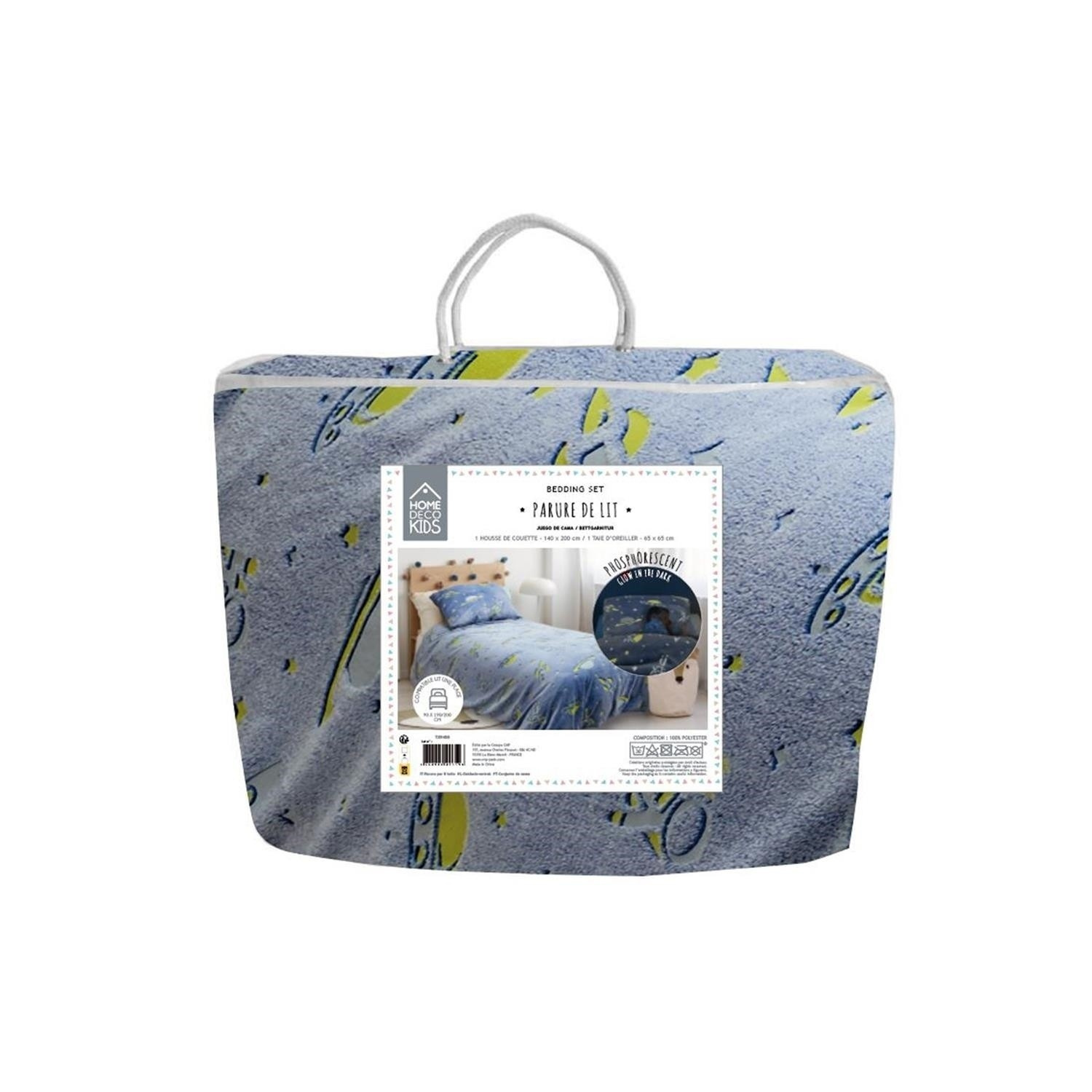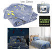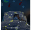 Souprava povlečení pro děti se skládá z povlaku na přikrývku o rozměrech 140x200 cm a povlaku na polštář 65x65 cm. Povlečení vyrobené ze 100% polyesterového vlákna, které je velmi teplé a příjemné na dotek. Svítící kosmický vzor je zajímavým doplňkem, který povzbudí nejmladší ke spánku v prostředí svítících planet, raket a kosmických lodí.