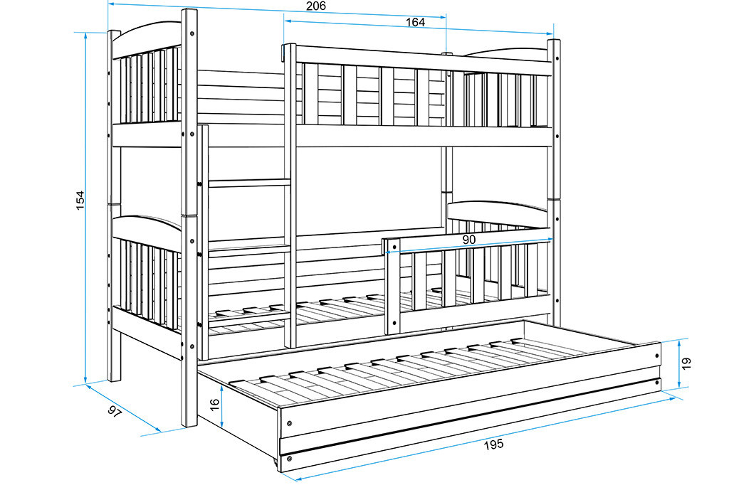 Dětská patrová postel Kuba je výbornou volbou všech rodičů, kteří pro své dítě hledají funkčnost, moderní design a kvalitu. Postel je vyrobena z kvalitního borovicového dřeva. Její stabilní konstrukce, zaoblené hrany a zábrana na horní i dolní posteli, zajišťují bezpečnost a pohodlí dítěte. Žebřík si můžete podle potřeby umístit na pravou, nebo levou stranu postele. Když děti patrová postel omrzí, je možno palandu rozložit na dvě samostatné postele. Součástí postele je také praktická přistýlka s matrací, kterou můžete využít pro další dítě, nebo když u Vašich dětí bude chtít přespat kamarád/ka. Všechny části postele mají rošt a pěnovou matraci v ceně. Tloušťka matrace je 7cm. Plocha pro spaní je 90x200 cm (vrchní a spodní část) a 80x190 cm (přistýlka). Postel je dodávána v demontu a součástí je montážní plánek včetně všech potřebných spojovacích materiálů. Vyobrazené doplňky a dekorace nejsou v ceně.