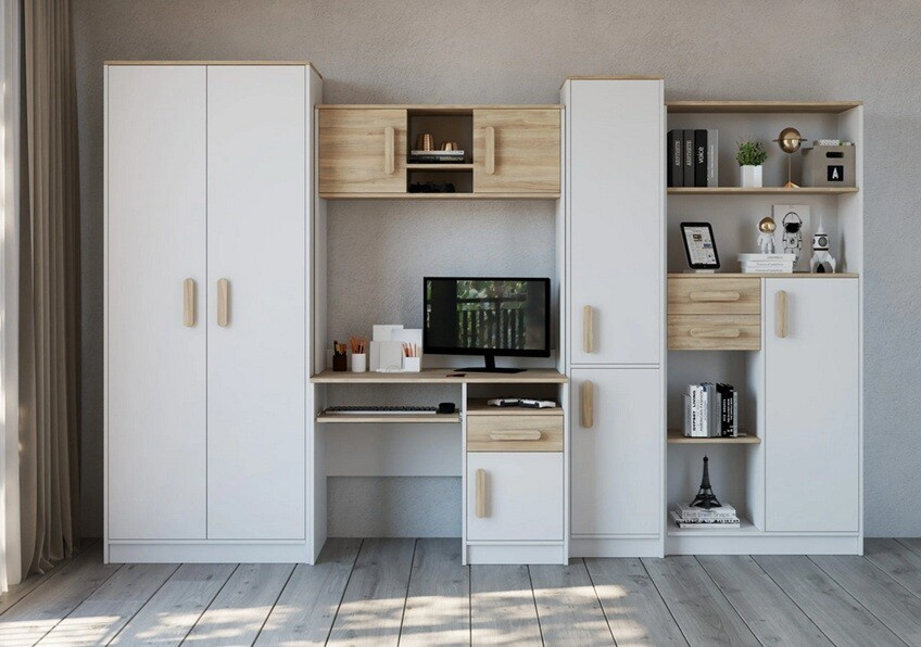 Nábytek pro děti MACIUS je sestava 5 dílů nábytku, které jsou v pokoji teenagera nepostradatelné. Nejdůležitějším dílem sestavy je psací stůl, který je vybaven prostornou skříňkou a rozměrnou zásuvkou. Má výsuvnou polici na klávesnici a otevřenou polici na drobné příslušenství, které chcete mít po ruce. Poskytne Vašemu dítěti pohodlné místo pro vypracovávání domácích úkolů. Stůl je vybaven nástavcem. Součástí sestavy je také dvoudveřová skříň. Uvnitř skříně najdeme polici a šatní tyč na zavěšení oblečení. Další díl sestavy je jednodveřová policová skříň a regál s policemi. Sestava nábytku neobsahuje desku na zeď mezi psacím stolem a nádstavcem nad psací stůl.