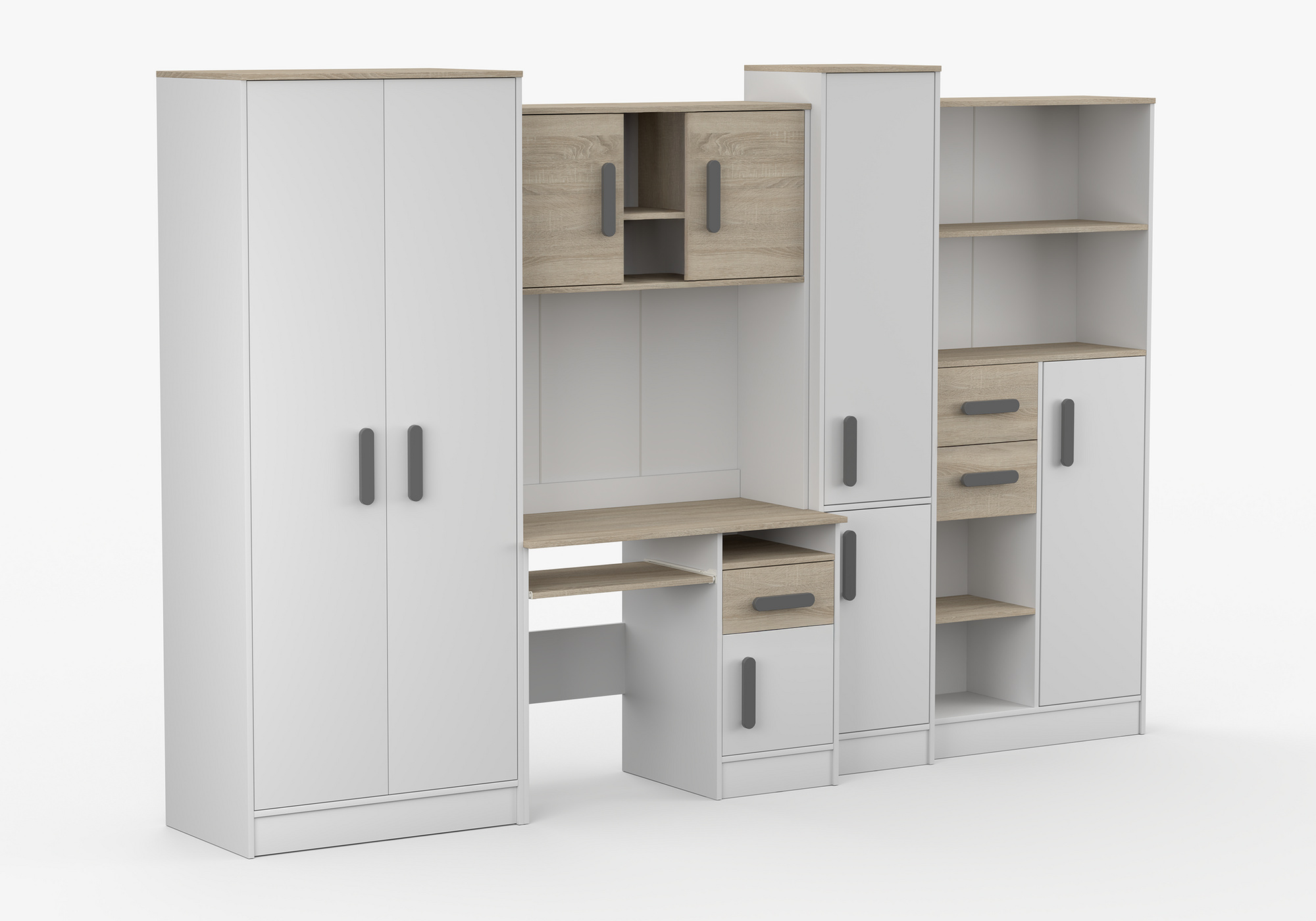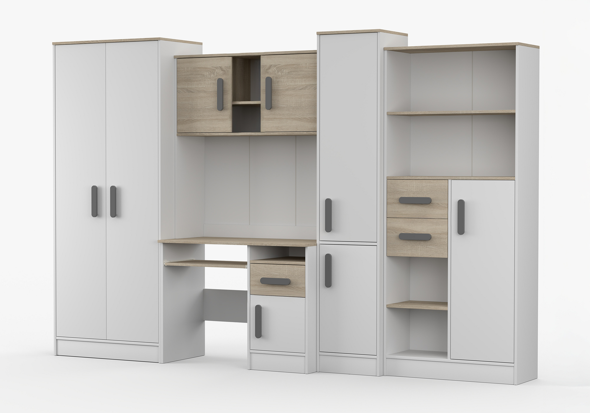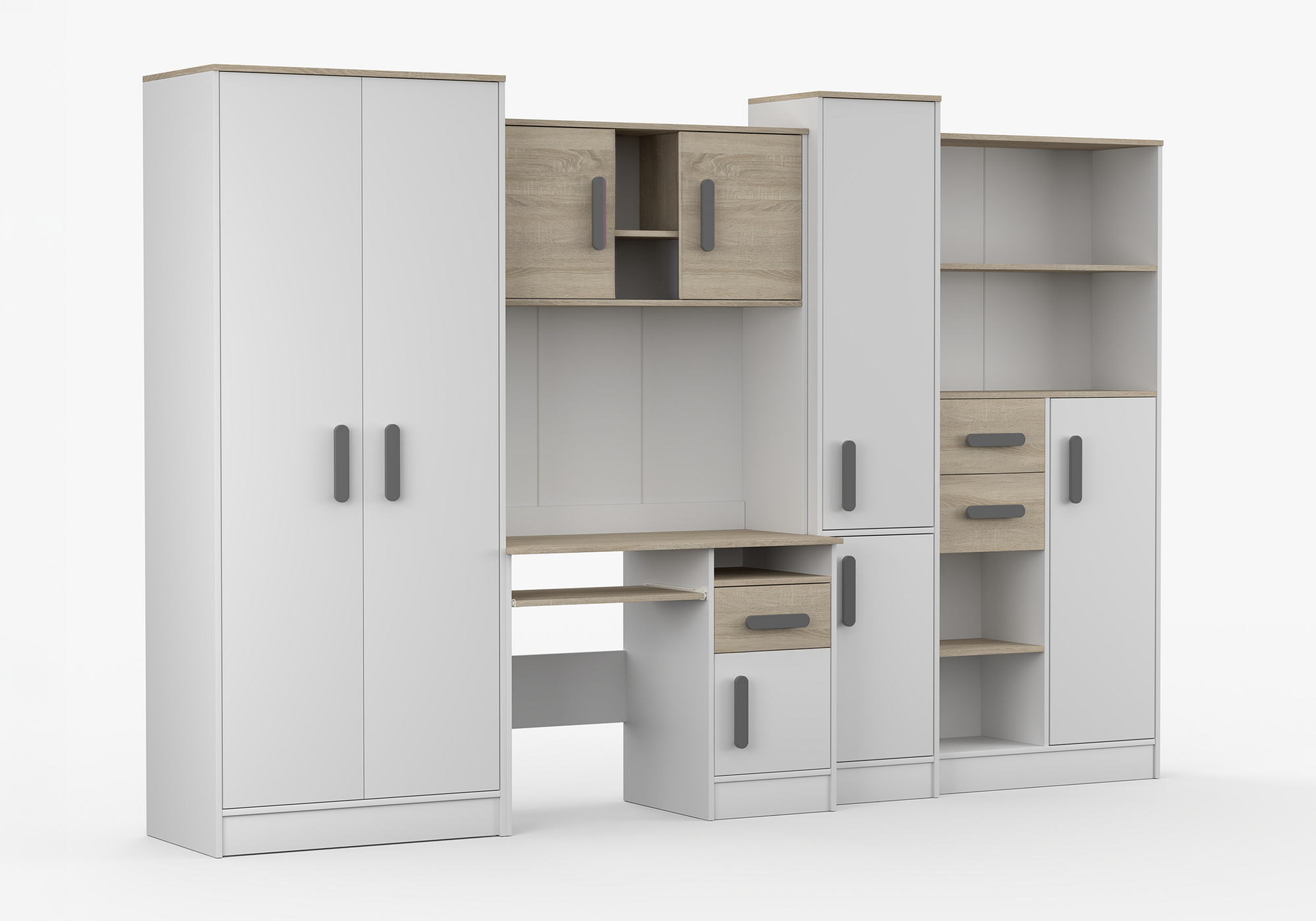 Nábytek pro děti MACIUS je sestava 5 dílů nábytku, které jsou v pokoji teenagera nepostradatelné. Nejdůležitějším dílem sestavy je psací stůl, který je vybaven prostornou skříňkou a rozměrnou zásuvkou. Má výsuvnou polici na klávesnici a otevřenou polici na drobné příslušenství, které chcete mít po ruce. Poskytne Vašemu dítěti pohodlné místo pro vypracovávání domácích úkolů. Stůl je vybaven nástavcem. Součástí sestavy je také dvoudveřová skříň. Uvnitř skříně najdeme polici a šatní tyč na zavěšení oblečení. Další díl sestavy je jednodveřová policová skříň a regál s policemi. Sestava nábytku neobsahuje desku na zeď mezi psacím stolem a nádstavcem nad psací stůl.