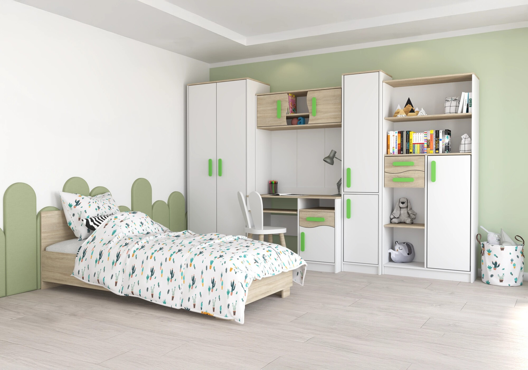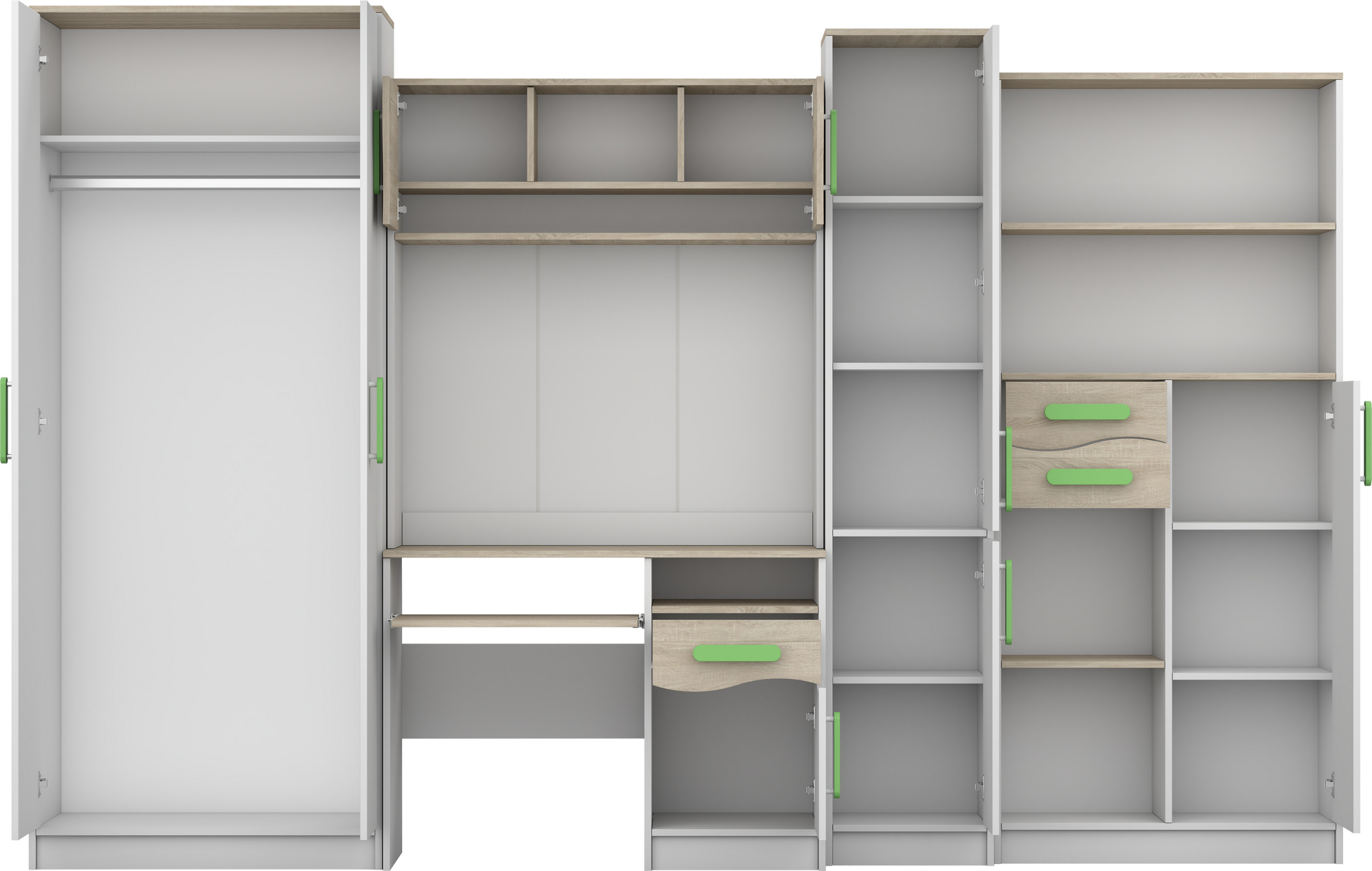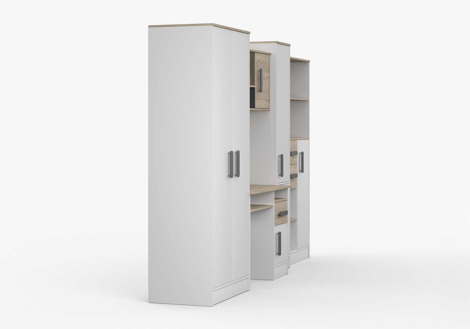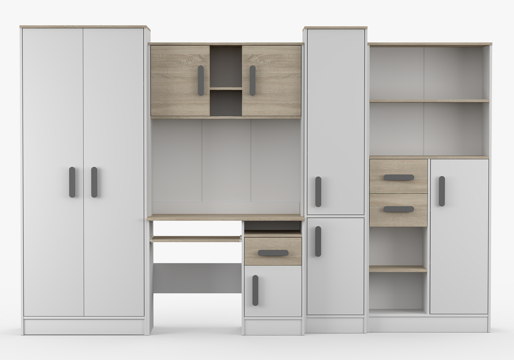 Nábytek pro děti MACIUS je sestava 5 dílů nábytku, které jsou v pokoji teenagera nepostradatelné. Nejdůležitějším dílem sestavy je psací stůl, který je vybaven prostornou skříňkou a rozměrnou zásuvkou. Má výsuvnou polici na klávesnici a otevřenou polici na drobné příslušenství, které chcete mít po ruce. Poskytne Vašemu dítěti pohodlné místo pro vypracovávání domácích úkolů. Stůl je vybaven nástavcem. Součástí sestavy je také dvoudveřová skříň. Uvnitř skříně najdeme polici a šatní tyč na zavěšení oblečení. Další díl sestavy je jednodveřová policová skříň a regál s policemi. Sestava nábytku neobsahuje desku na zeď mezi psacím stolem a nádstavcem nad psací stůl.