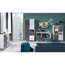 Poker je moderní nábytek do dětského nebo studentského pokoje v kombinaci 4 módních barev. Je vyroben z vysoce kvalitní laminované dřevotřísky, odolné vůči poškrábání, vlhkosti a vysokým teplotám. Všechny hrany jsou opatřeny ABS lištou, která zajistí trvanlivost a odolnost proti nárazu. Zajistí pohodlný i praktický interiér a také útulné a bezpečné prostředí, ve kterém se každé dítě bude cítit dobře. Veškeré díly, které tato sestava obsahuje, si můžete objednat samostatně. Všechny prvky této sestavy jsou dodávány v demontu. Součástí je montážní plánek včetně všech potřebných spojovacích materiálů. Vyobrazené dekorace nejsou v ceně.