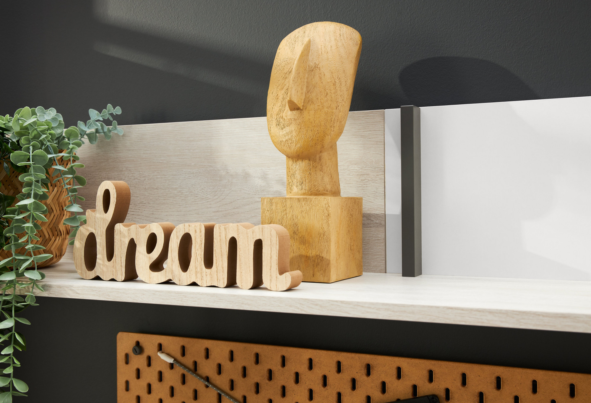 Systém REMO je vyroben v barevném provedení Dub Wilton bílý/Bílá Lux/Antracit. Korpus nábytku je vyroben v barevném odstínu Dub Wilton bílý.
