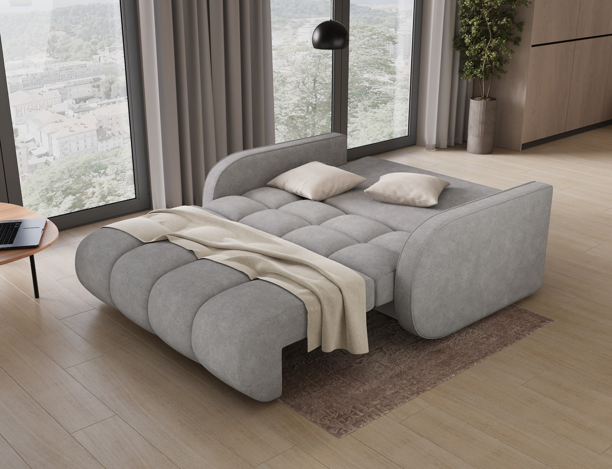 Další skvělou vlastností je možnost rozkládání. Pohovka se snadno promění v pohodlné lůžko s plochou na spaní o rozměrech 131 x 203 cm. Tato funkce je ideální pro hosty, kteří u vás zůstanou přes noc, nebo pro ty, kteří si rádi dopřejí odpolední siestu.