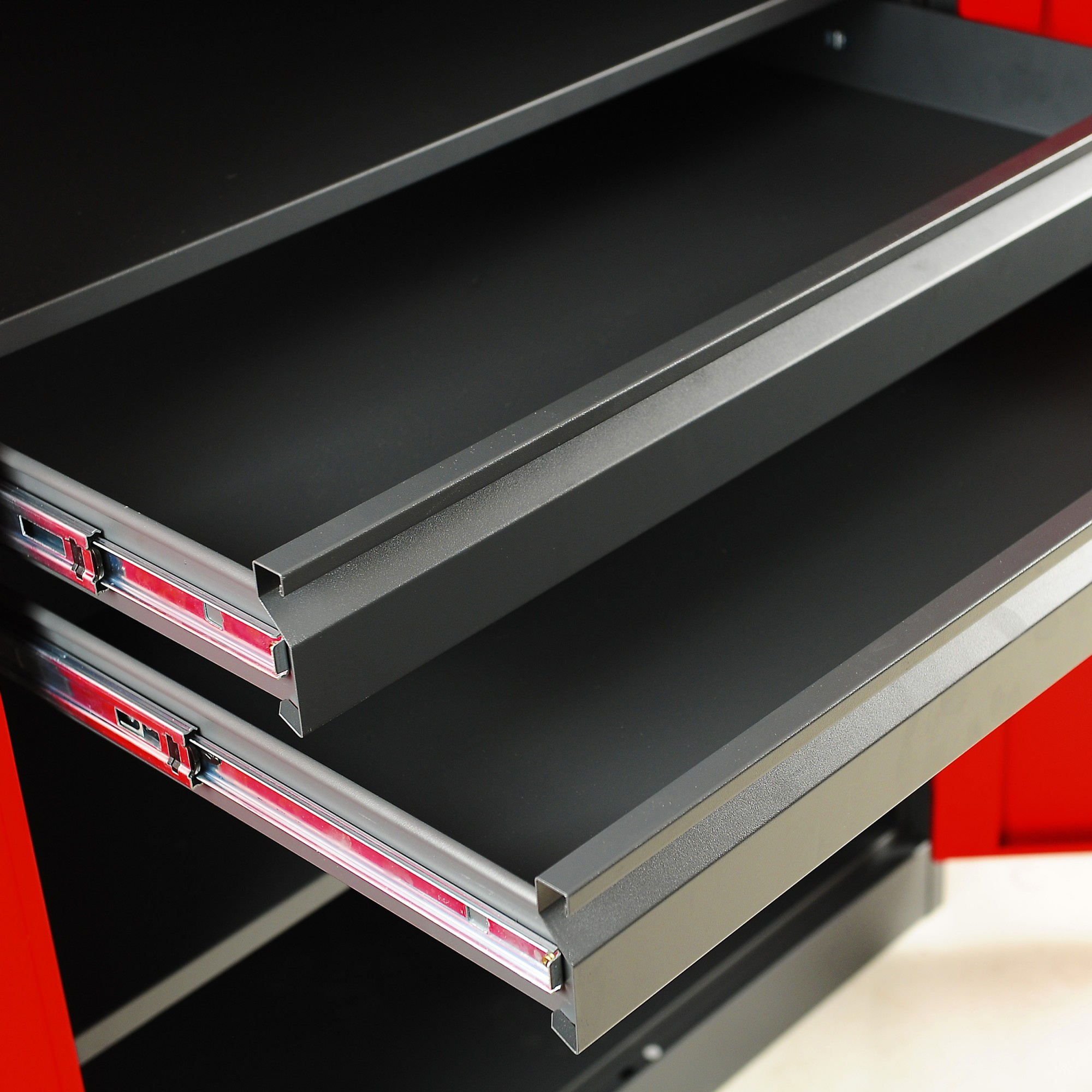 - Prostorný interiér: 3 nastavitelné police a 2 výsuvné zásuvky poskytují dostatek prostoru pro uspořádání vašeho nářadí.