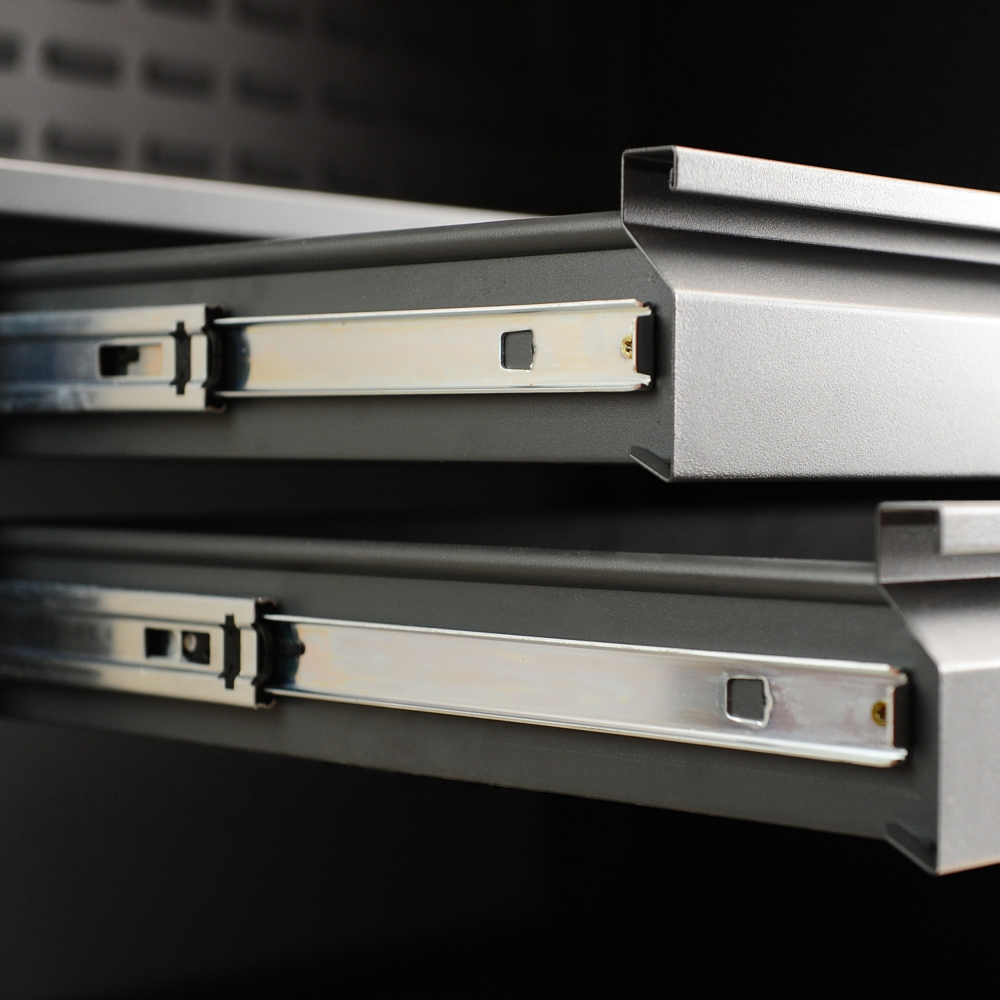 - Výsuvné zásuvky: Zásuvky na pojezdech zajišťují snadný a rychlý přístup k uloženému nářadí.