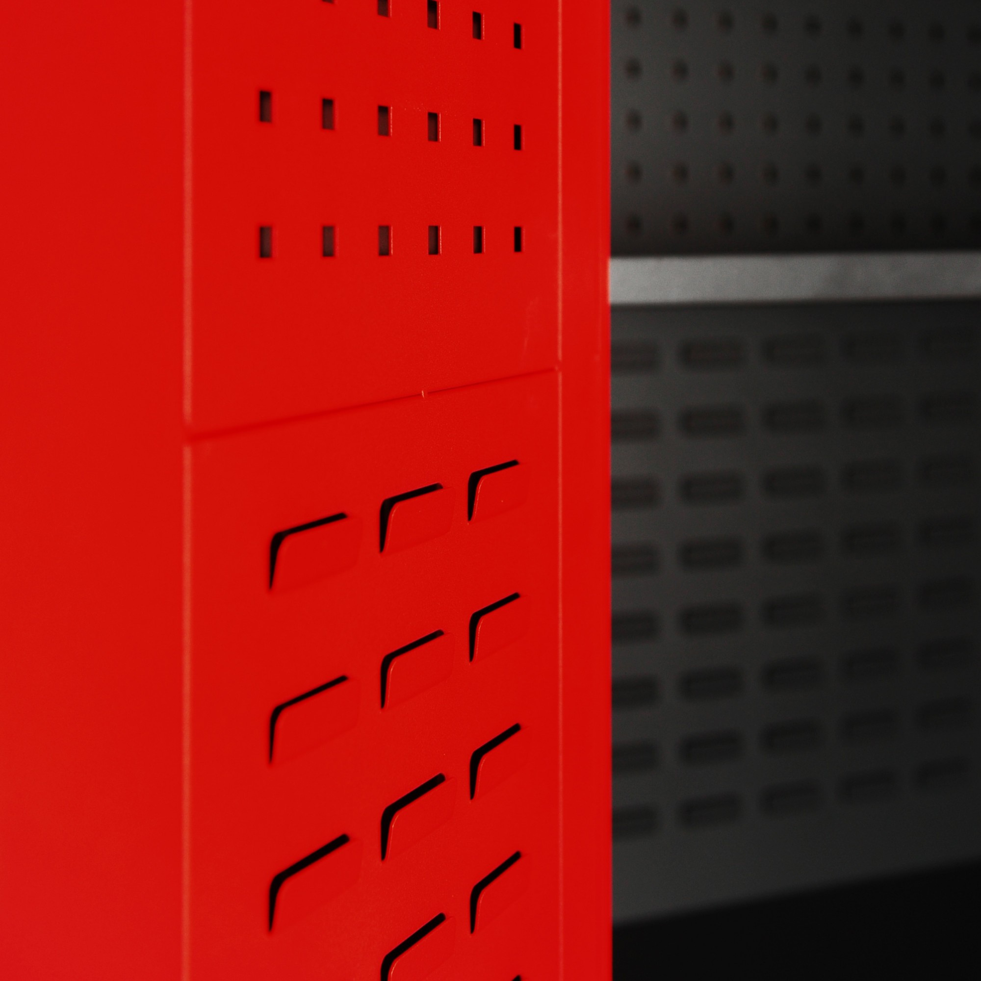 Vnitřní strana dveří je perforovaná, což vám dává možnost přizpůsobit si skříň pomocí háčků, držáků a dalších doplňků. Vytvořte si tak dokonalý systém pro uložení a organizaci vašeho nářadí.