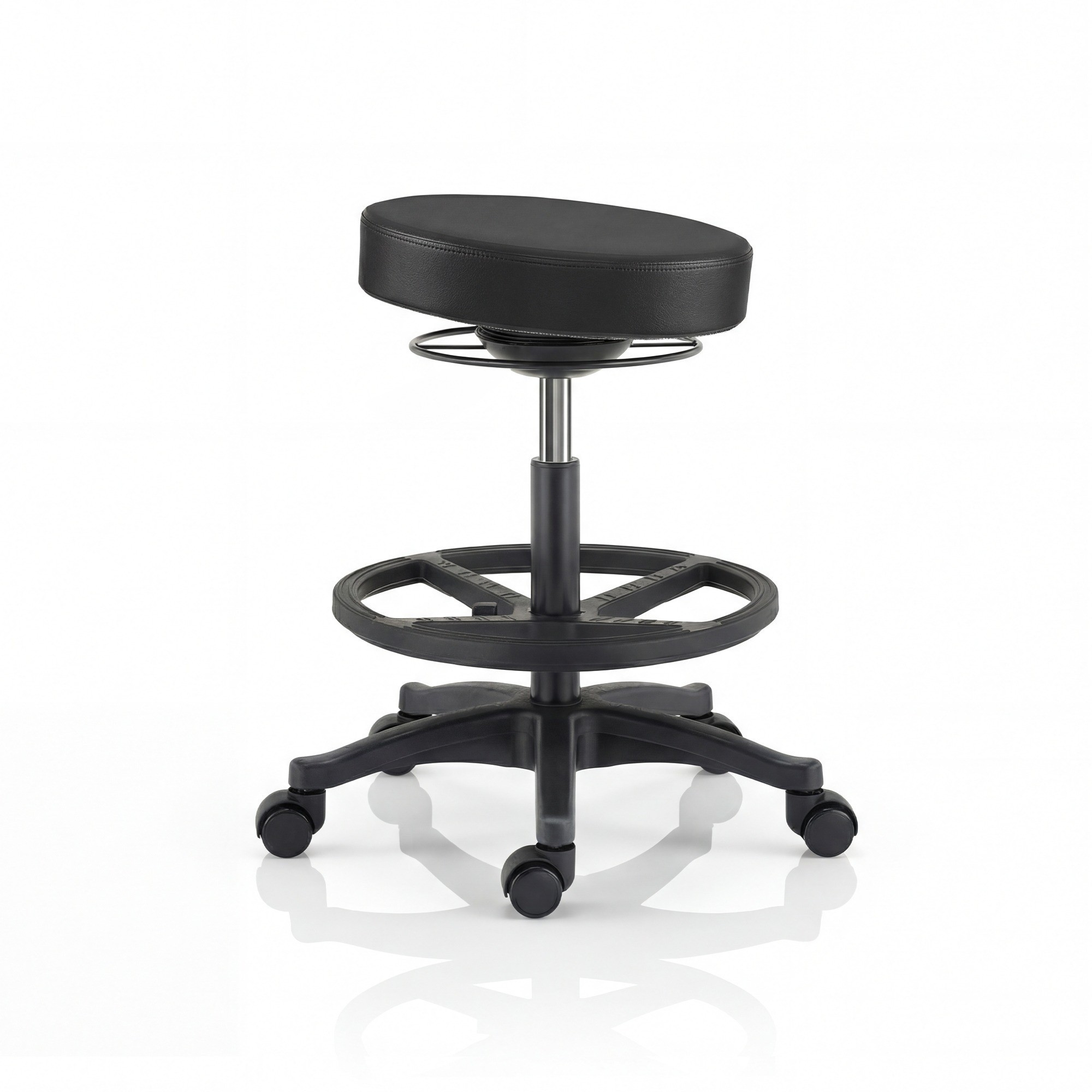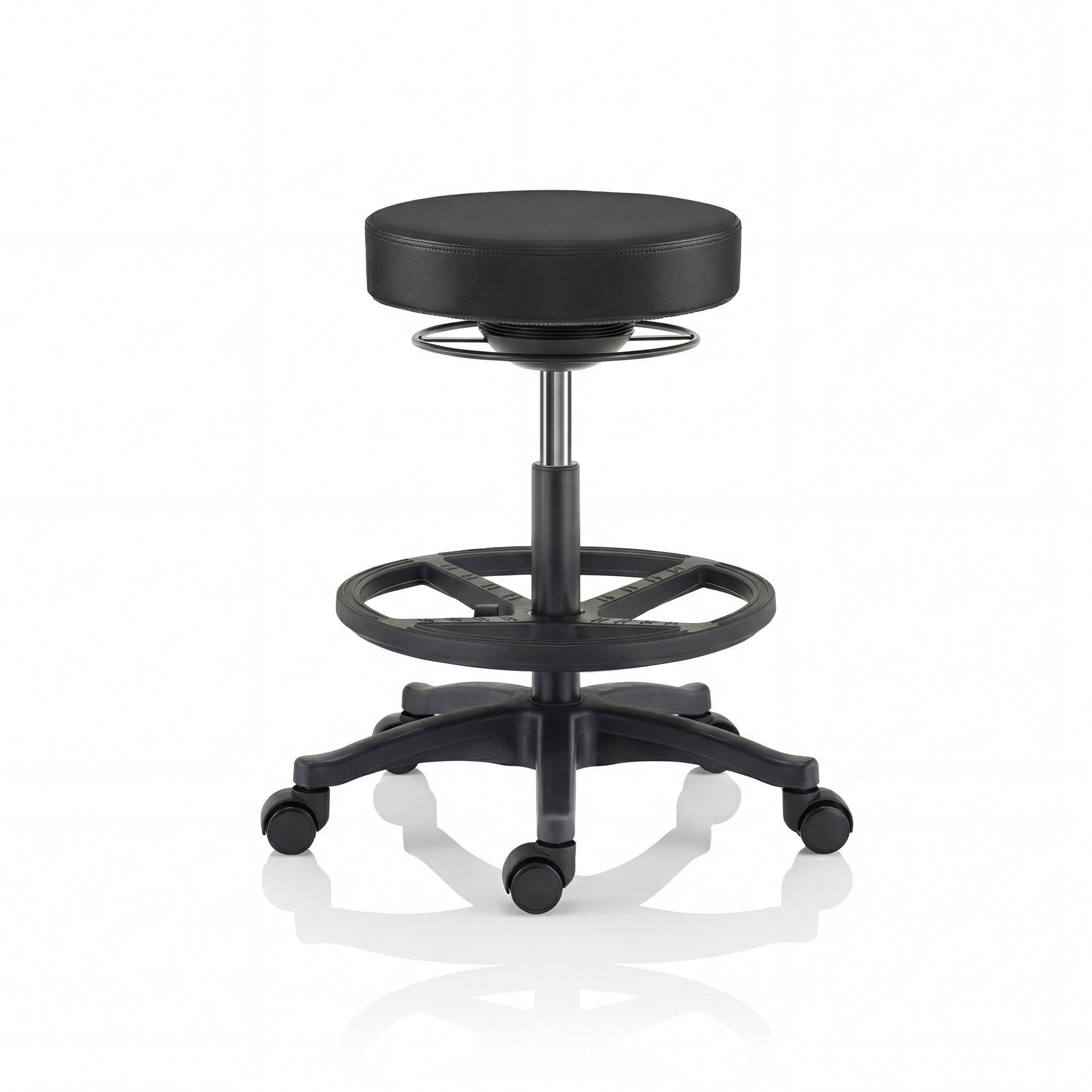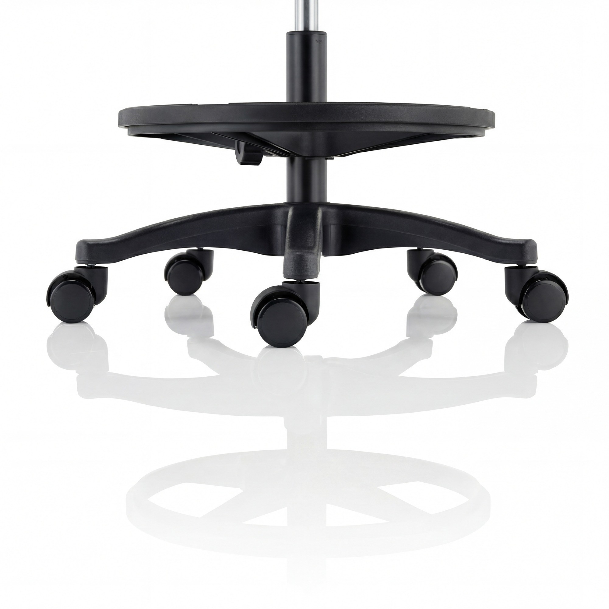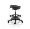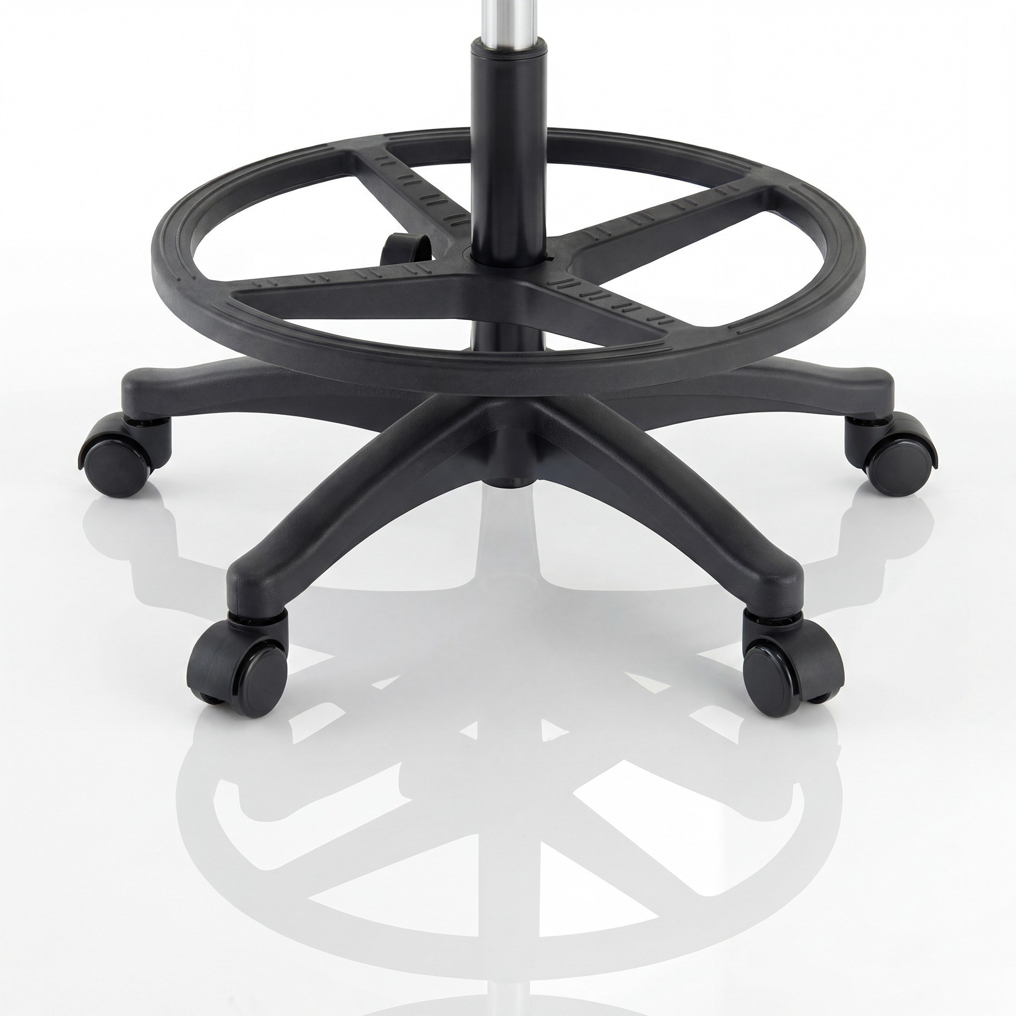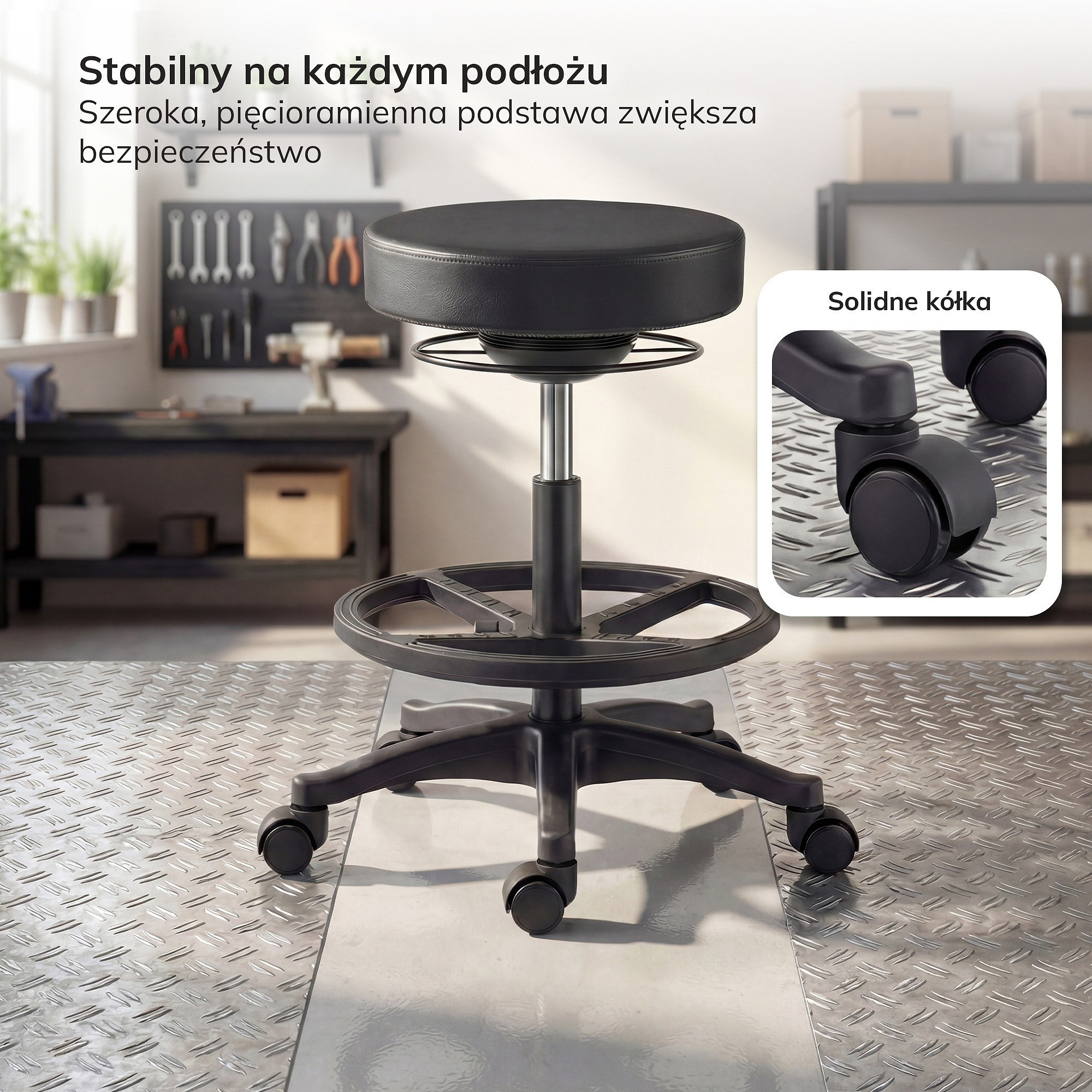 Široká pětiramenná základna zaručuje stabilitu při vyvažování a chrání před pádem. Dílenská stolička vydrží intenzivní používání a kolečka zajišťují mobilitu a rychlý pohyb po místnosti bez poškrábání podlahy. Certifikace BIFMA potvrzuje vysokou odolnost a spolehlivost konstrukce. Ocelový kroužek usnadňuje rychlé nastavení i v silných pracovních rukavicích.