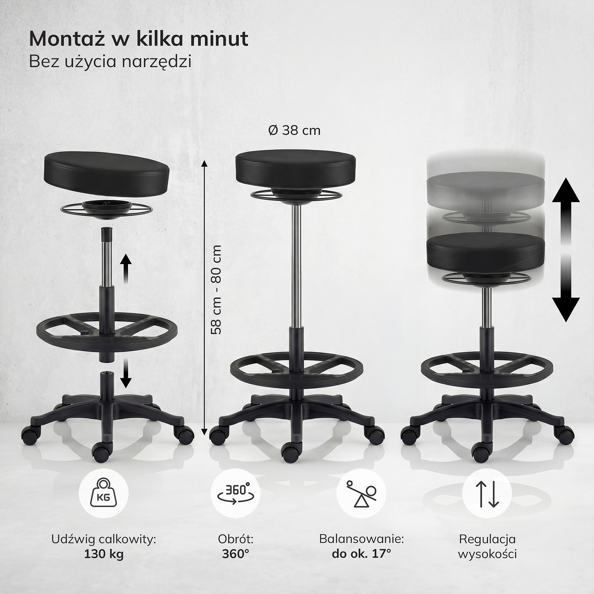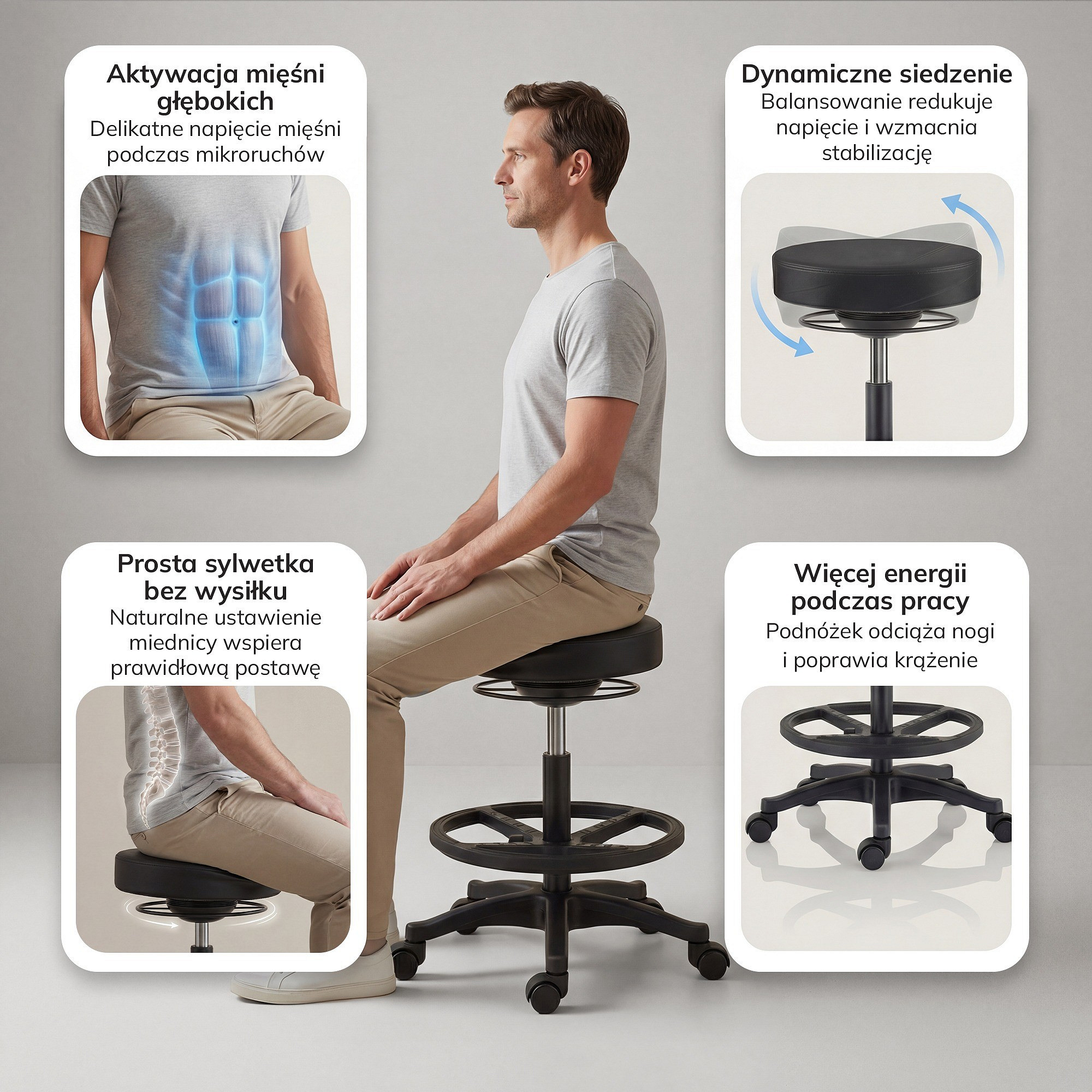 Zapomeňte na strnulé sezení! Mechanismus houpání s odklonem 17° Vás povzbudí k drobným pohybům a sníží pocit stagnace. Otočný pohyb o 360° Vám umožní volně dosáhnout na vše, co potřebujete, bez nutnosti vstávání. Kolečka zajistí plynulý pohyb mezi stanovišti – stačí se lehce odrazit od podlahy. Balancování zapojuje hluboké svaly a pomáhá udržovat aktivní držení těla.
