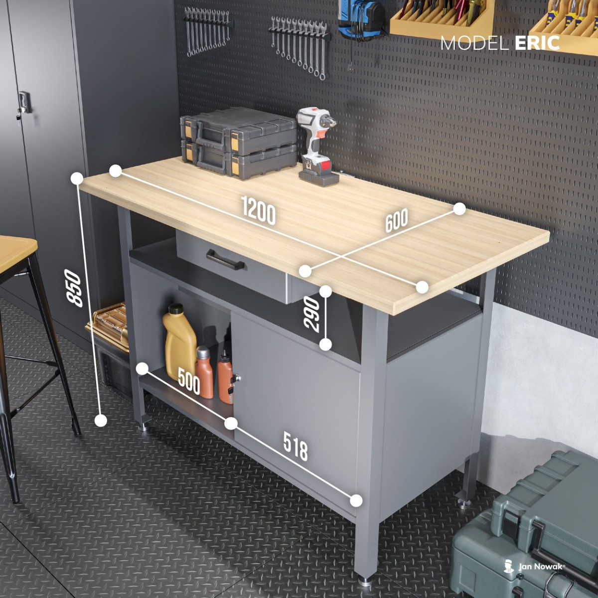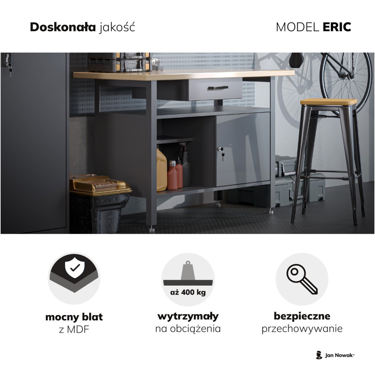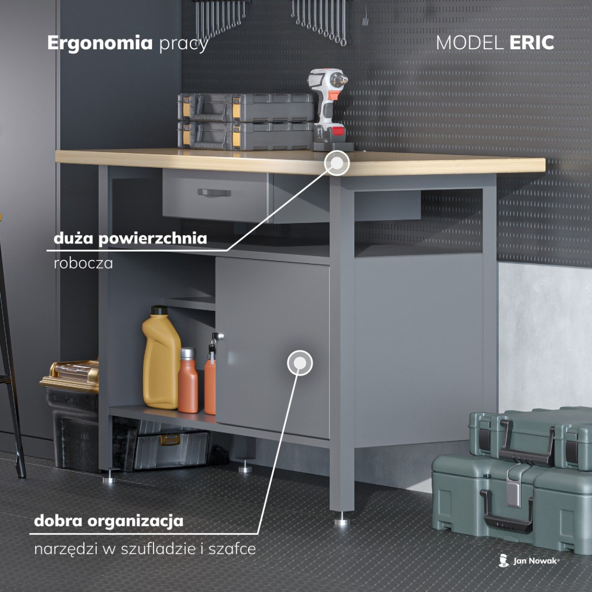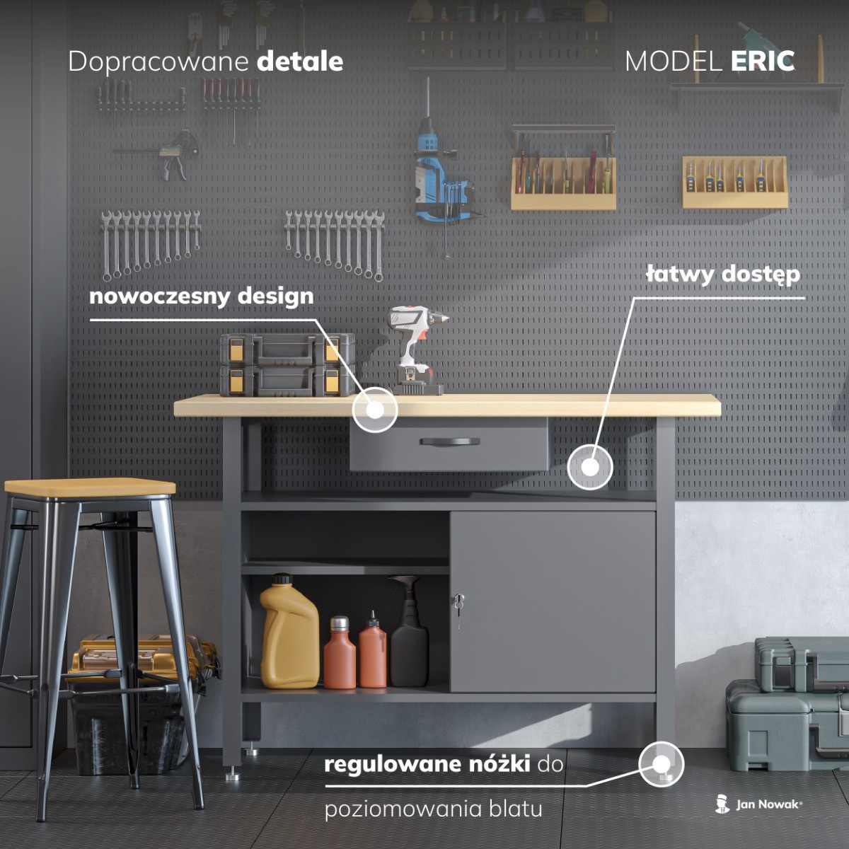Uspořádaná dílna je základem pro efektivní a radostnou práci, ať už jste profesionál nebo nadšený kutil. Představujeme vám dílenský stůl ERIC od renomované značky Jan Nowak, který kombinuje robustní konstrukci, praktické úložné prostory a elegantní design. S tímto stolem získáte nejen spolehlivého partnera pro vaše projekty, ale i stylový prvek, který pozvedne vzhled vaší dílny.