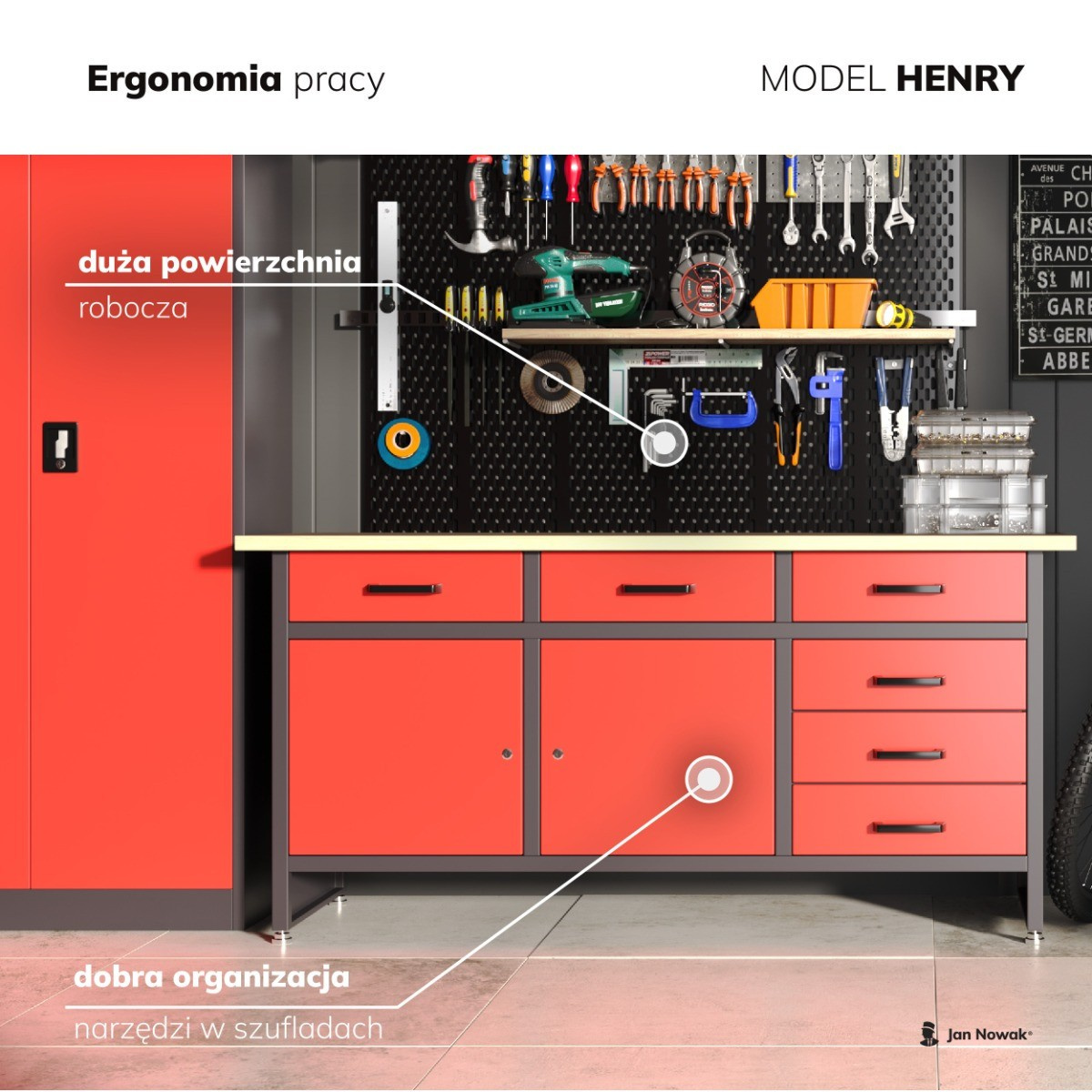Dílenský stůl HENRY se pyšní moderním a elegantním designem, který se hodí do každé dílny. Kombinace antracitově-červené barvy a světlé pracovní desky dodá vaší dílně styl a osobitost.