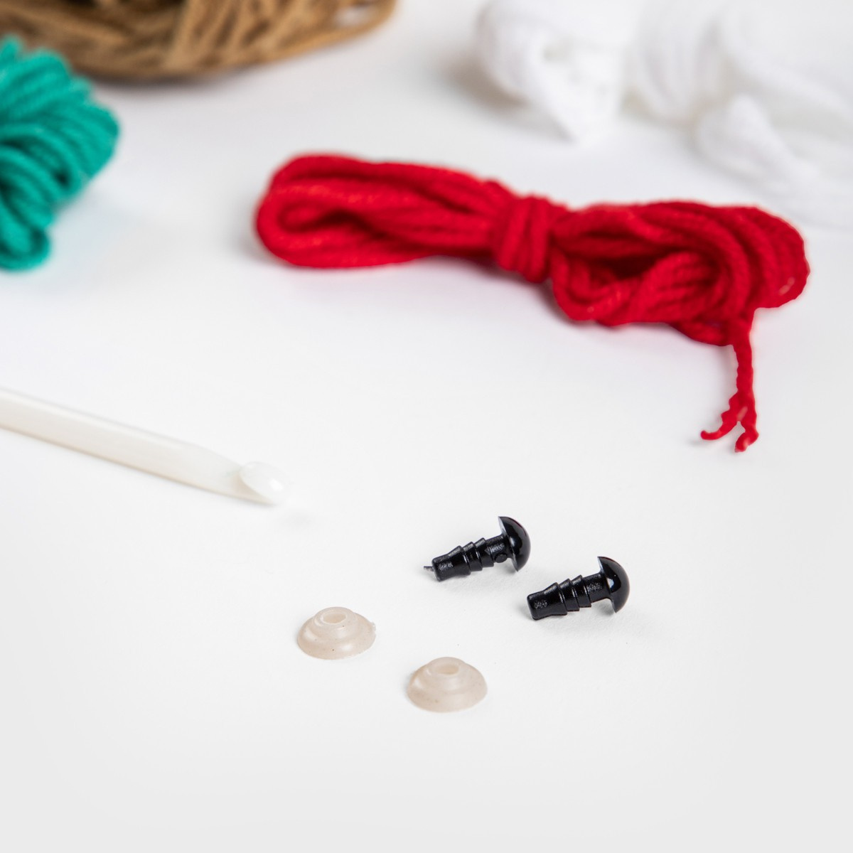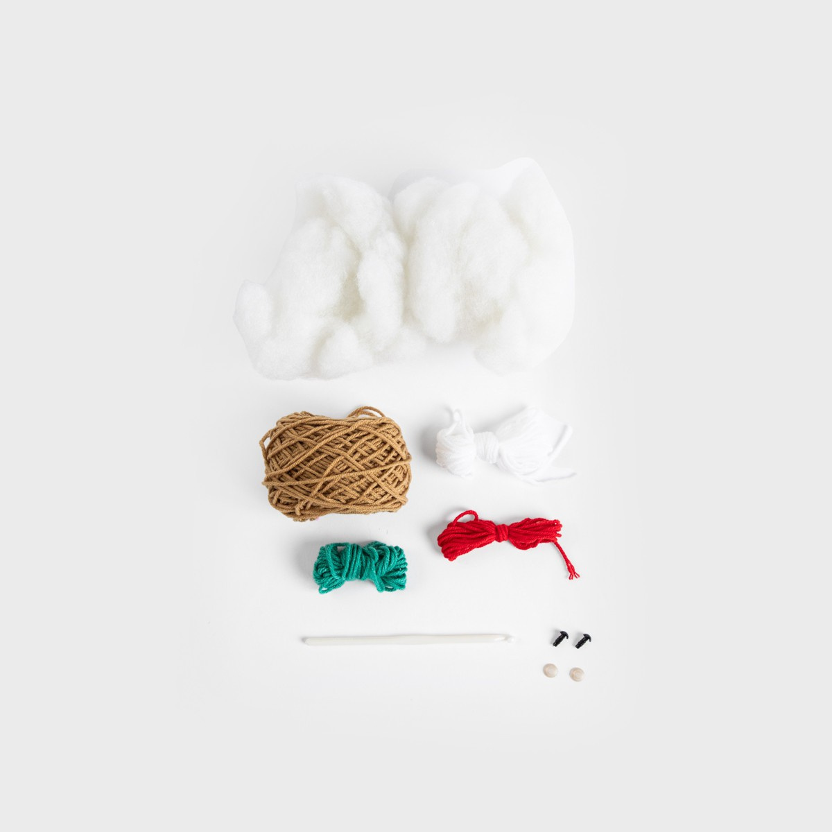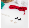 Sada obsahuje přízi, výplň a malé plastové části, stejně jako háček na háčkování.