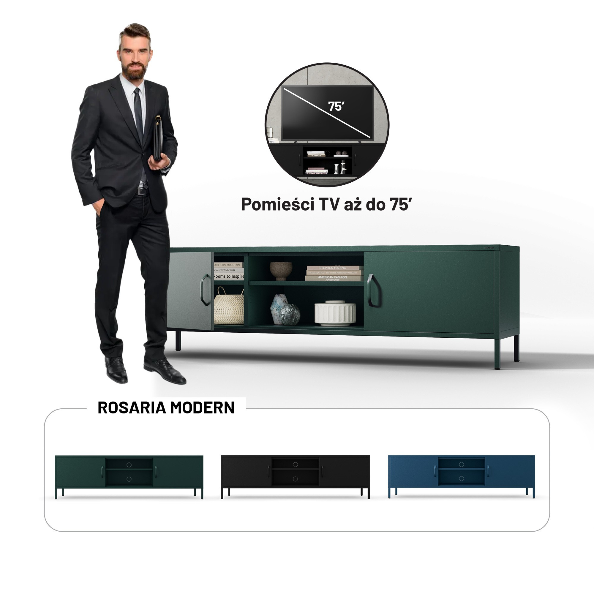 Nechte se okouzlit jedinečným designem a praktičností zelené TV skříňky XL ROSARIA. Tato skříňka je ideální volbou pro každého, kdo hledá elegantní a funkční řešení pro svůj obývací pokoj. Užijte si dokonalý pořádek a stylový vzhled s ROSARIA!